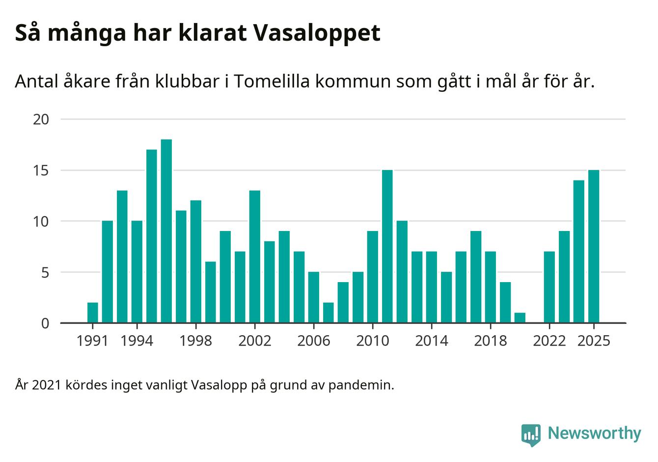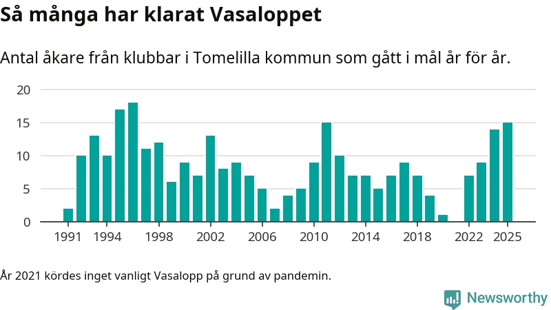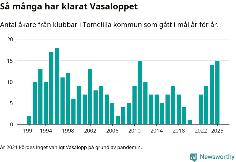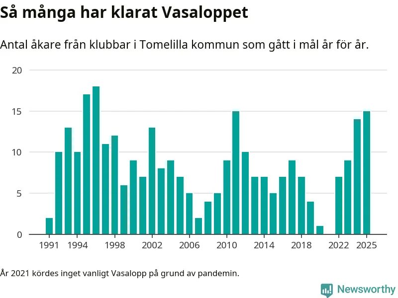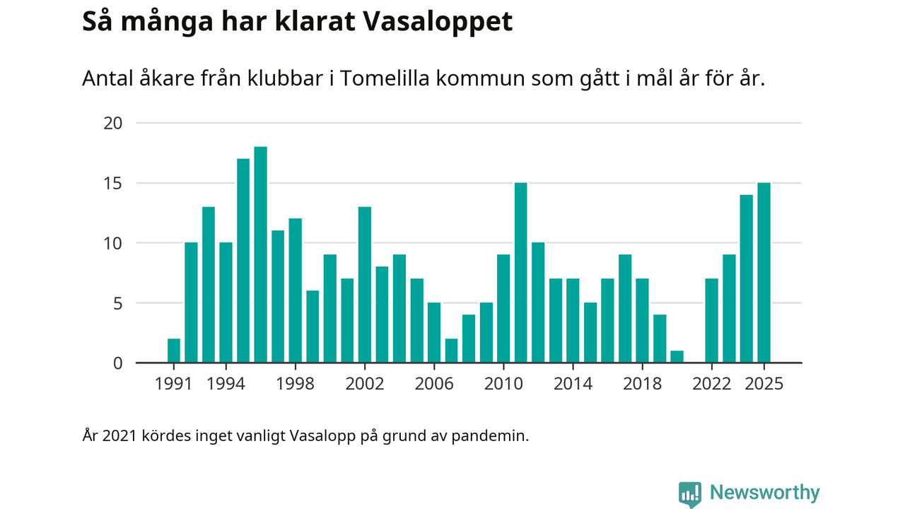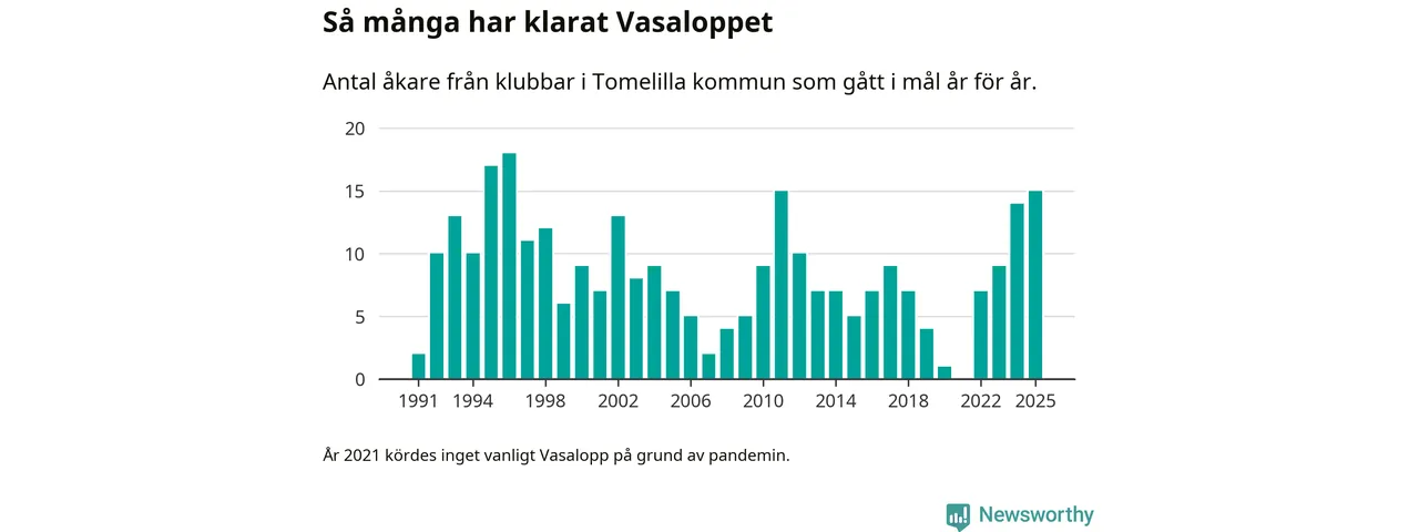 På söndag går starten för det 102:a Vasaloppet. Newsworthy har samlat in och sammanställt samtliga Vasaloppsresultat sedan 1991. Det ger en unik bild av hur skidåkare från klubbar i Tomelilla kommun har klarat sig genom åren.