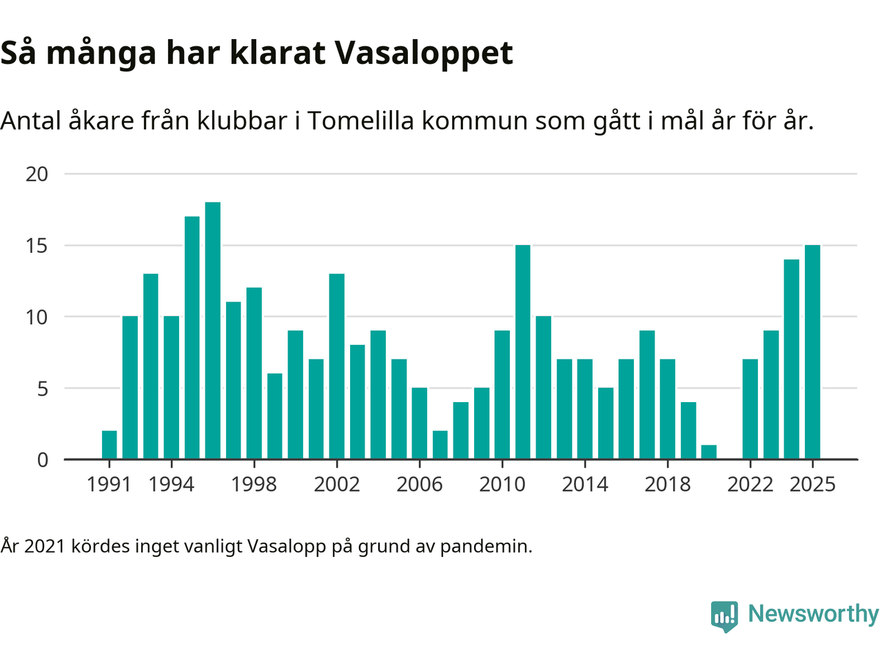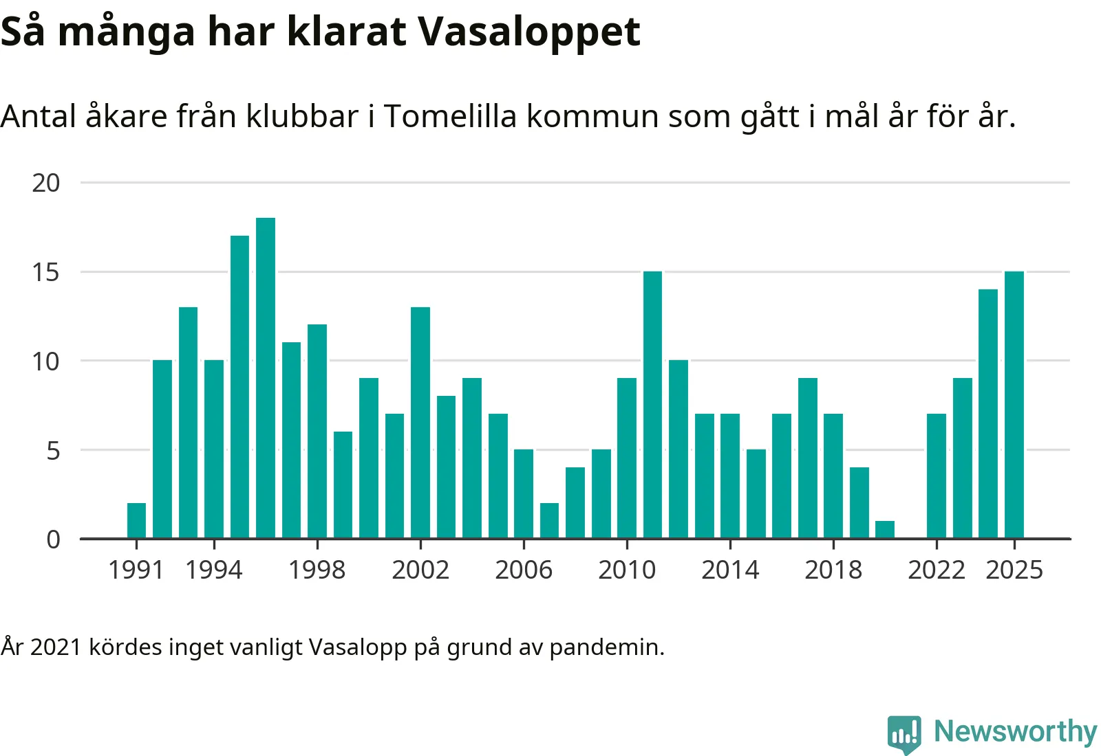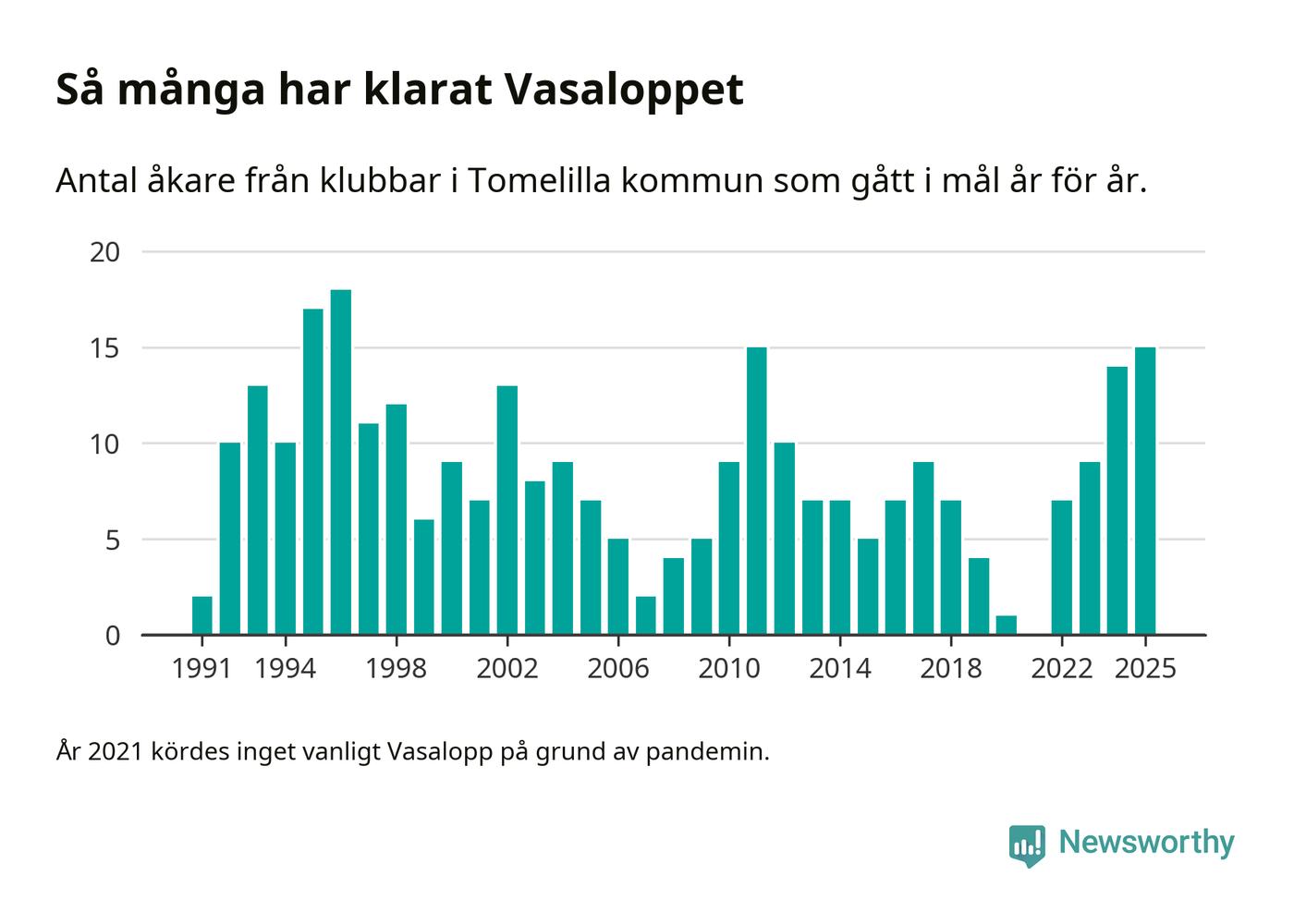 På söndag går starten för det 102:a Vasaloppet. Newsworthy har samlat in och sammanställt samtliga Vasaloppsresultat sedan 1991. Det ger en unik bild av hur skidåkare från klubbar i Tomelilla kommun har klarat sig genom åren.