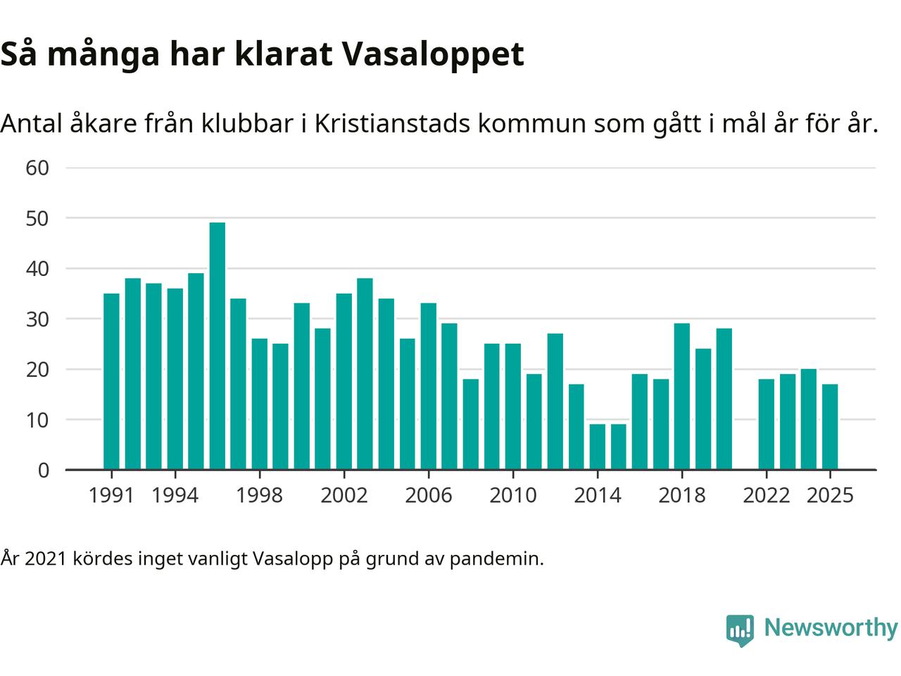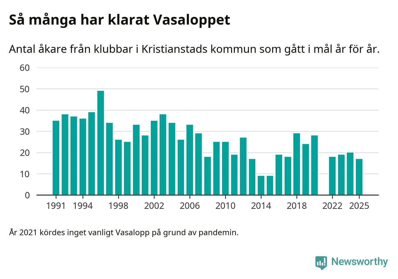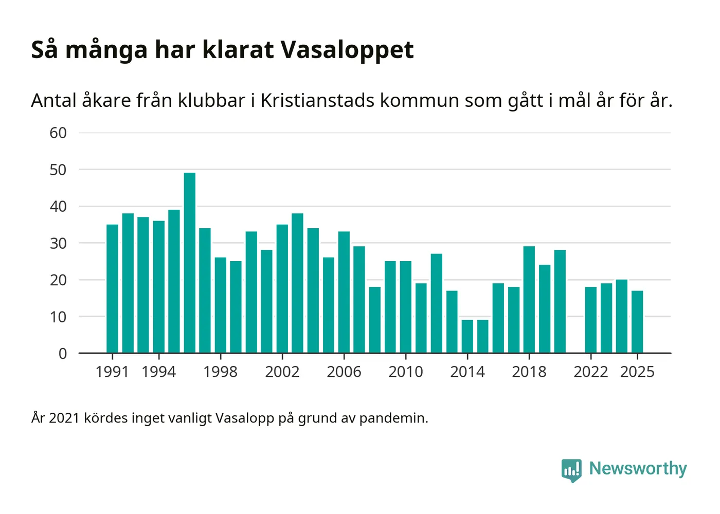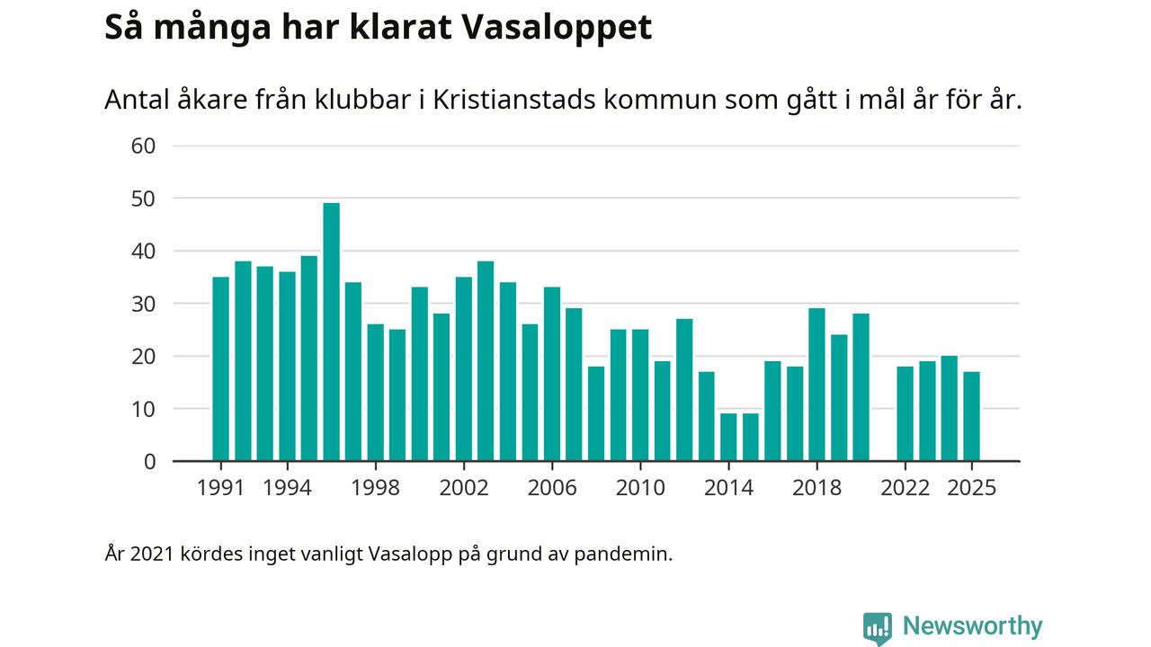 På söndag går starten för det 102:a Vasaloppet. Newsworthy har samlat in och sammanställt samtliga Vasaloppsresultat sedan 1991. Det ger en unik bild av hur skidåkare från klubbar i Kristianstads kommun har klarat sig genom åren.