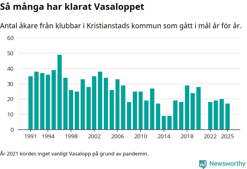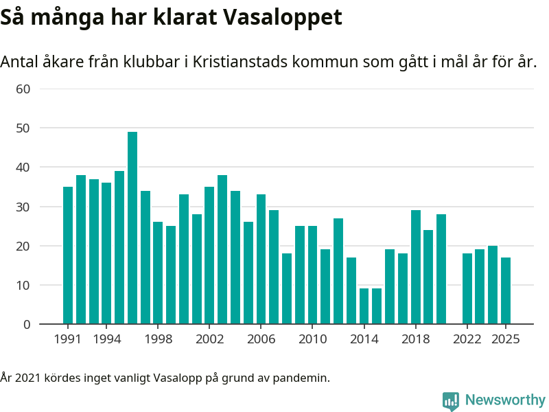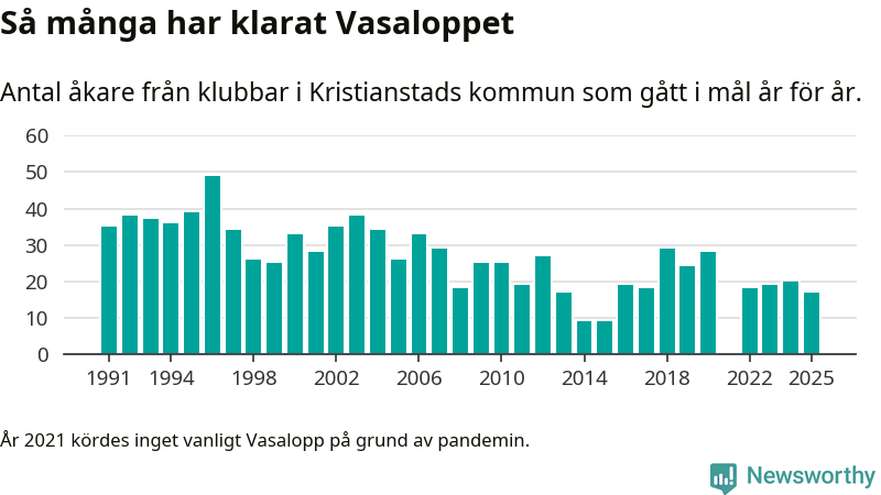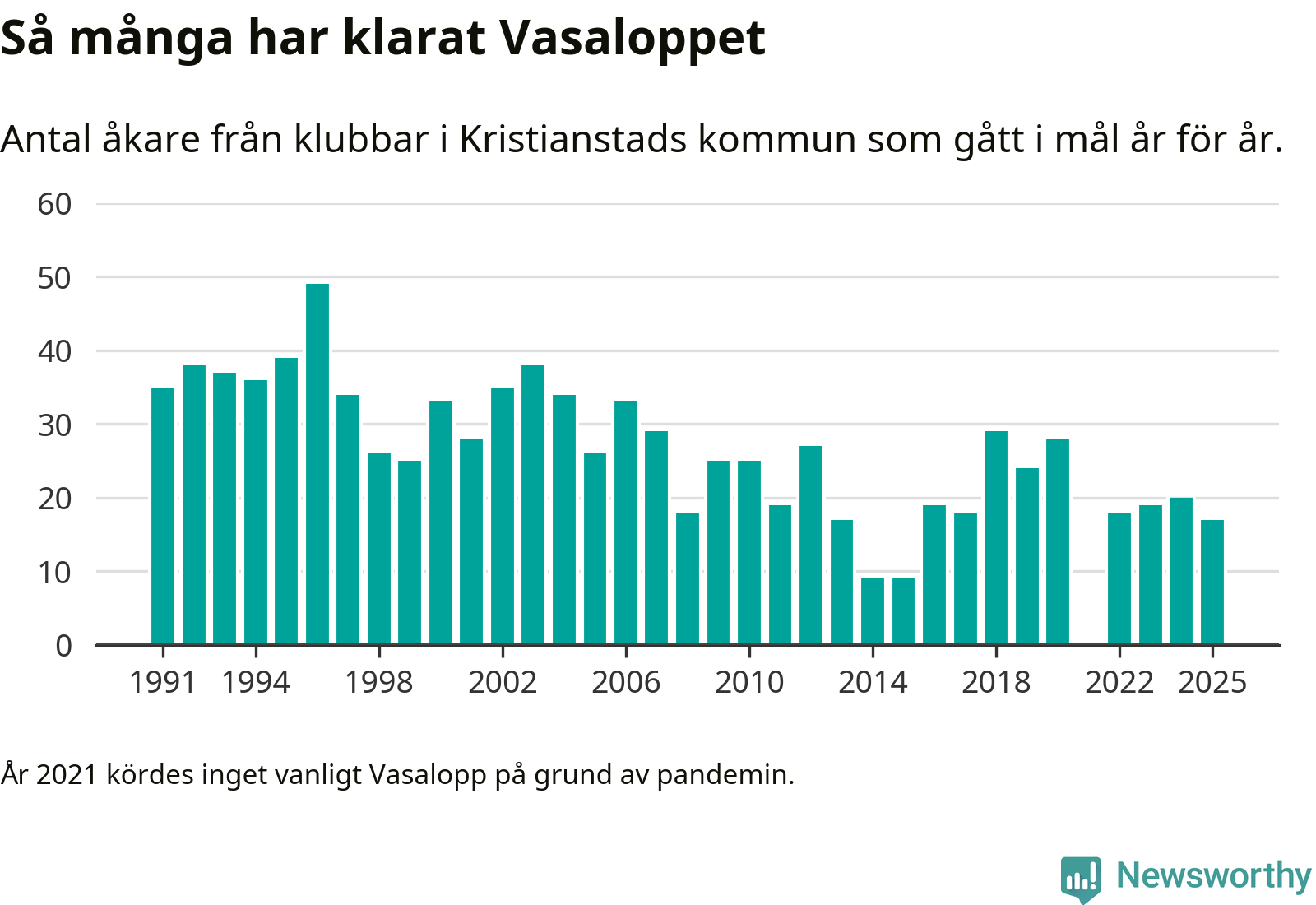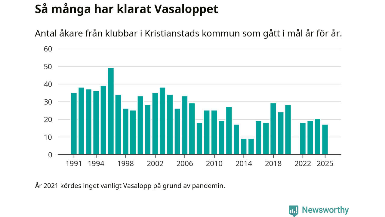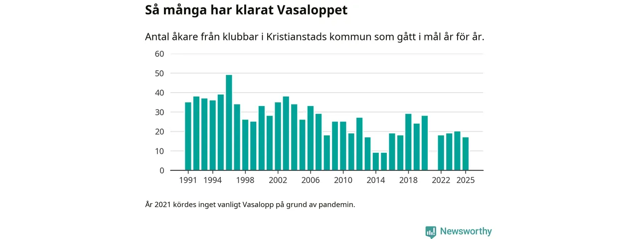 På söndag går starten för det 102:a Vasaloppet. Newsworthy har samlat in och sammanställt samtliga Vasaloppsresultat sedan 1991. Det ger en unik bild av hur skidåkare från klubbar i Kristianstads kommun har klarat sig genom åren.