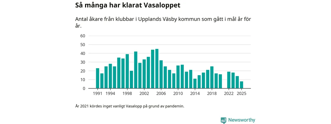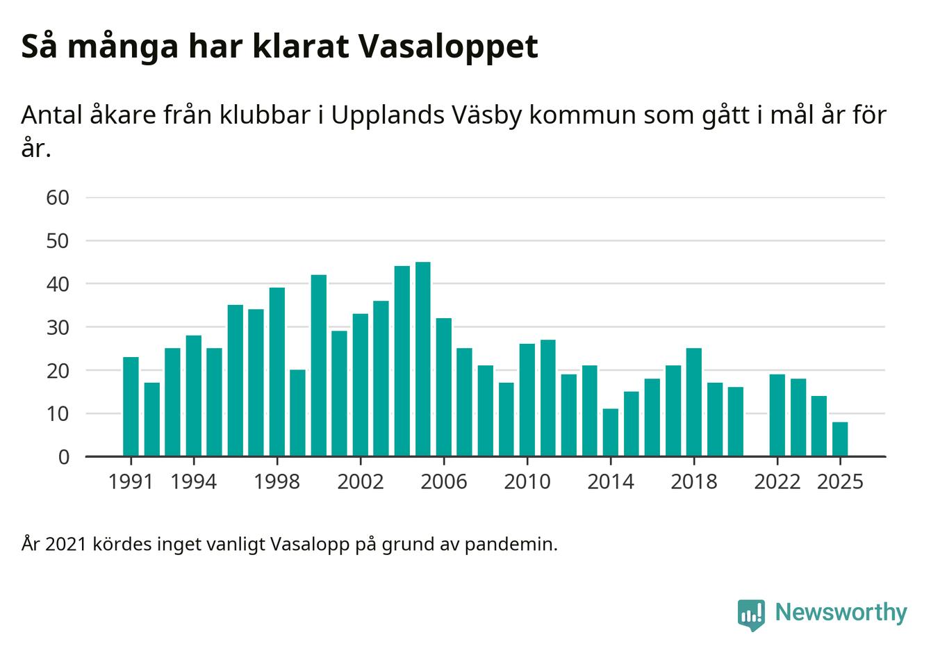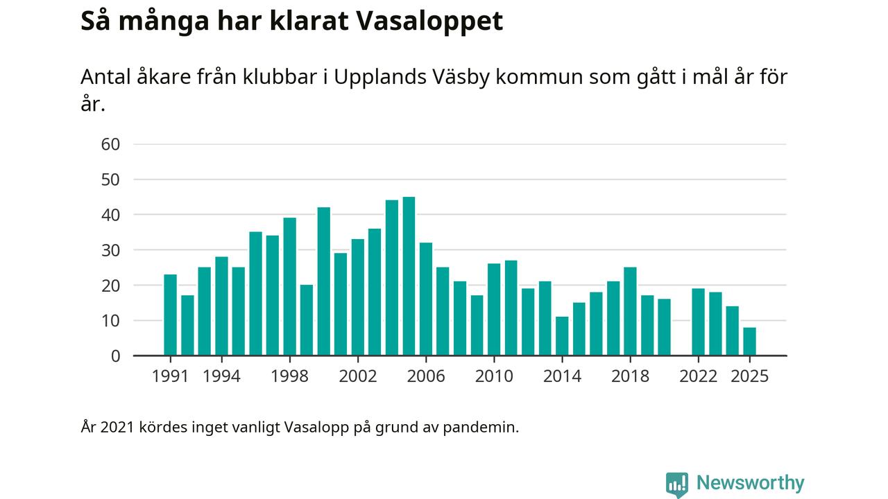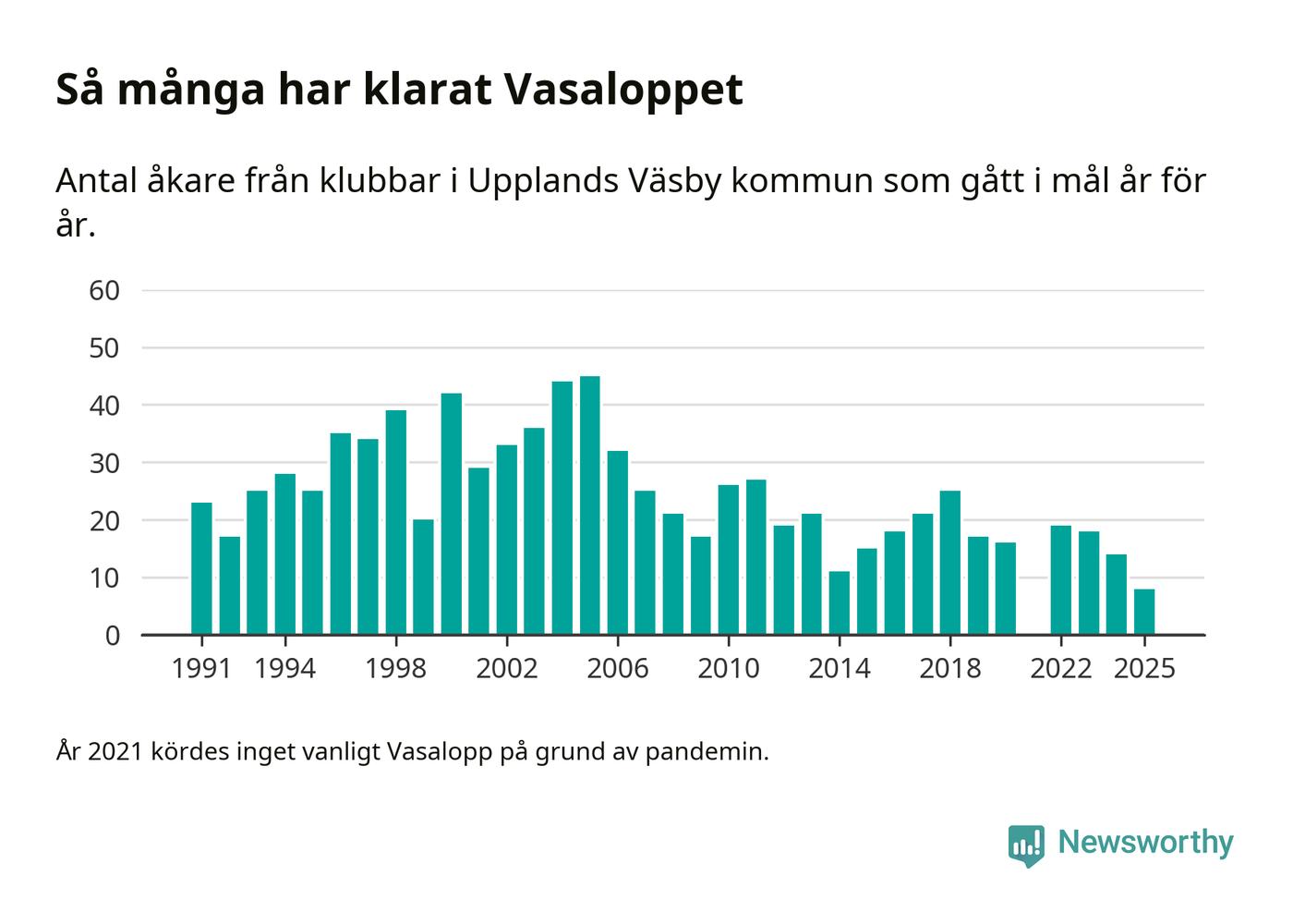 På söndag går starten för det 102:a Vasaloppet. Newsworthy har samlat in och sammanställt samtliga Vasaloppsresultat sedan 1991. Det ger en unik bild av hur skidåkare från klubbar i Upplands Väsby kommun har klarat sig genom åren.