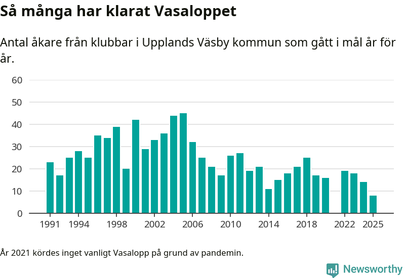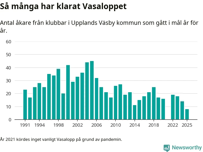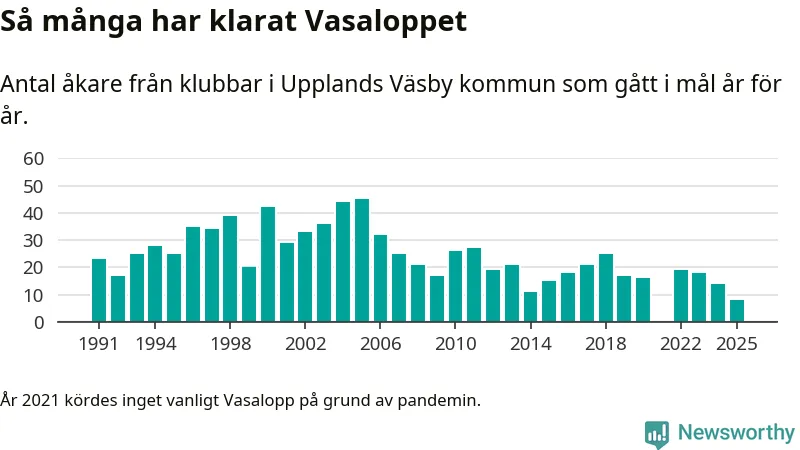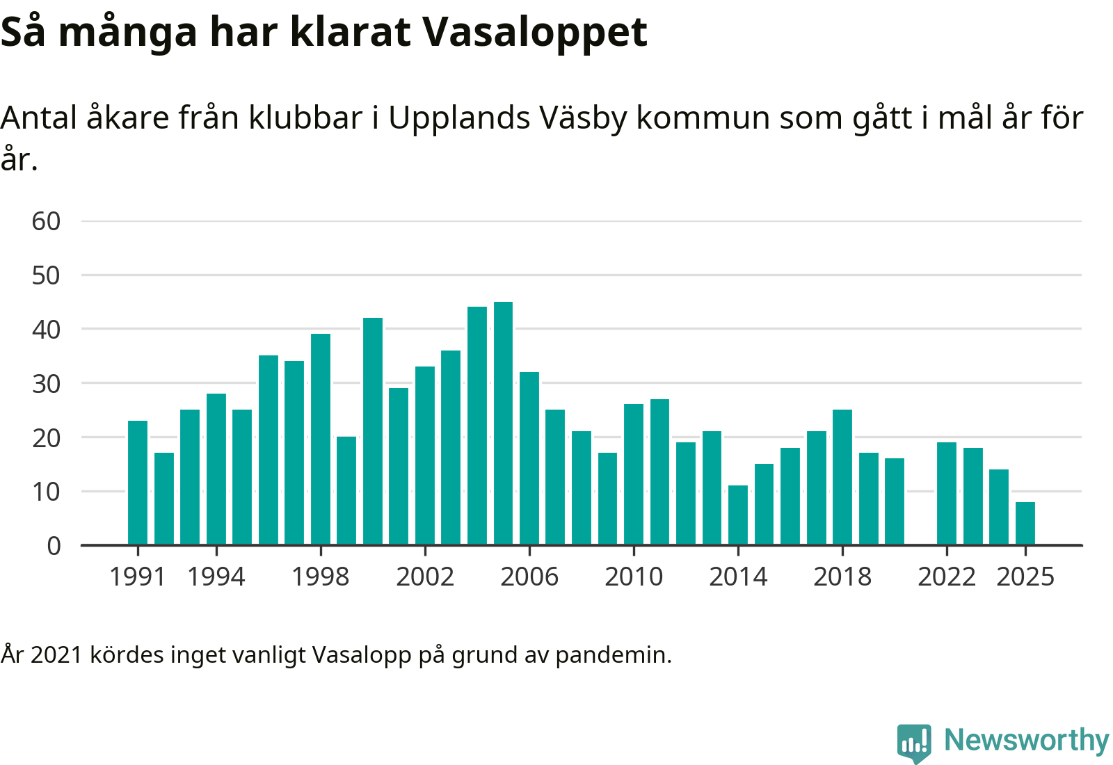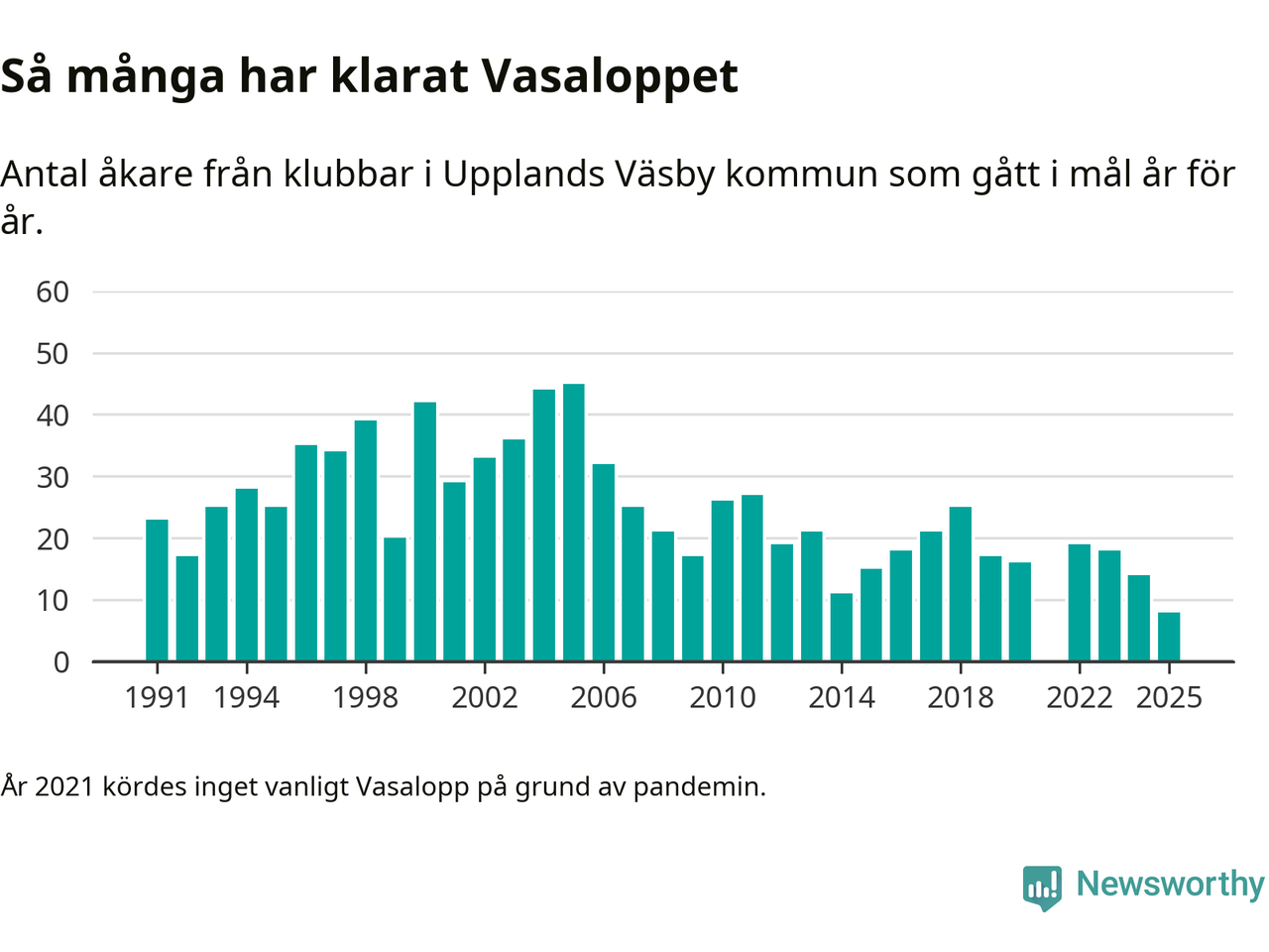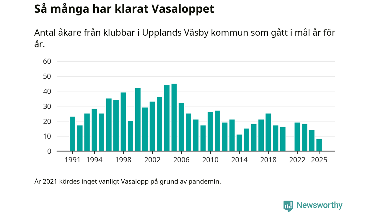 På söndag går starten för det 102:a Vasaloppet. Newsworthy har samlat in och sammanställt samtliga Vasaloppsresultat sedan 1991. Det ger en unik bild av hur skidåkare från klubbar i Upplands Väsby kommun har klarat sig genom åren.