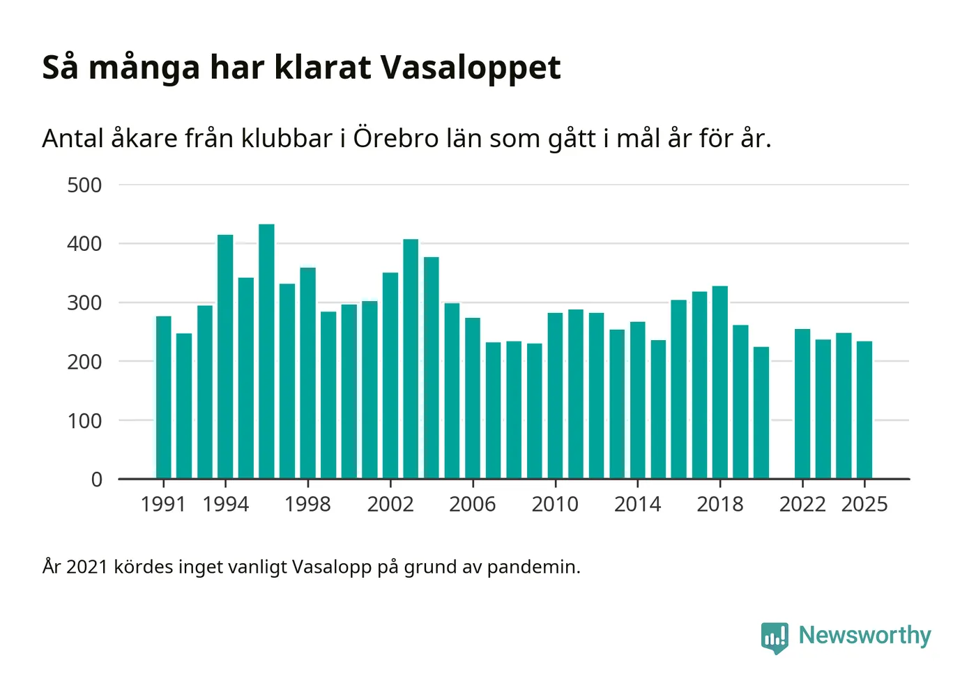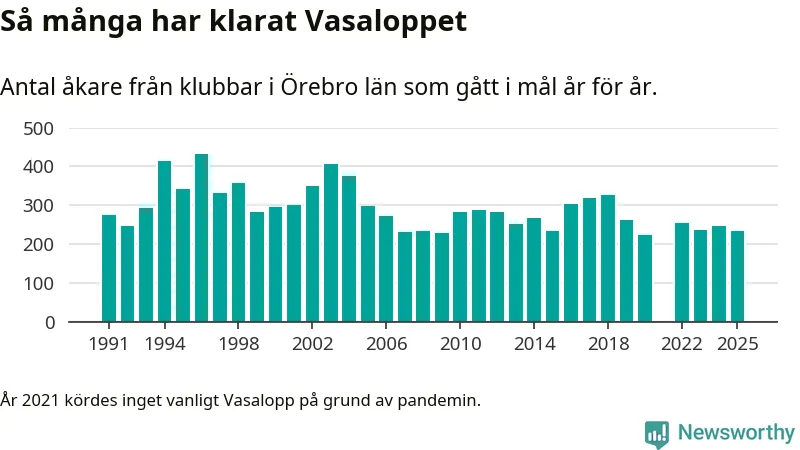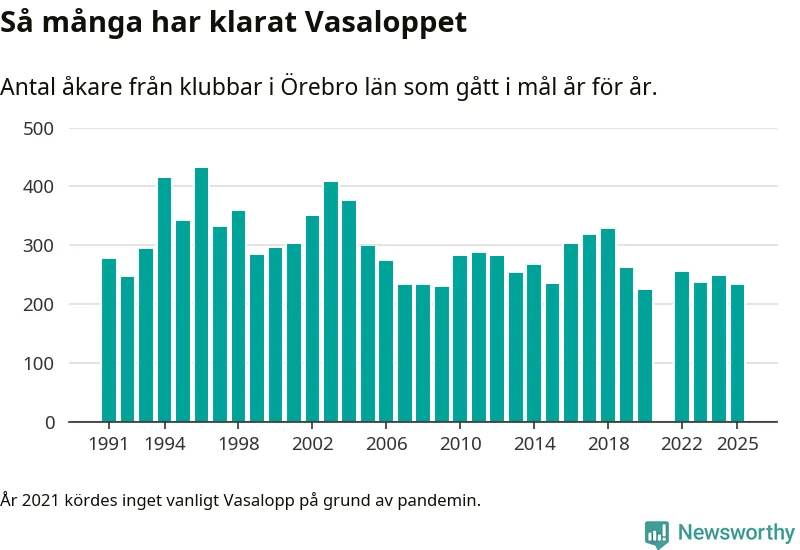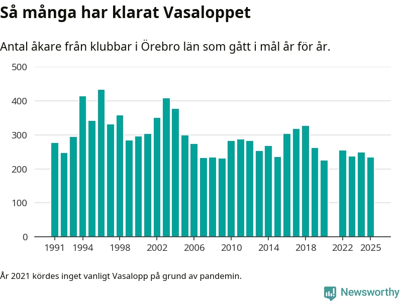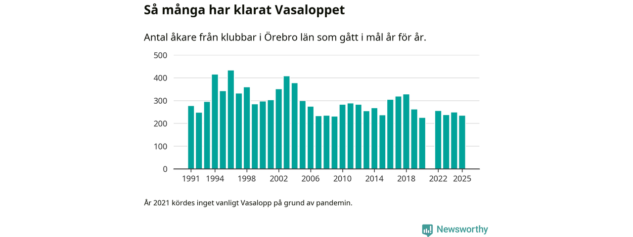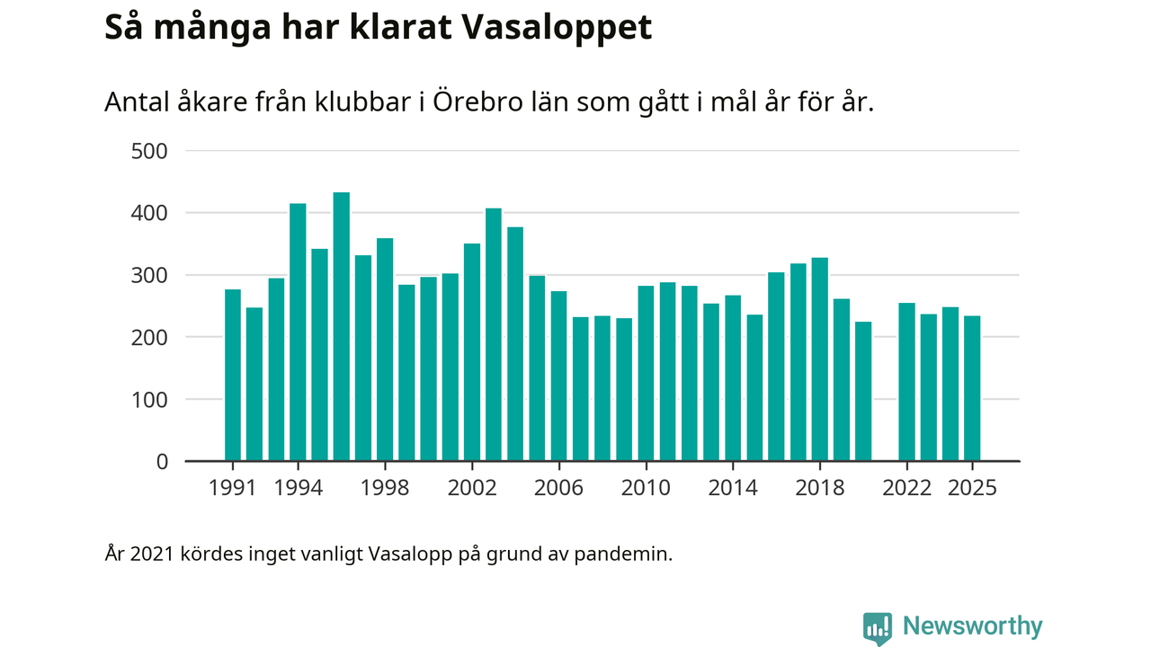På söndag går starten för det 102:a Vasaloppet. Newsworthy har samlat in och sammanställt samtliga Vasaloppsresultat sedan 1991. Det ger en unik bild av hur skidåkare från klubbar i Örebro län har klarat sig genom åren.