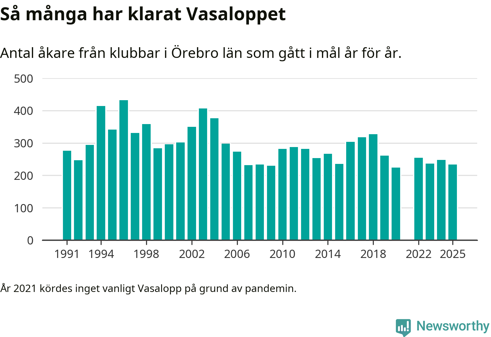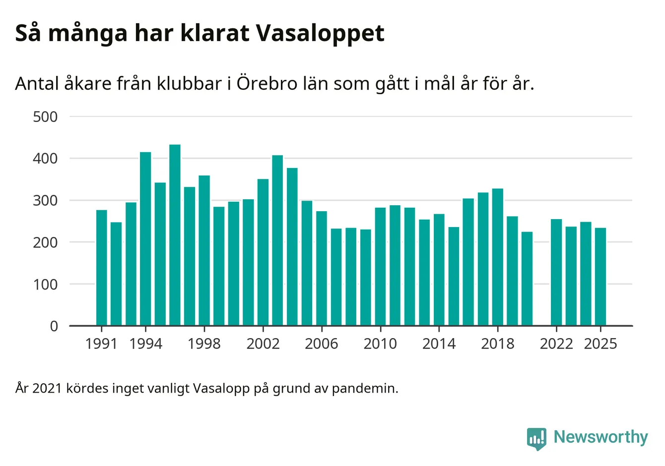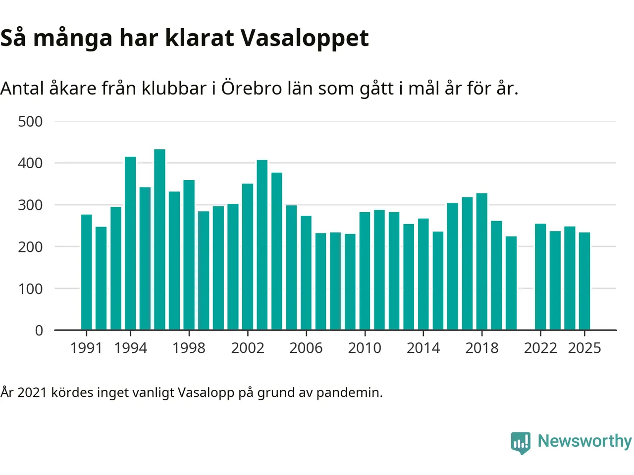 På söndag går starten för det 102:a Vasaloppet. Newsworthy har samlat in och sammanställt samtliga Vasaloppsresultat sedan 1991. Det ger en unik bild av hur skidåkare från klubbar i Örebro län har klarat sig genom åren.