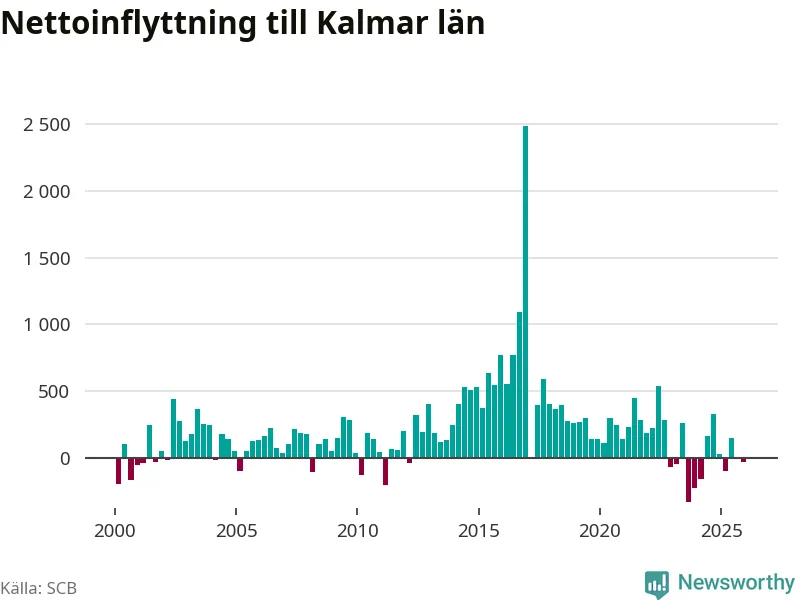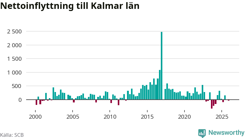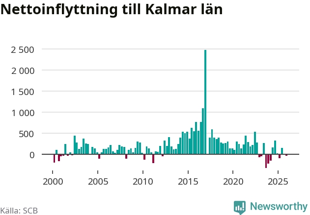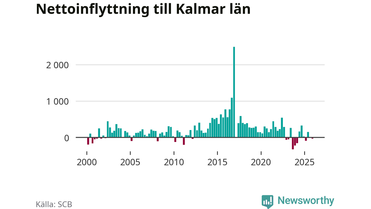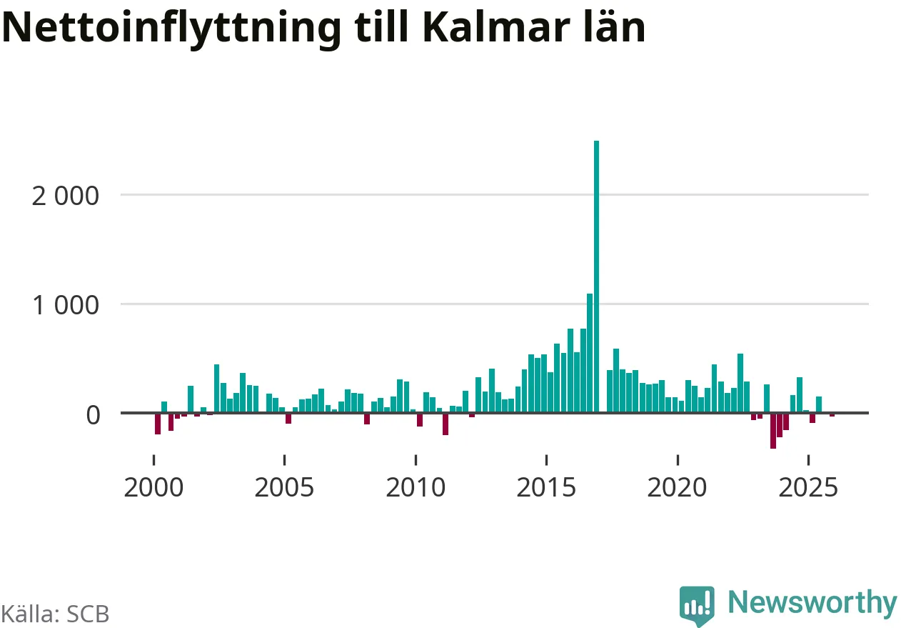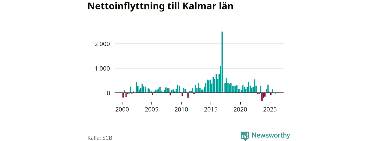 Under fjärde kvartalet 2025 flyttade 1 430 personer till länet medan 1 461 personer flyttade därifrån. Det är historiskt sett en liten inflyttning under ett kvartal. Sedan seklets början har Kalmar län haft ett positivt flyttnetto under nästan alla kvartal.