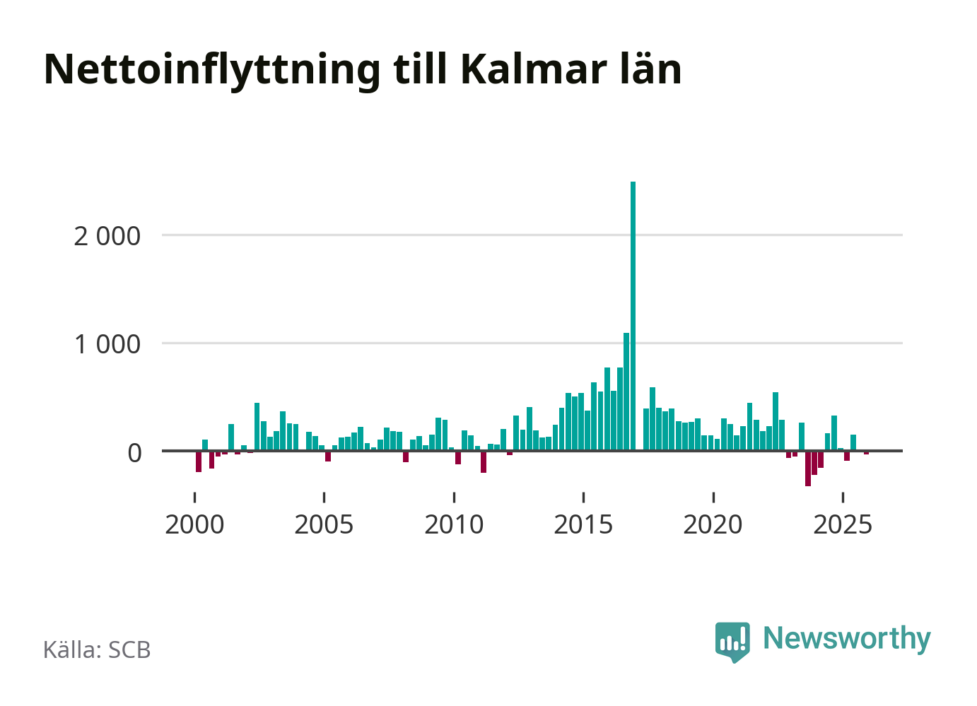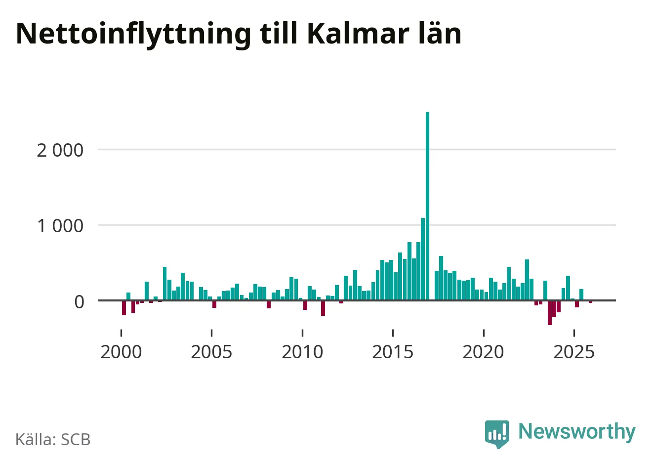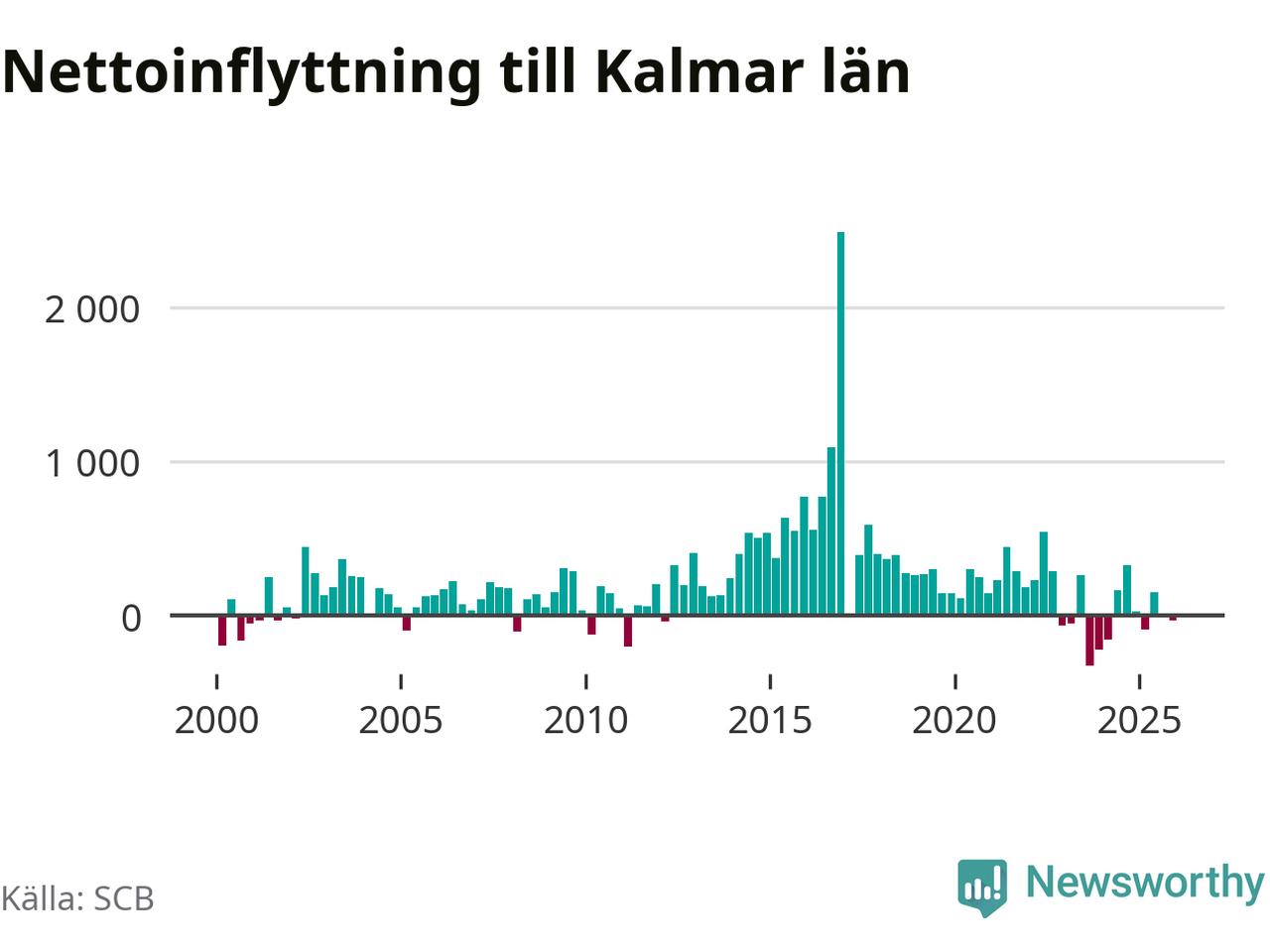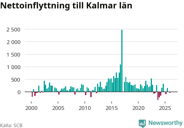 Under fjärde kvartalet 2025 flyttade 1 430 personer till länet medan 1 461 personer flyttade därifrån. Det är historiskt sett en liten inflyttning under ett kvartal. Sedan seklets början har Kalmar län haft ett positivt flyttnetto under nästan alla kvartal.