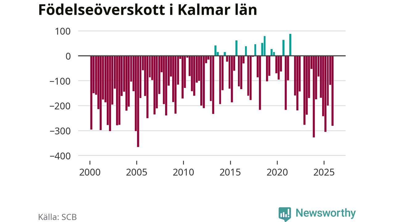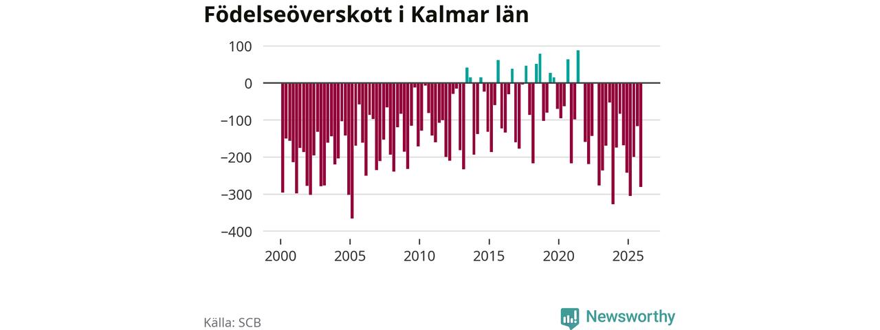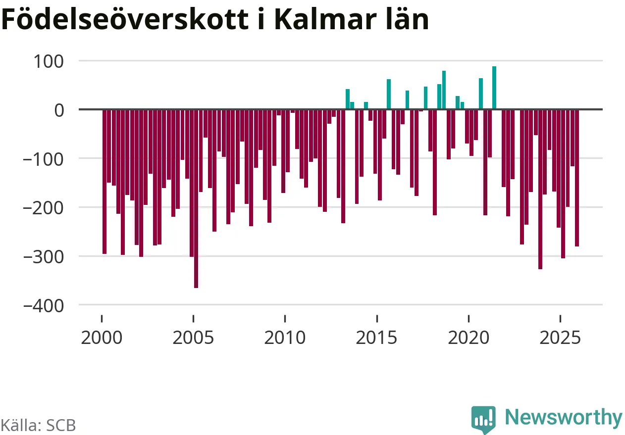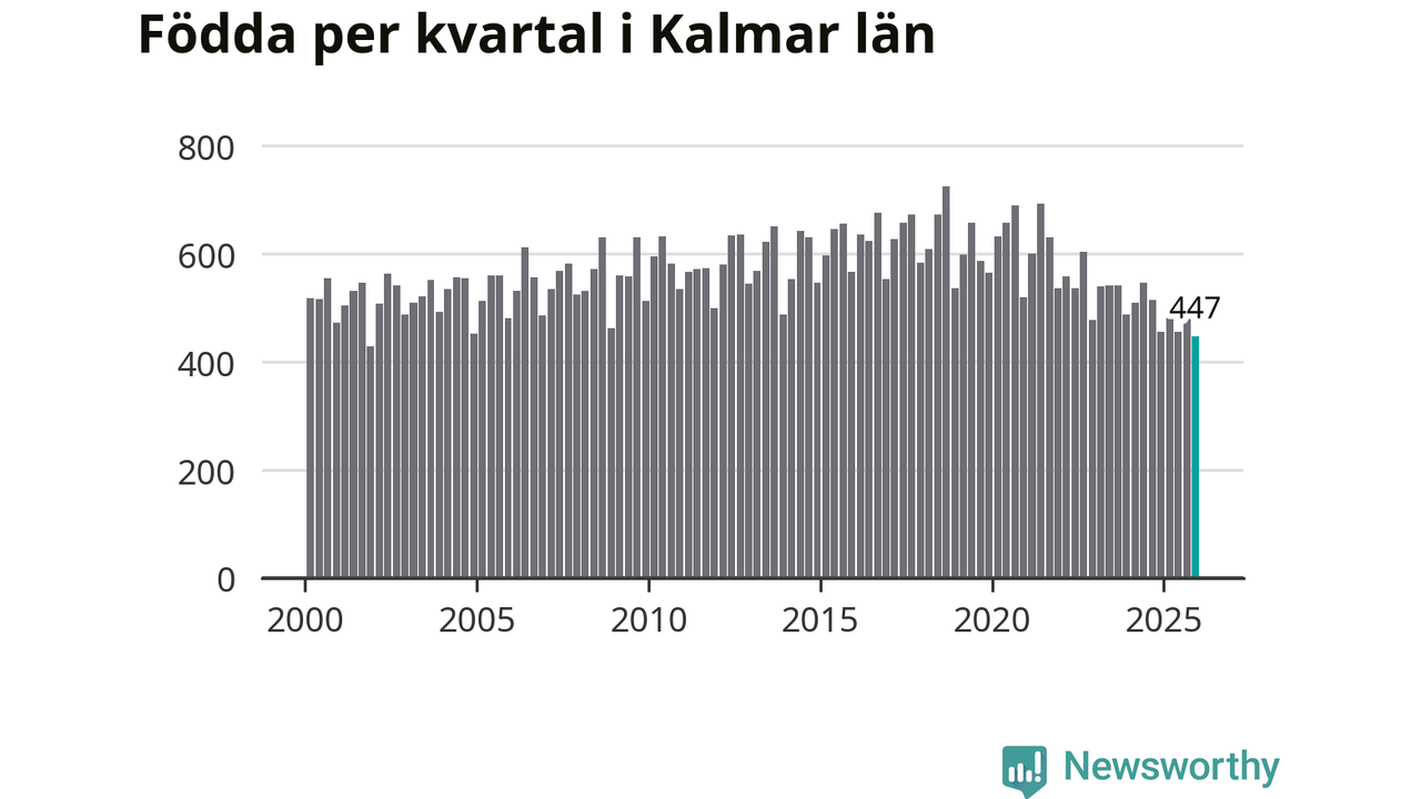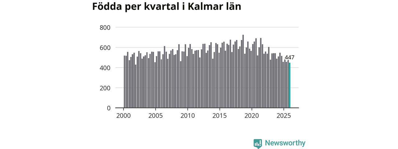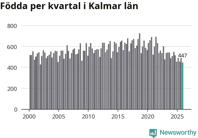 Enligt SCB:s siffror föddes 447 barn i Kalmar län under det senaste kvartalet. Samtidigt avled 728 personer. Kalmar hade alltså ett negativt födelsenetto, vilket länet historiskt sett oftast har haft.