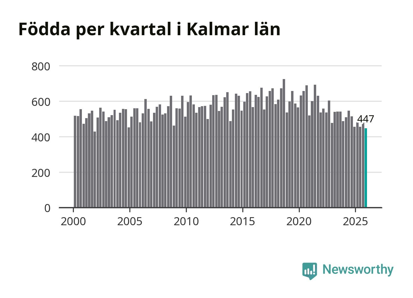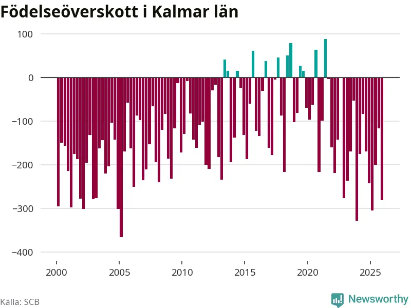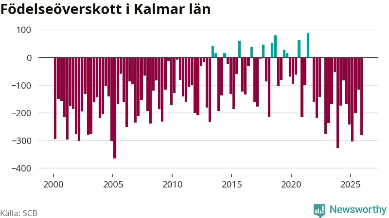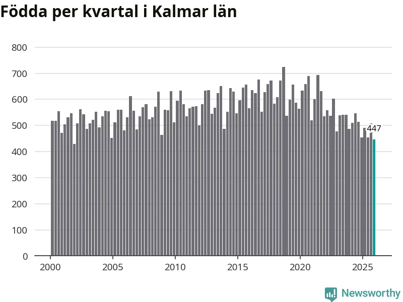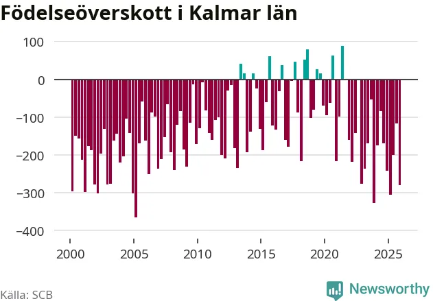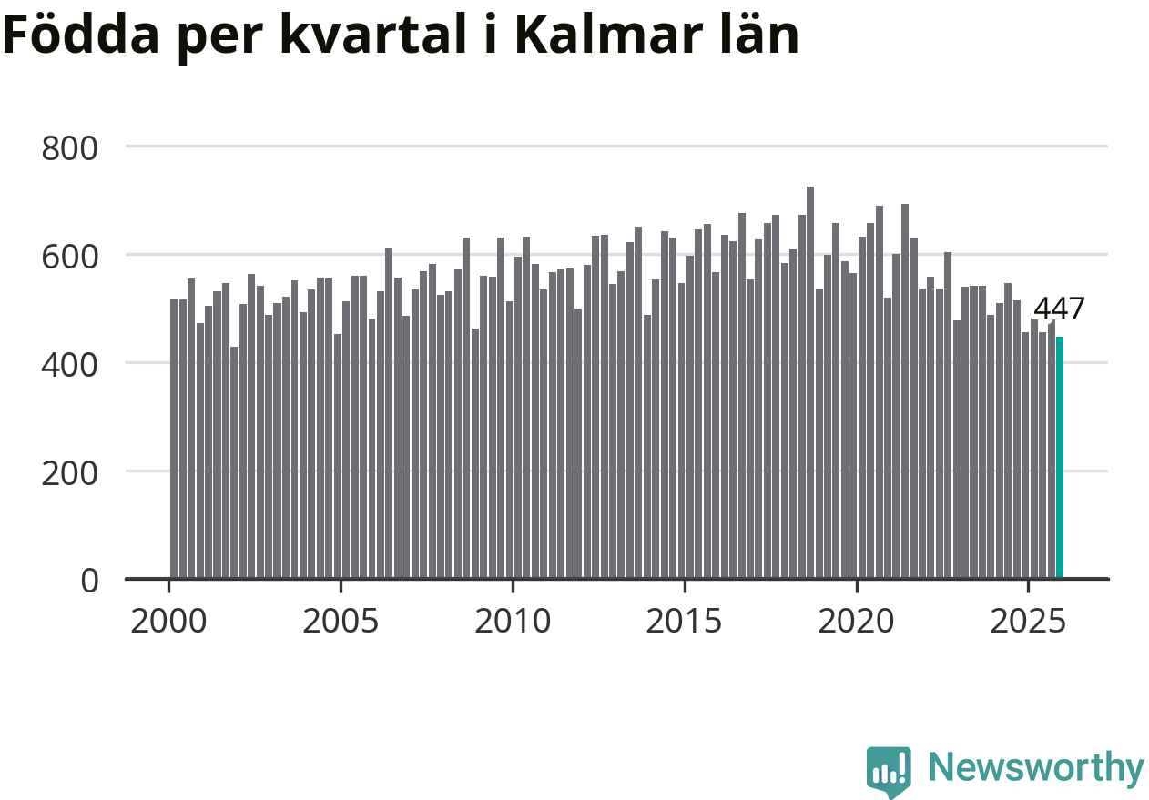 Enligt SCB:s siffror föddes 447 barn i Kalmar län under det senaste kvartalet. Samtidigt avled 728 personer. Kalmar hade alltså ett negativt födelsenetto, vilket länet historiskt sett oftast har haft.