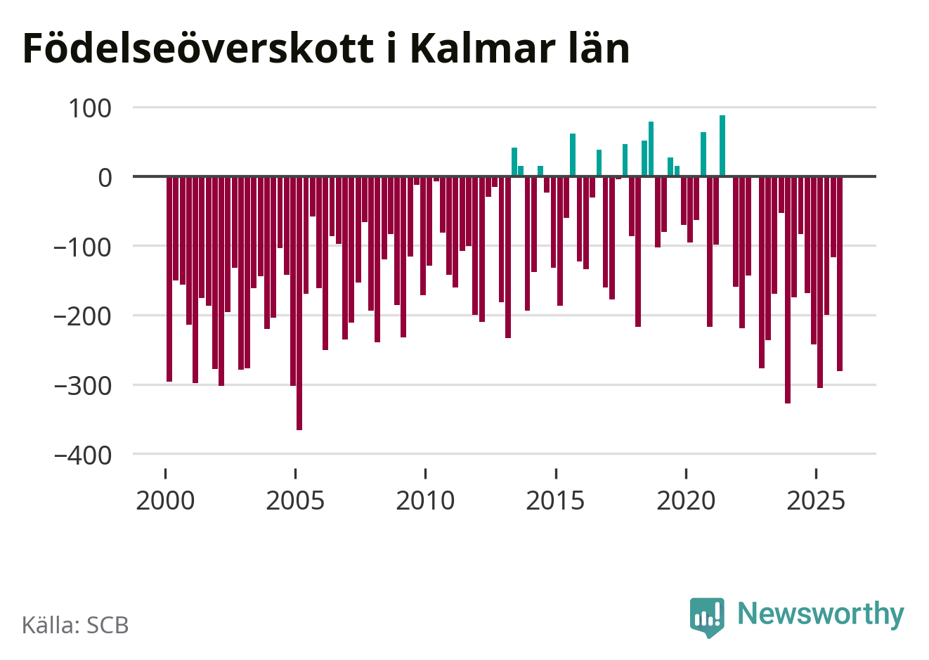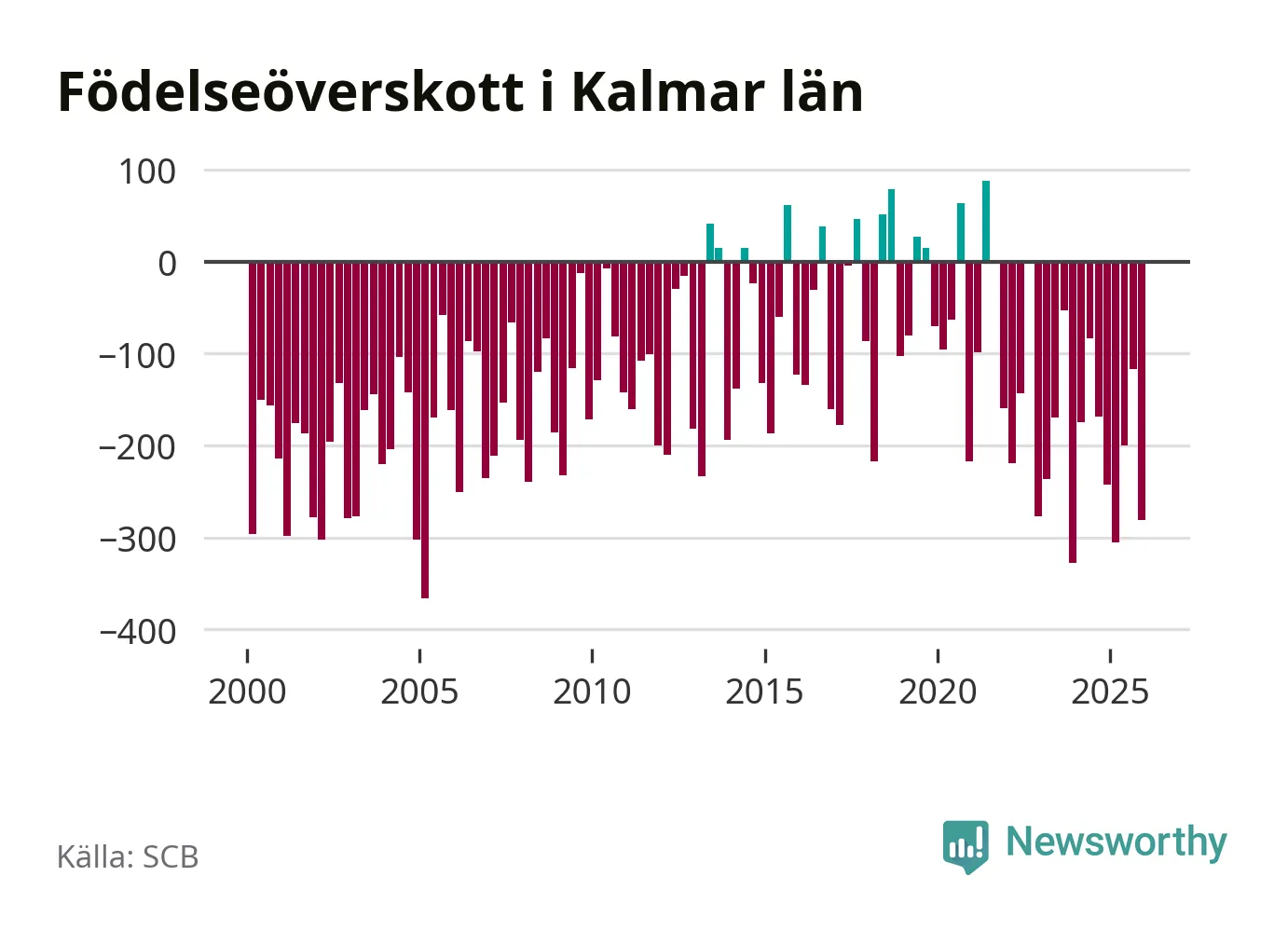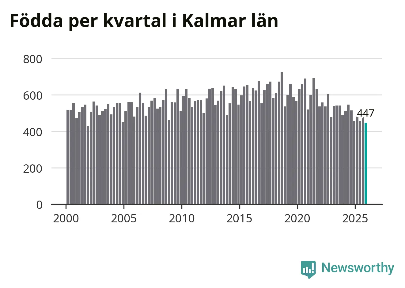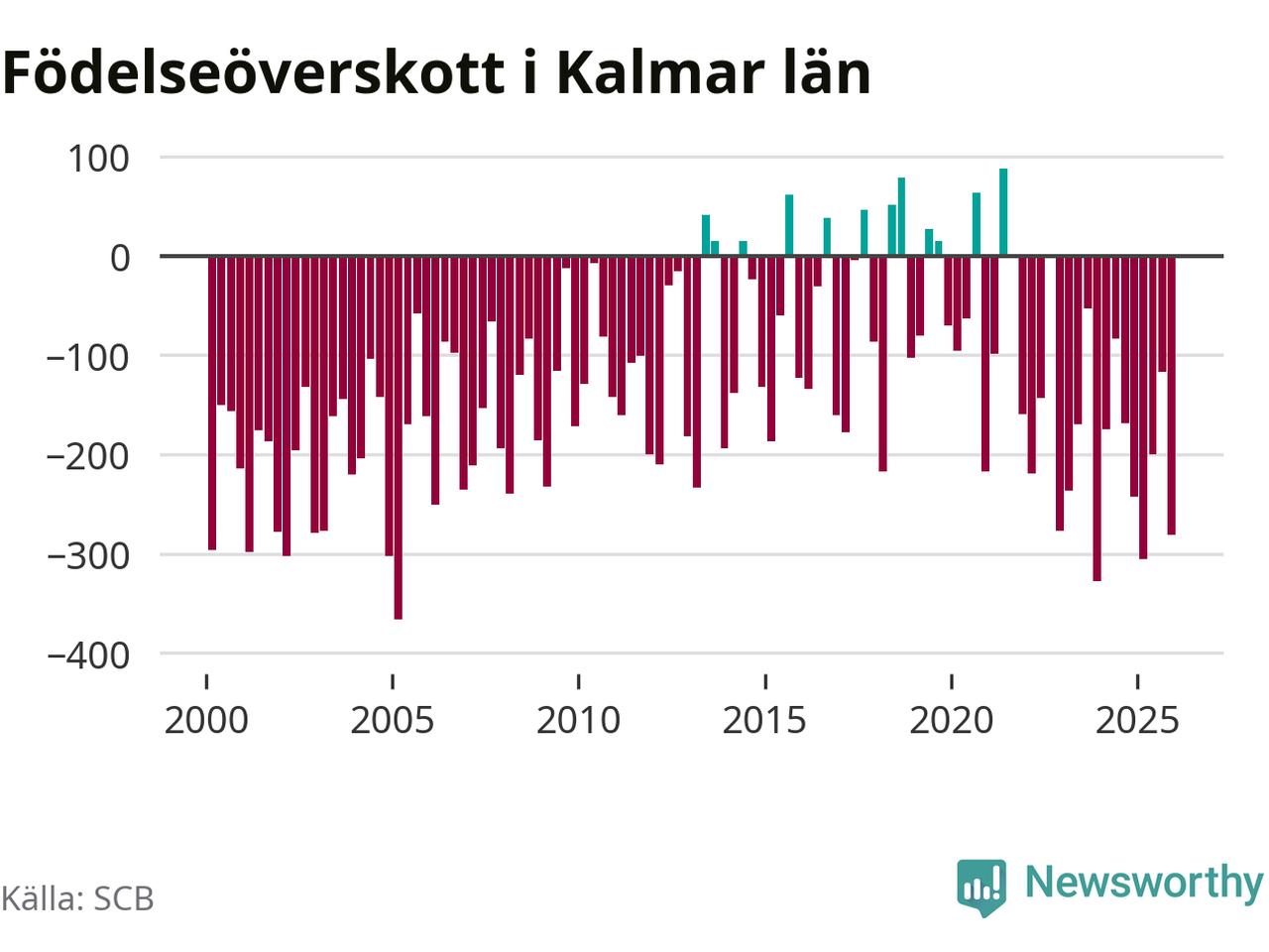 Enligt SCB:s siffror föddes 447 barn i Kalmar län under det senaste kvartalet. Samtidigt avled 728 personer. Kalmar hade alltså ett negativt födelsenetto, vilket länet historiskt sett oftast har haft.