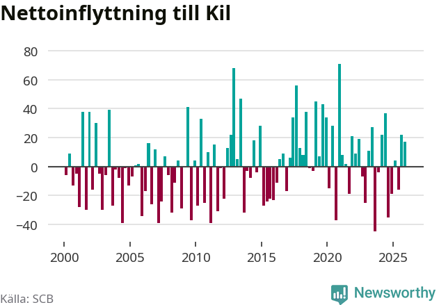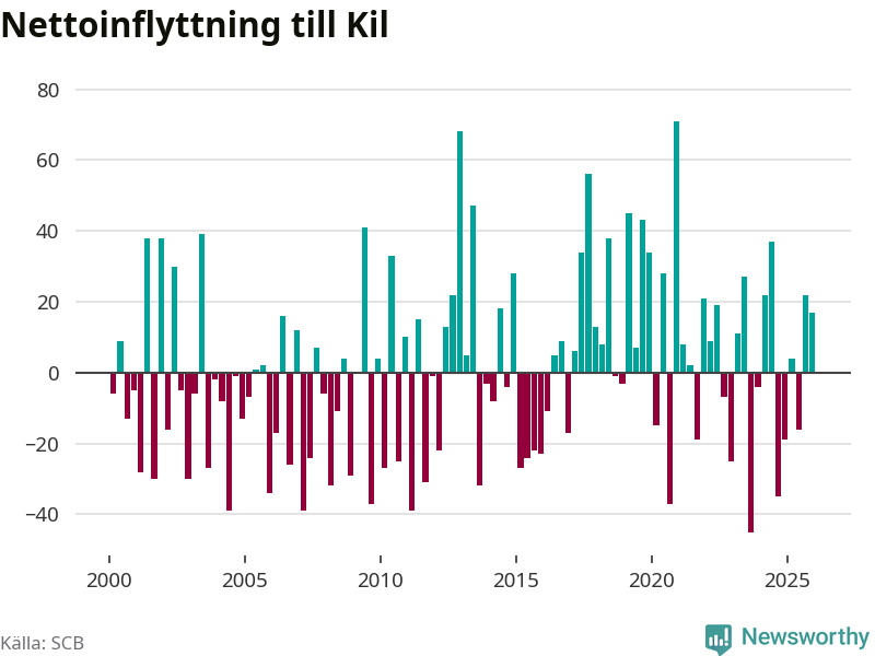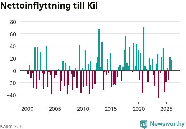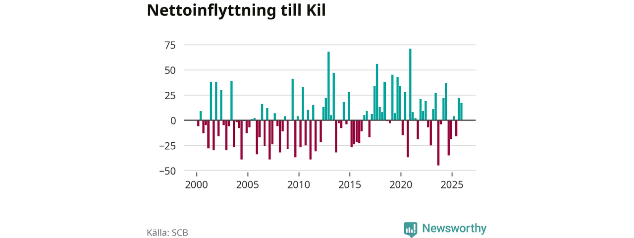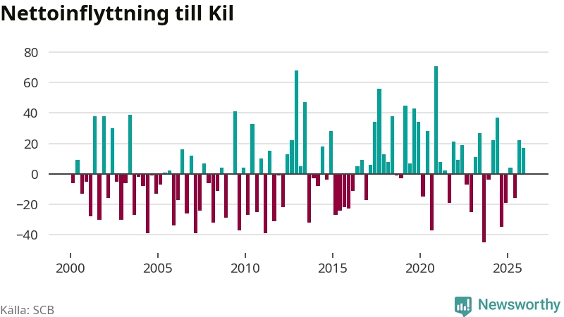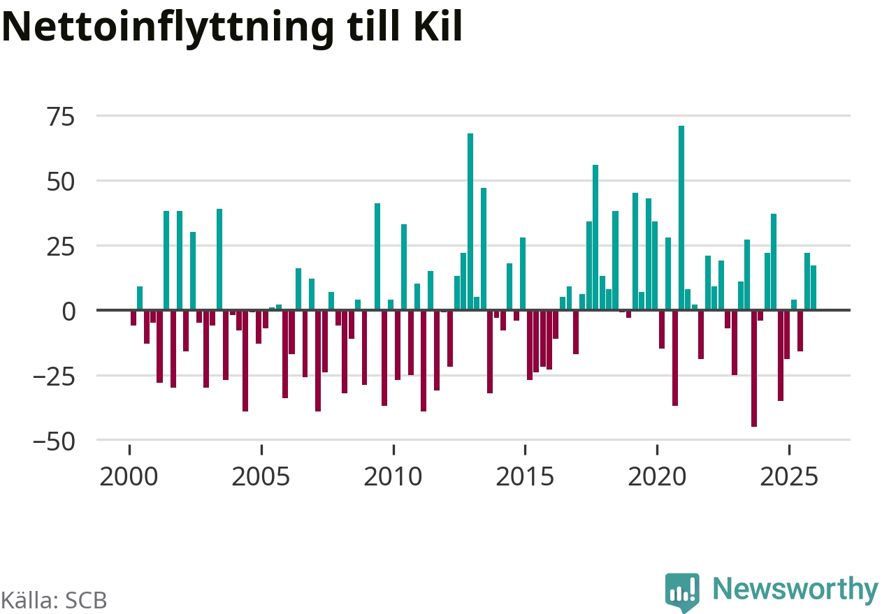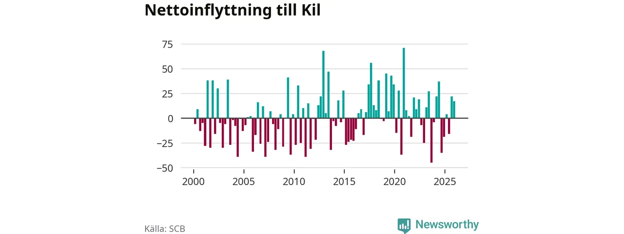 Under fjärde kvartalet 2025 flyttade 164 personer till kommunen medan 147 personer flyttade därifrån. Sedan seklets början har Kil oftast haft ett positivt flyttnetto, inklusive det senaste kvartalet.