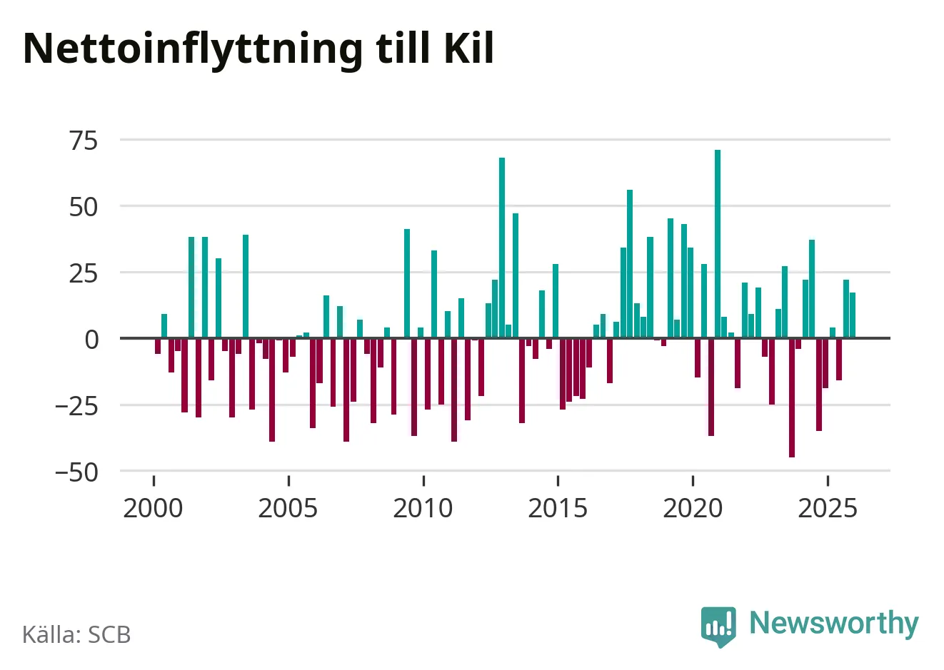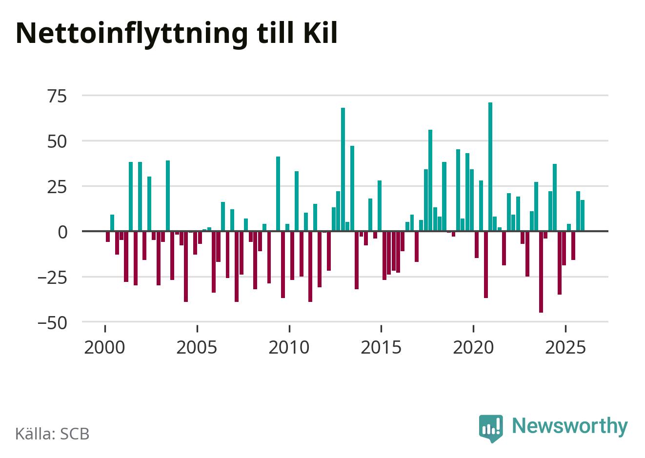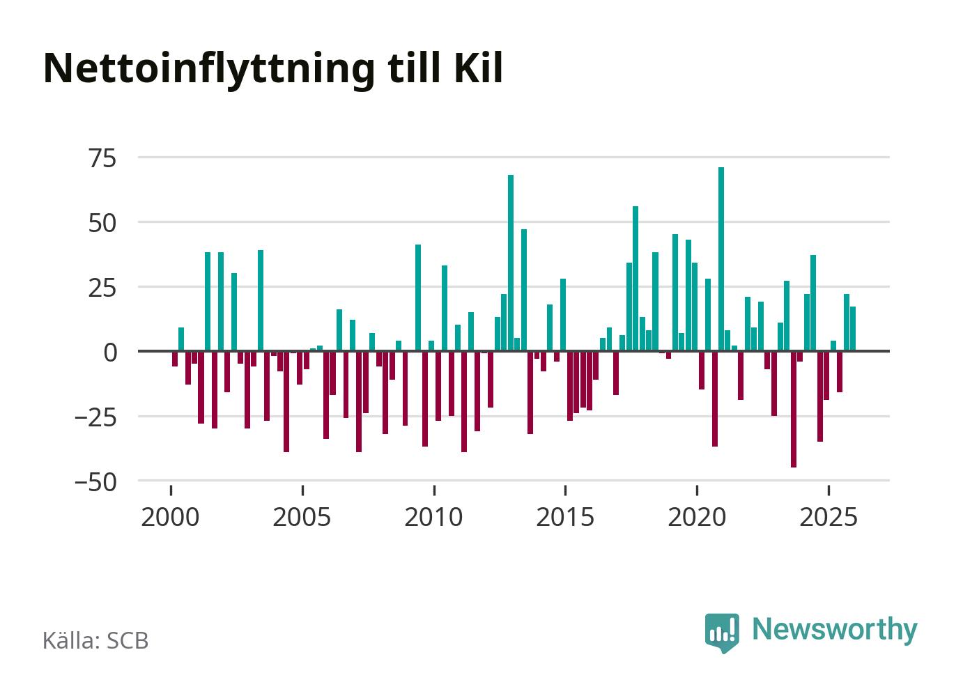 Under fjärde kvartalet 2025 flyttade 164 personer till kommunen medan 147 personer flyttade därifrån. Sedan seklets början har Kil oftast haft ett positivt flyttnetto, inklusive det senaste kvartalet.