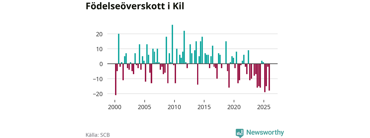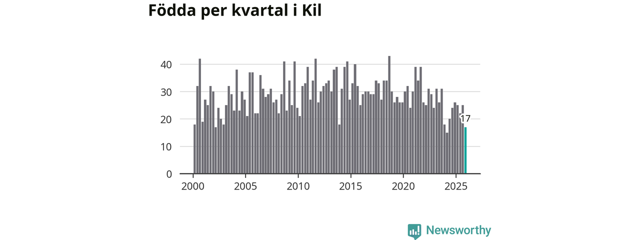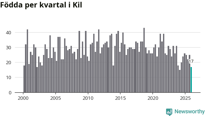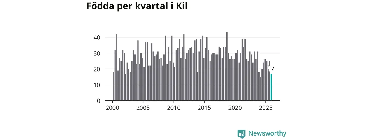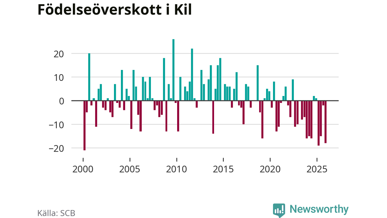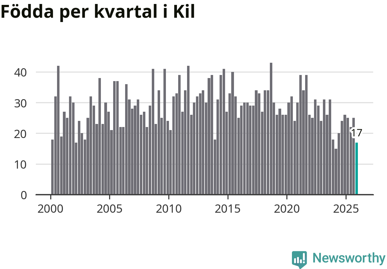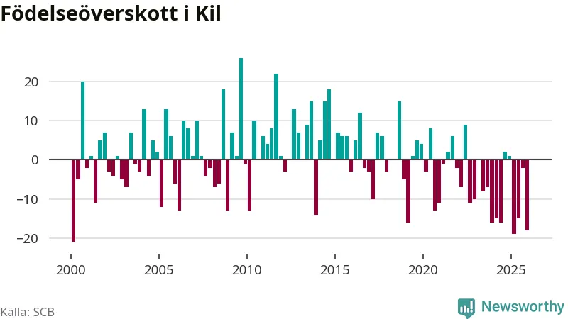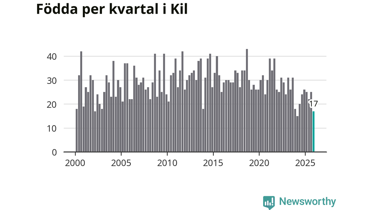 Enligt SCB:s siffror föddes 17 barn i Kil under det senaste kvartalet. Samtidigt avled 35 personer. Kil hade alltså ett negativt födelsenetto, vilket kommunen historiskt sett oftast har haft.