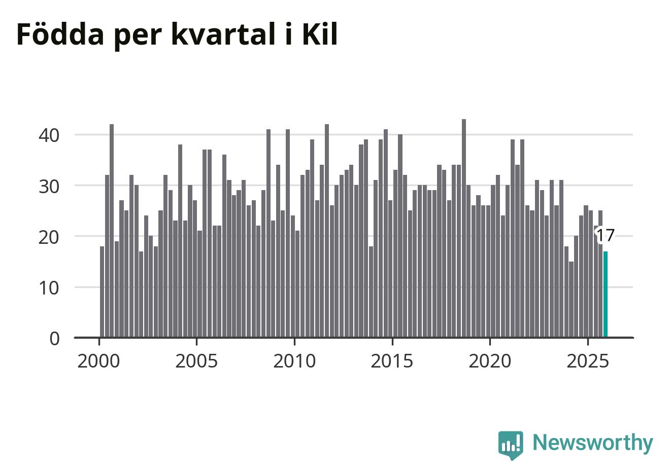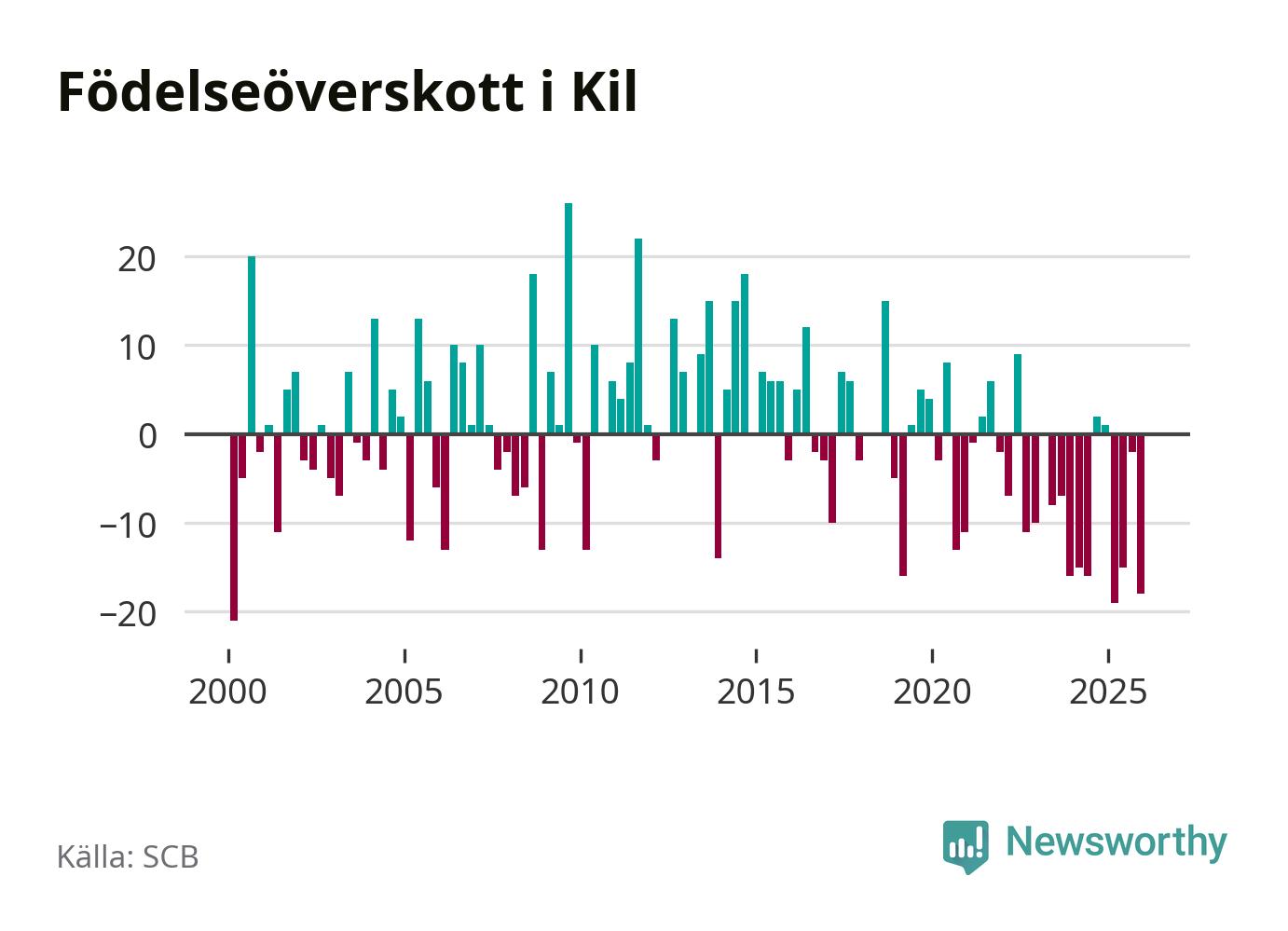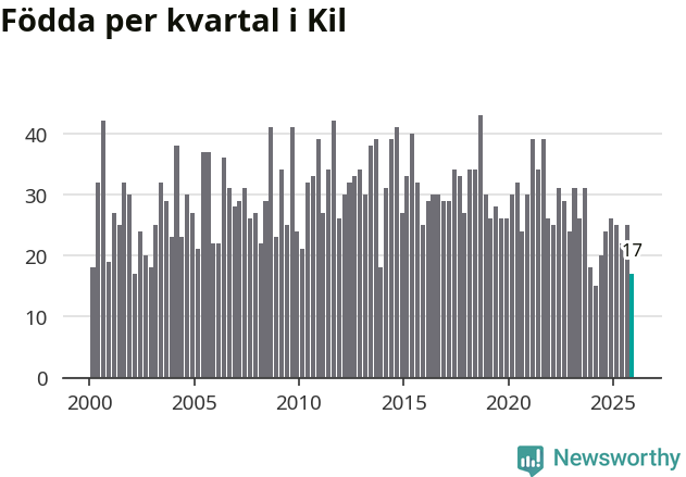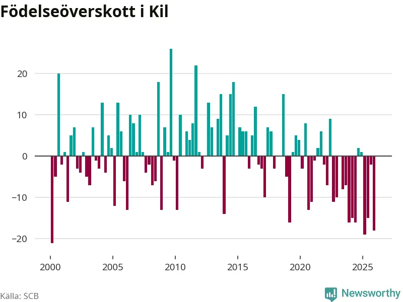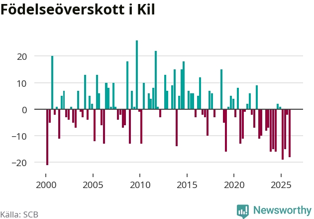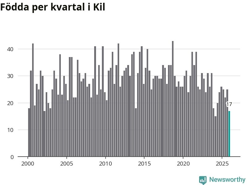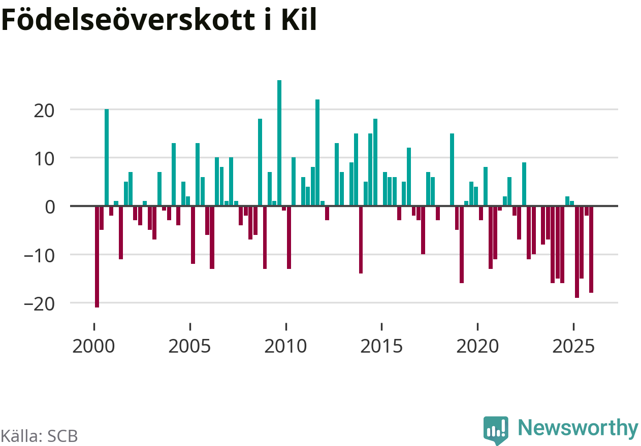 Enligt SCB:s siffror föddes 17 barn i Kil under det senaste kvartalet. Samtidigt avled 35 personer. Kil hade alltså ett negativt födelsenetto, vilket kommunen historiskt sett oftast har haft.