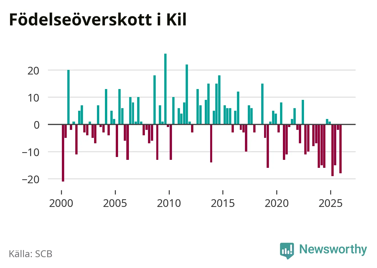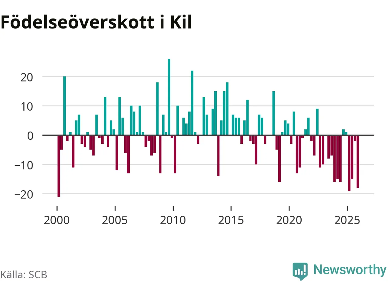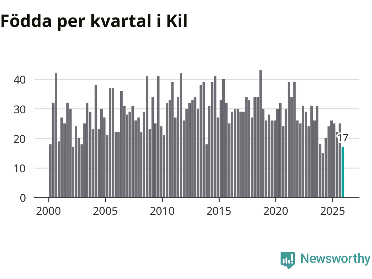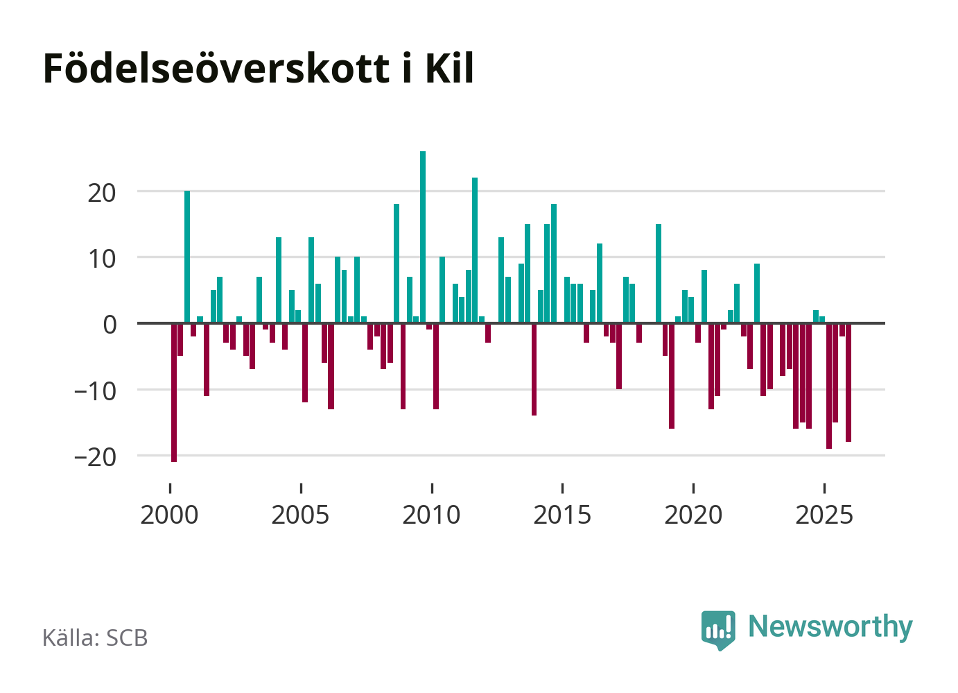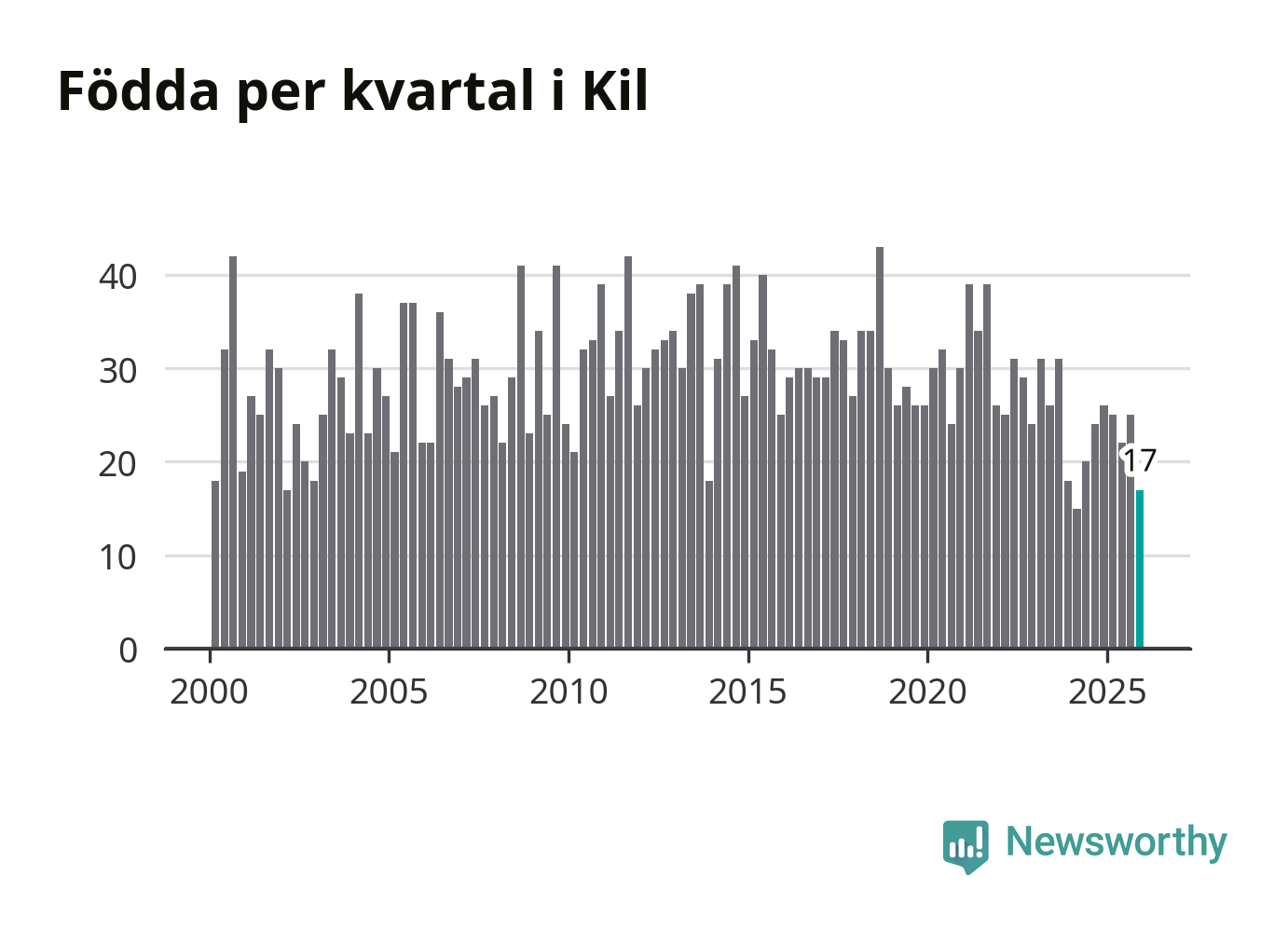 Enligt SCB:s siffror föddes 17 barn i Kil under det senaste kvartalet. Samtidigt avled 35 personer. Kil hade alltså ett negativt födelsenetto, vilket kommunen historiskt sett oftast har haft.