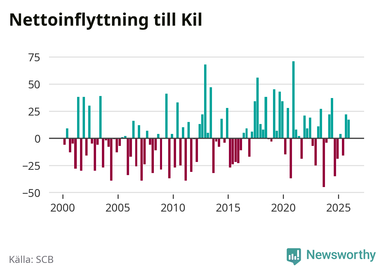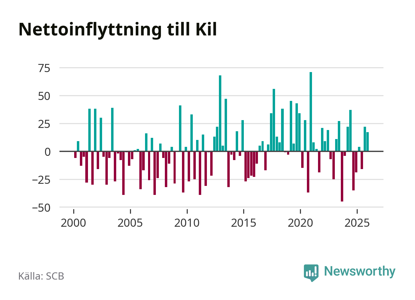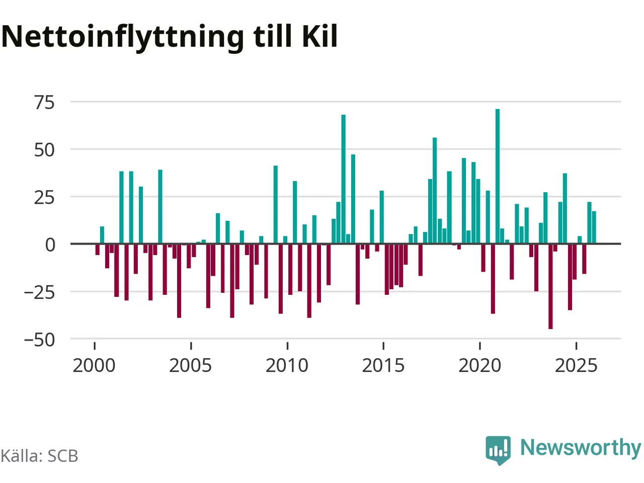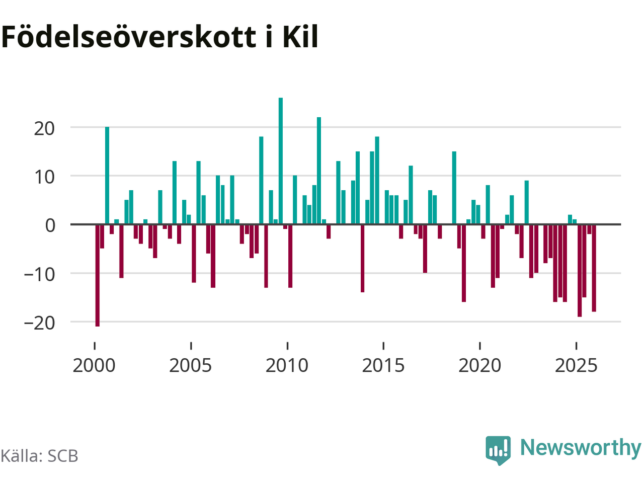 Enligt SCB:s siffror föddes 17 barn i Kil under det senaste kvartalet. Samtidigt avled 35 personer. Kil hade alltså ett negativt födelsenetto, vilket kommunen historiskt sett oftast har haft.