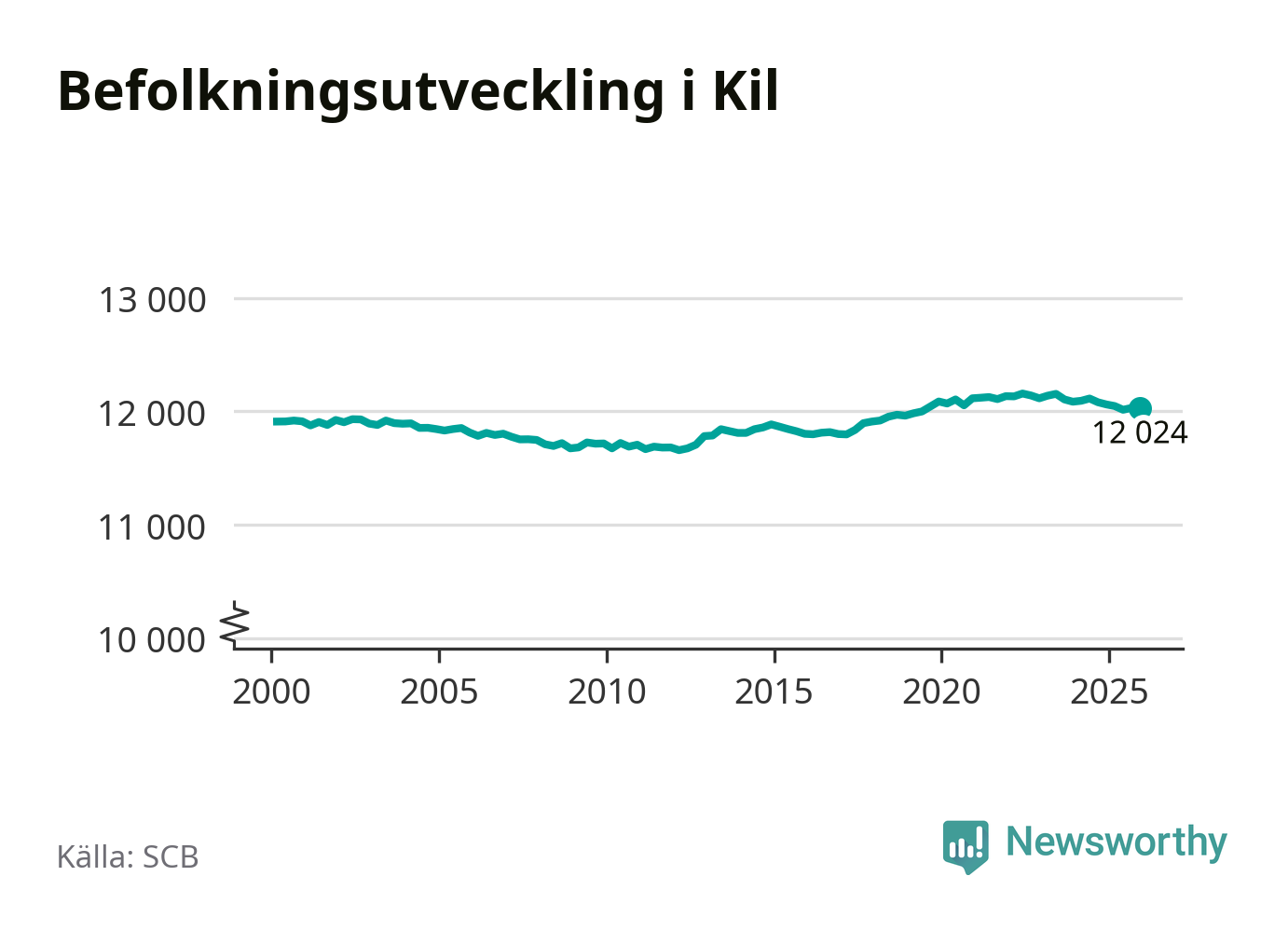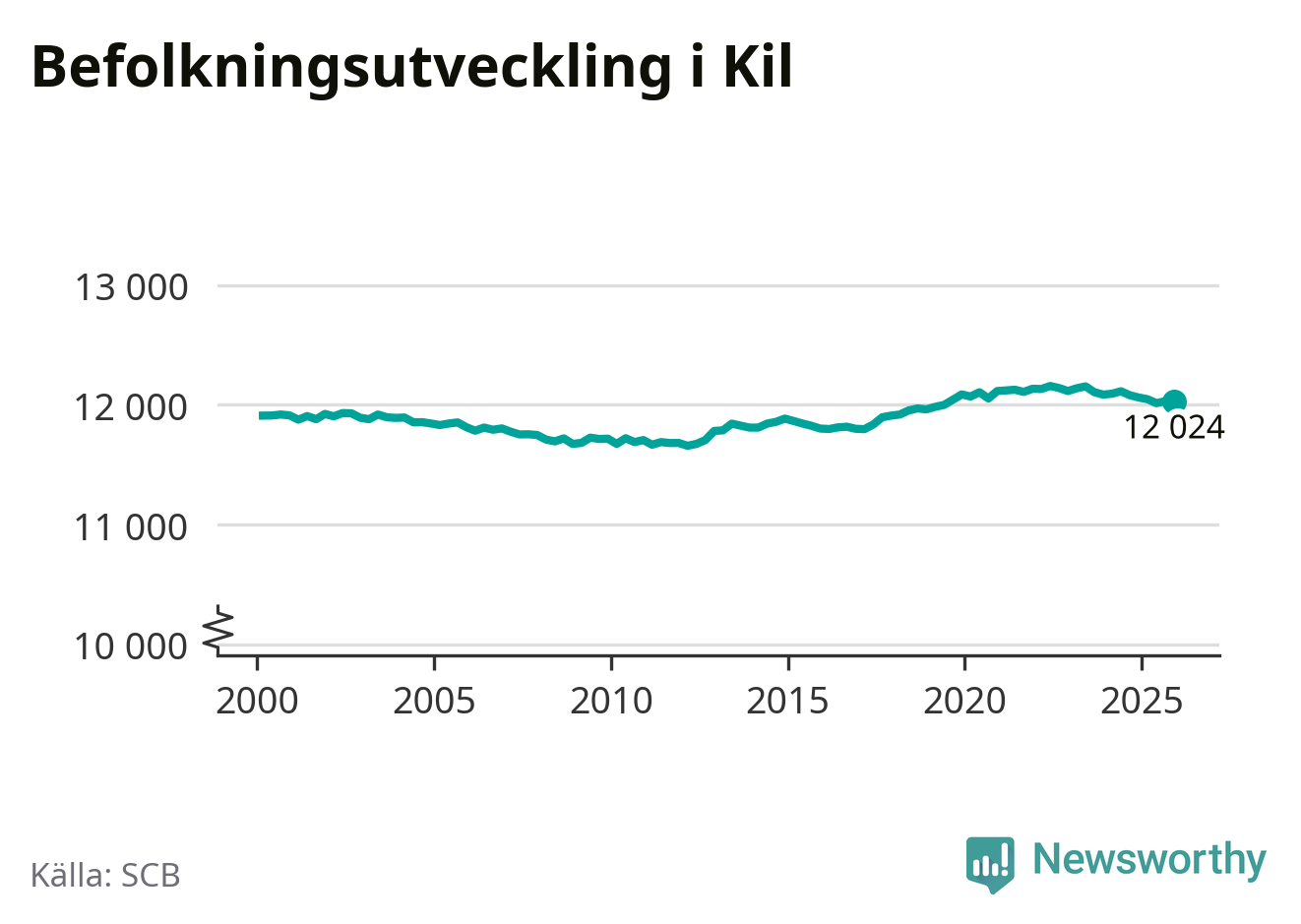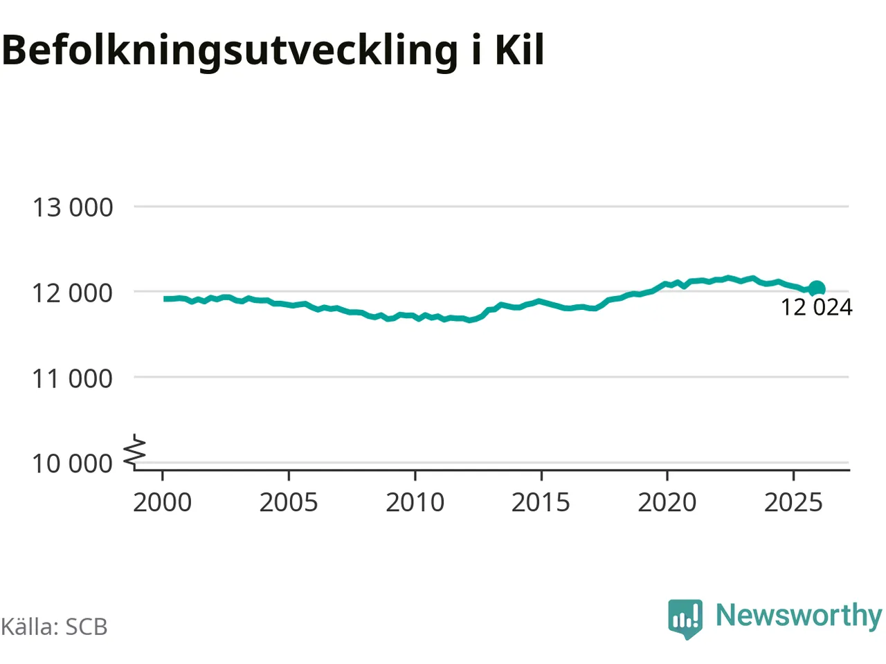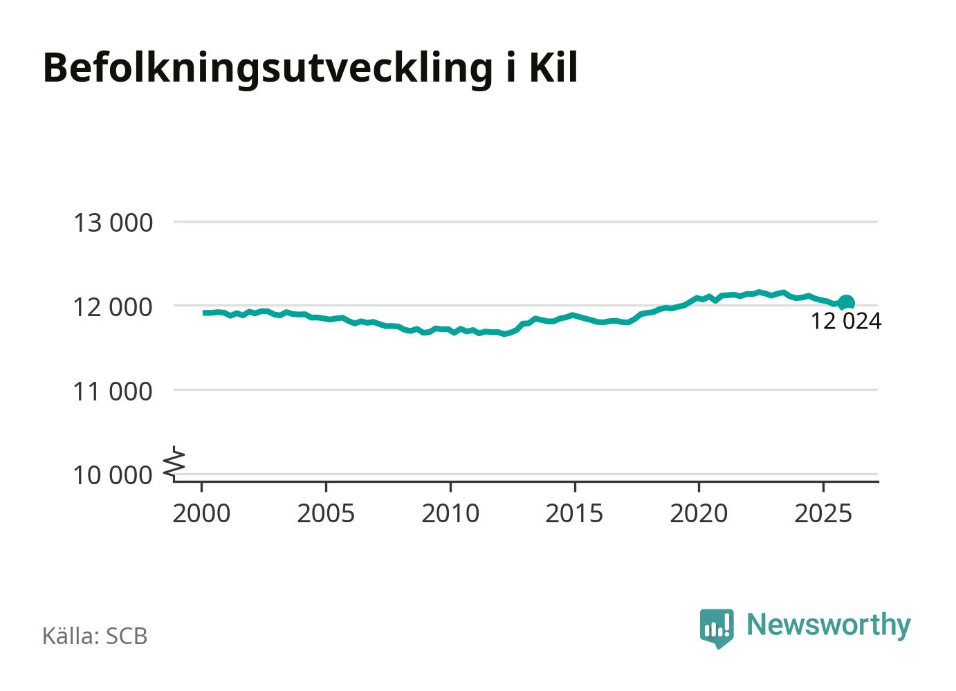 Den 31 december bodde 12 024 personer i Kils kommun, enligt SCB:s senaste siffror. Det är något färre än i slutet av tredje kvartalet, men skillnaden är så liten att den lika gärna kan bero på den lilla justering som SCB gör av siffrorna för att skydda enskilda individers identitet.