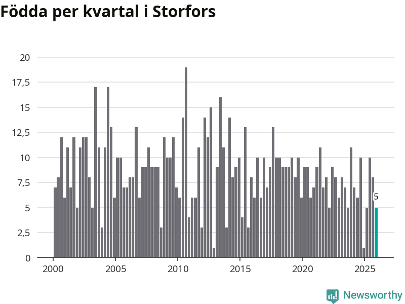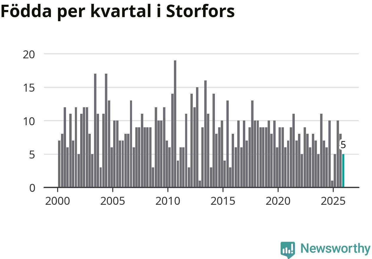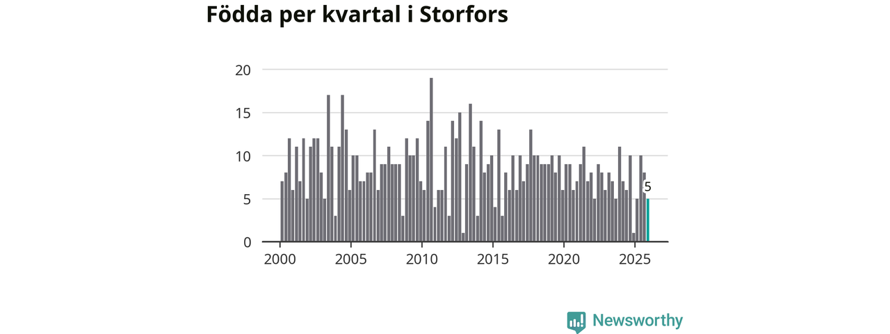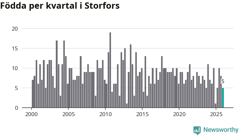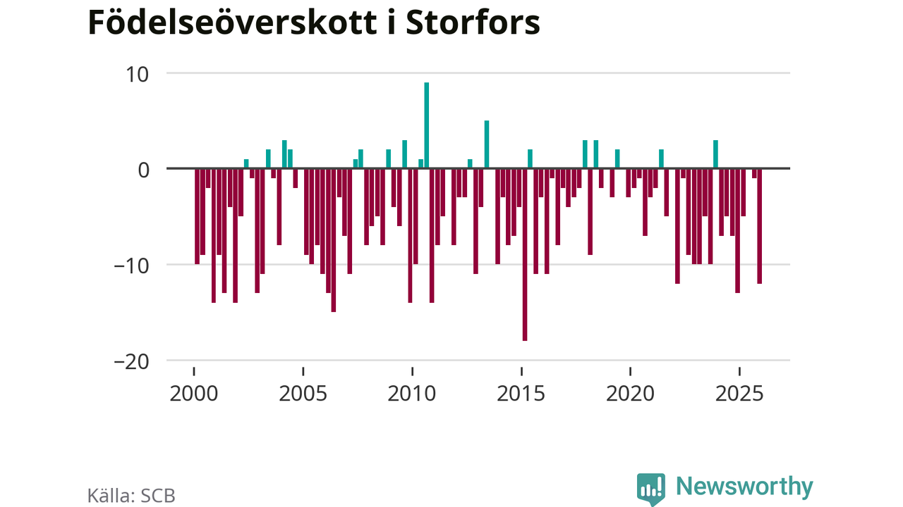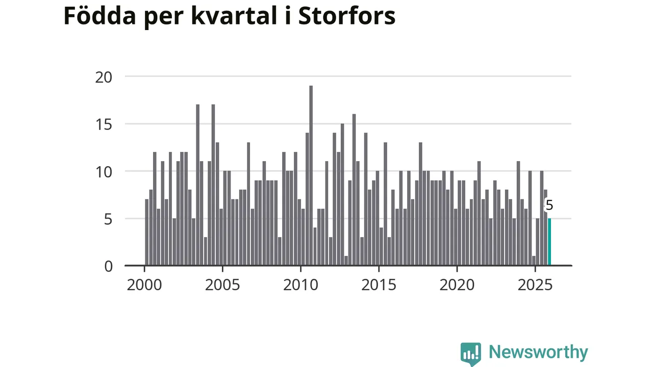Enligt SCB:s siffror föddes fem barn i Storfors under det senaste kvartalet. Samtidigt avled 17 personer. Storfors hade alltså ett negativt födelsenetto, vilket kommunen historiskt sett oftast har haft.