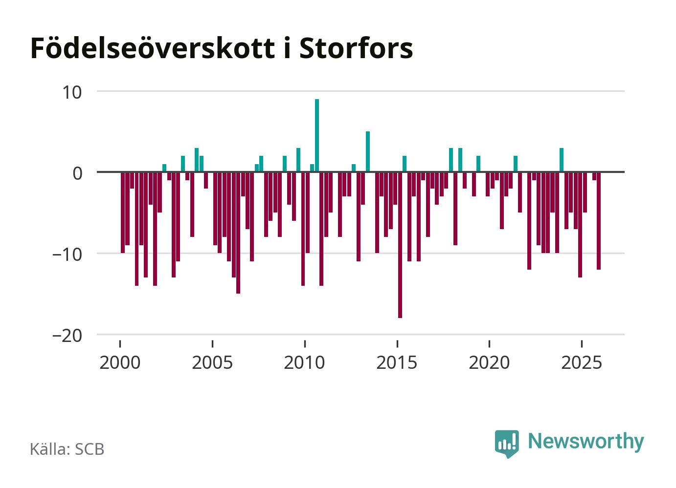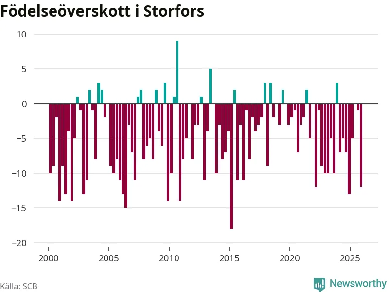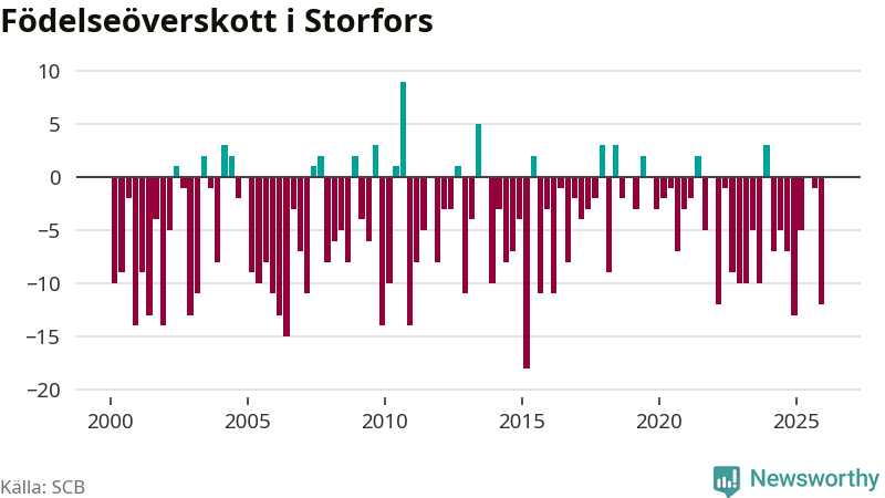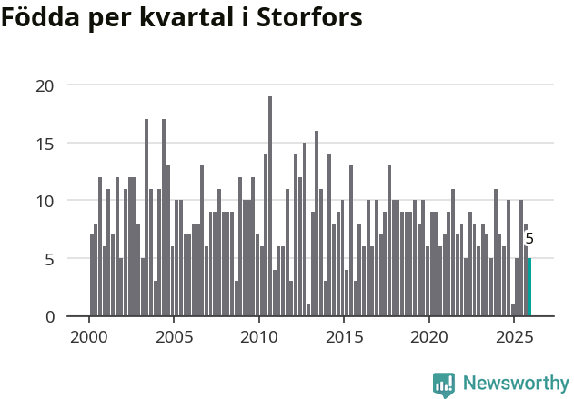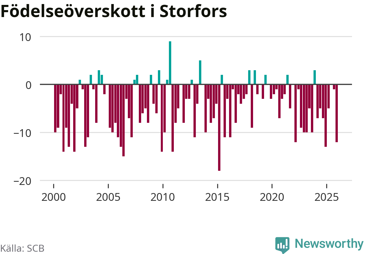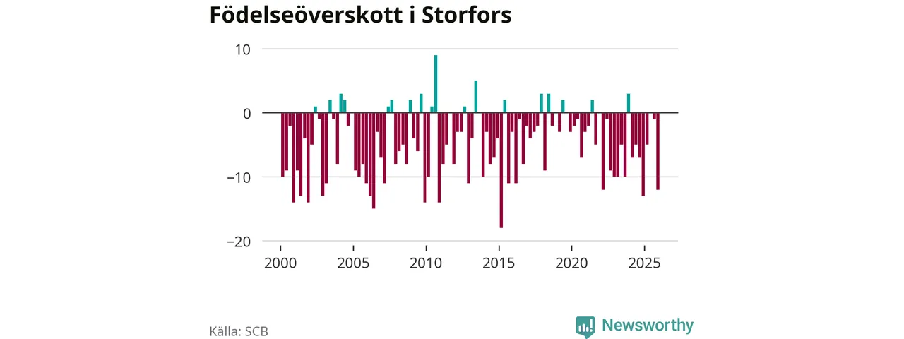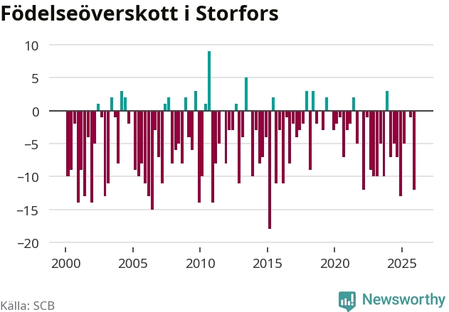 Enligt SCB:s siffror föddes fem barn i Storfors under det senaste kvartalet. Samtidigt avled 17 personer. Storfors hade alltså ett negativt födelsenetto, vilket kommunen historiskt sett oftast har haft.