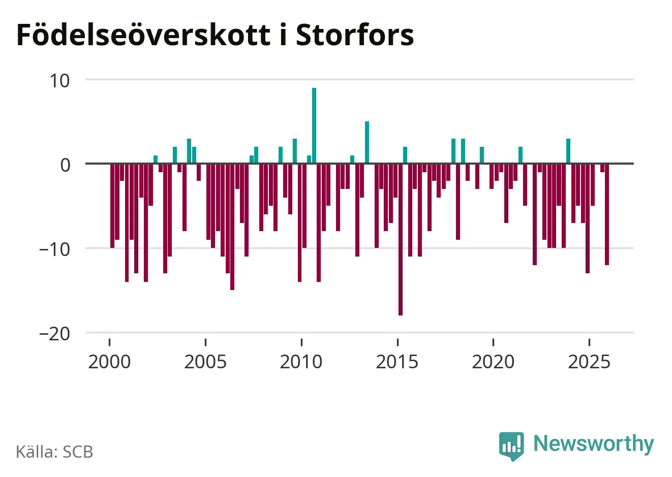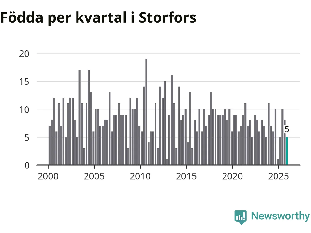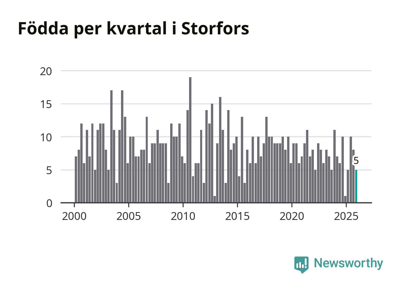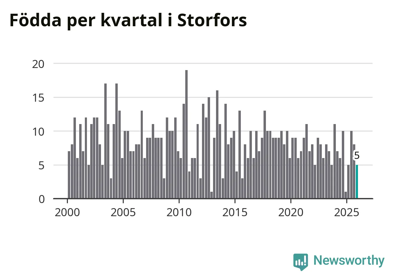 Enligt SCB:s siffror föddes fem barn i Storfors under det senaste kvartalet. Samtidigt avled 17 personer. Storfors hade alltså ett negativt födelsenetto, vilket kommunen historiskt sett oftast har haft.