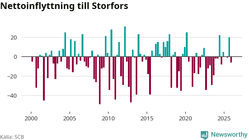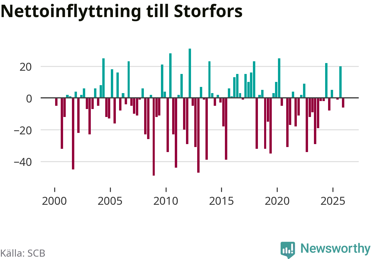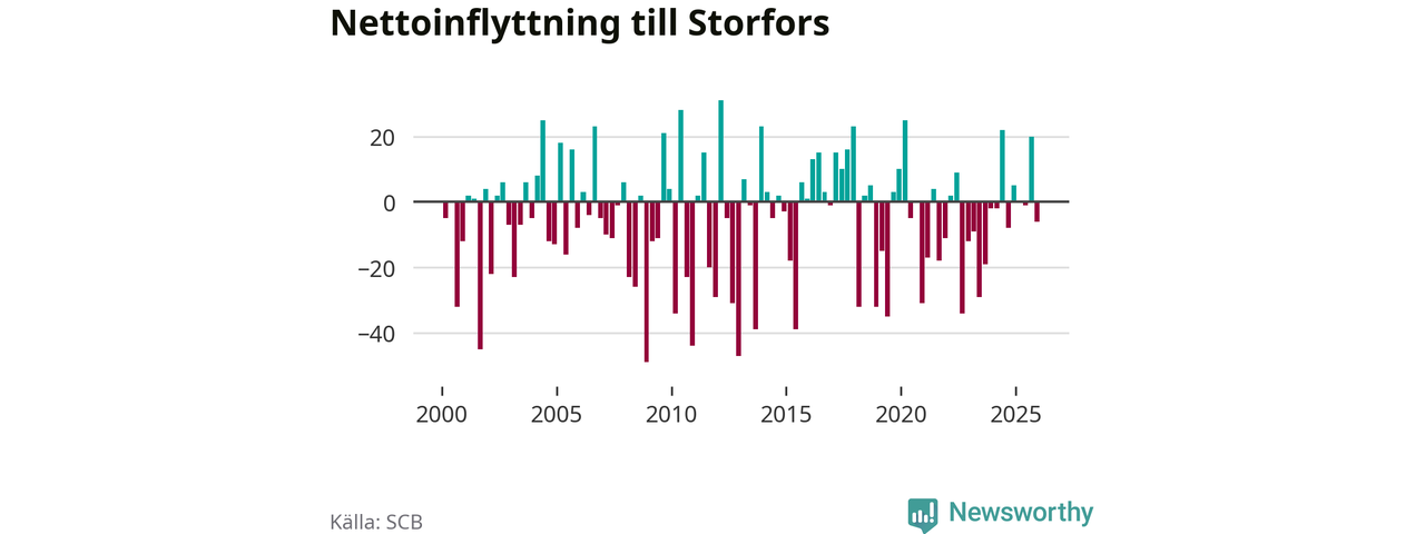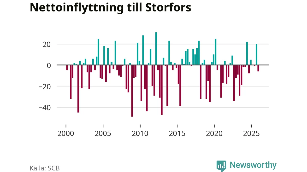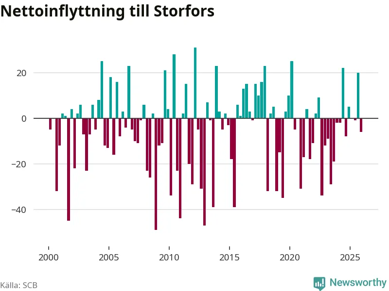 Under fjärde kvartalet 2025 flyttade 60 personer till kommunen medan 66 personer flyttade därifrån. Skillnaden mellan antalet in- och utflyttade är så liten att den lika gärna kan bero på SCB:s slumpmässiga brus. Sedan seklets början har Storfors haft ungefär lika många kvartal med positivt flyttnetto som negativt.