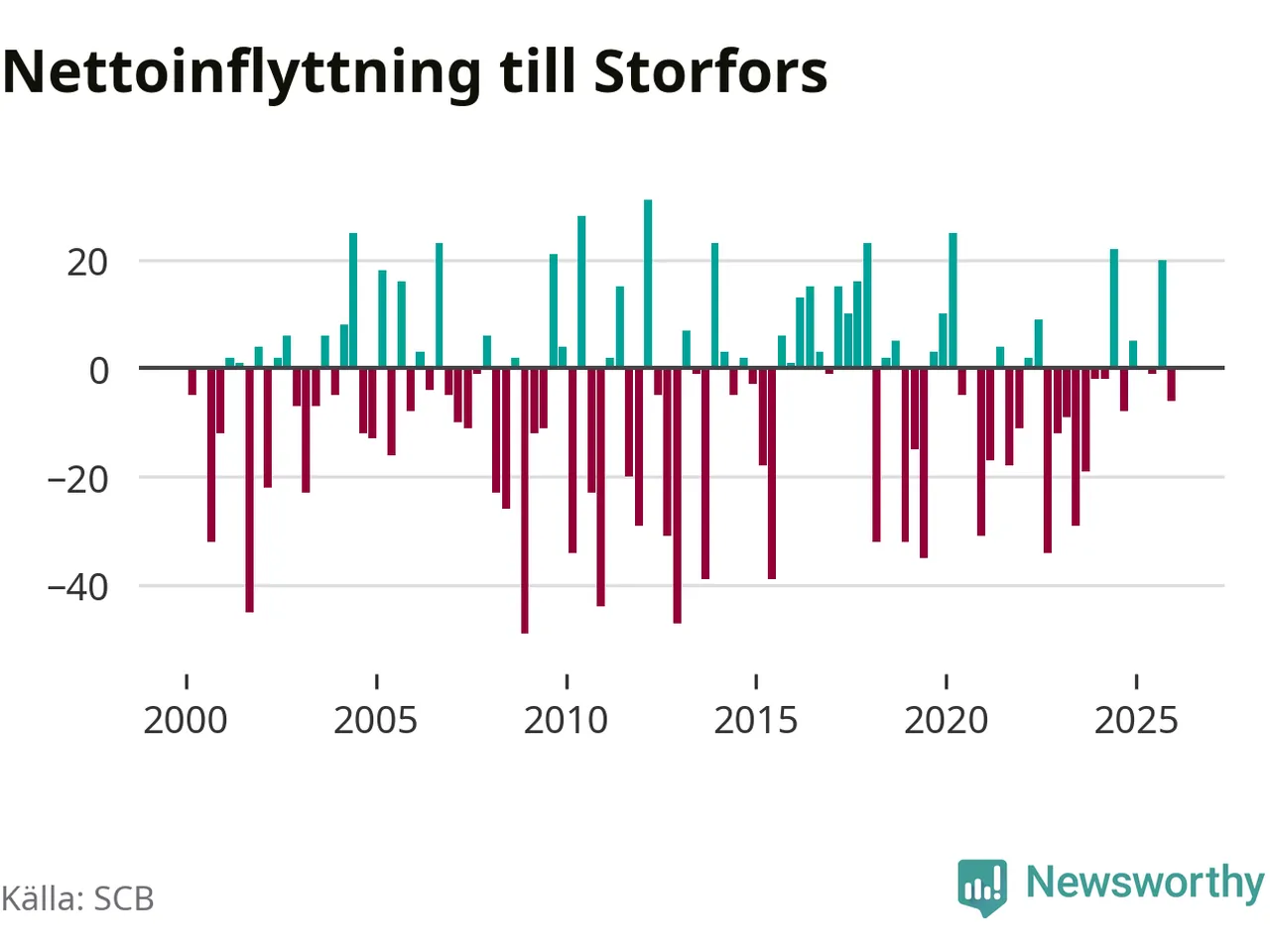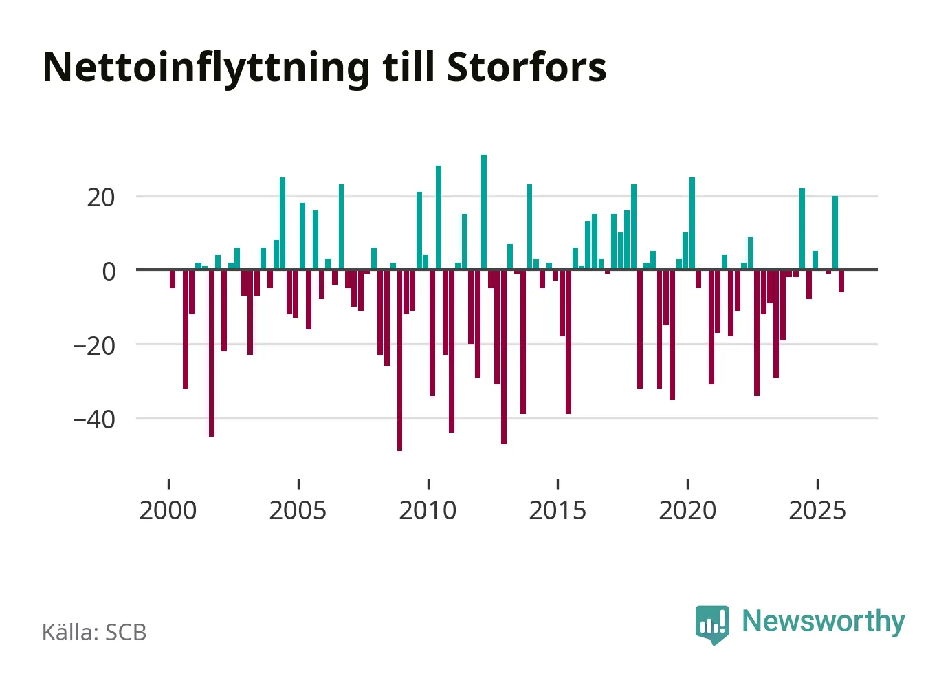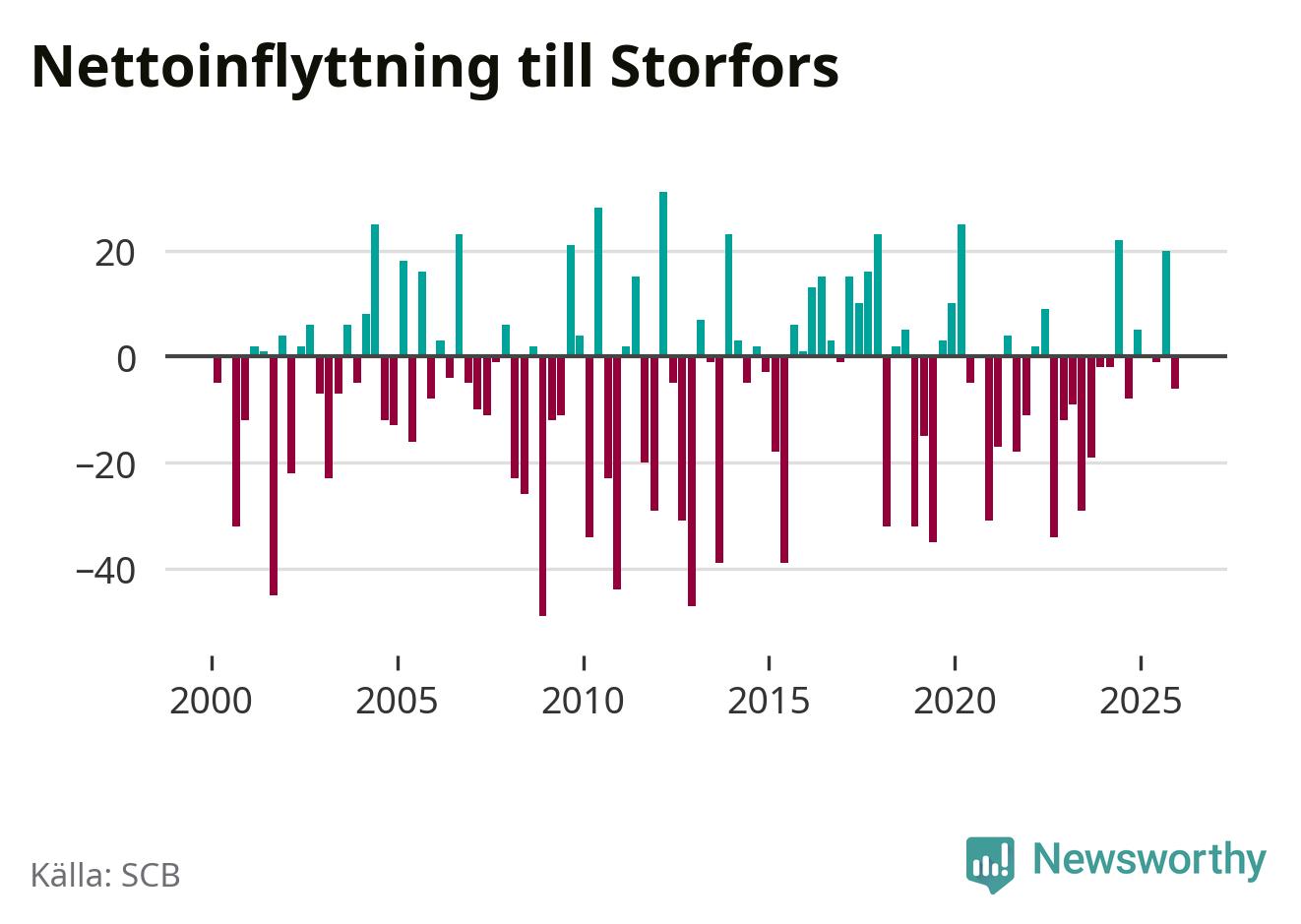 Under fjärde kvartalet 2025 flyttade 60 personer till kommunen medan 66 personer flyttade därifrån. Skillnaden mellan antalet in- och utflyttade är så liten att den lika gärna kan bero på SCB:s slumpmässiga brus. Sedan seklets början har Storfors haft ungefär lika många kvartal med positivt flyttnetto som negativt.