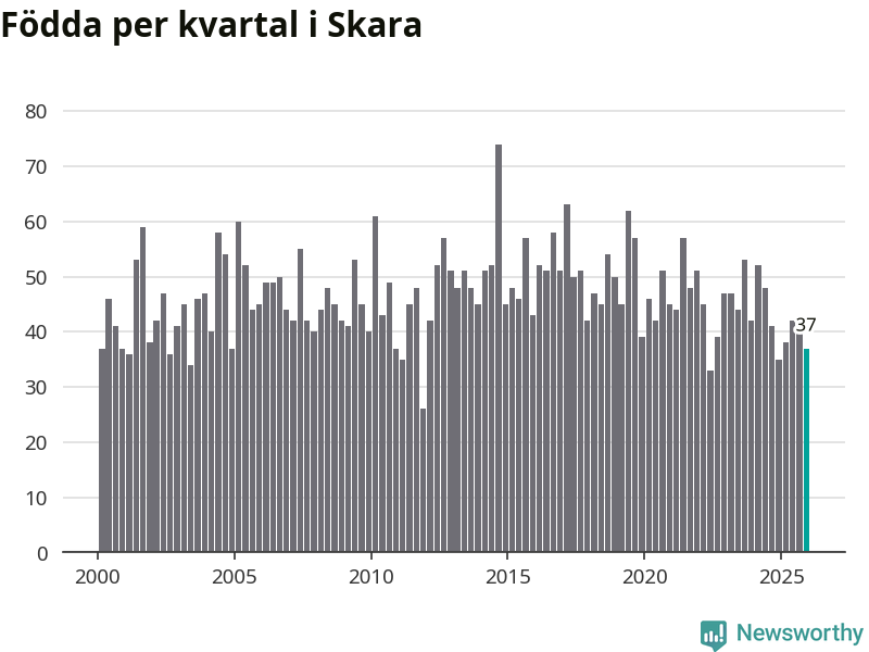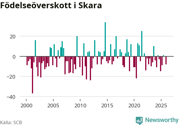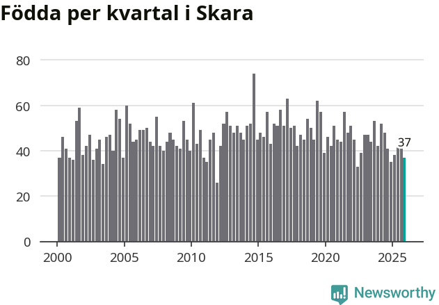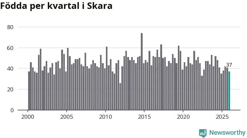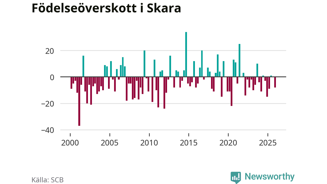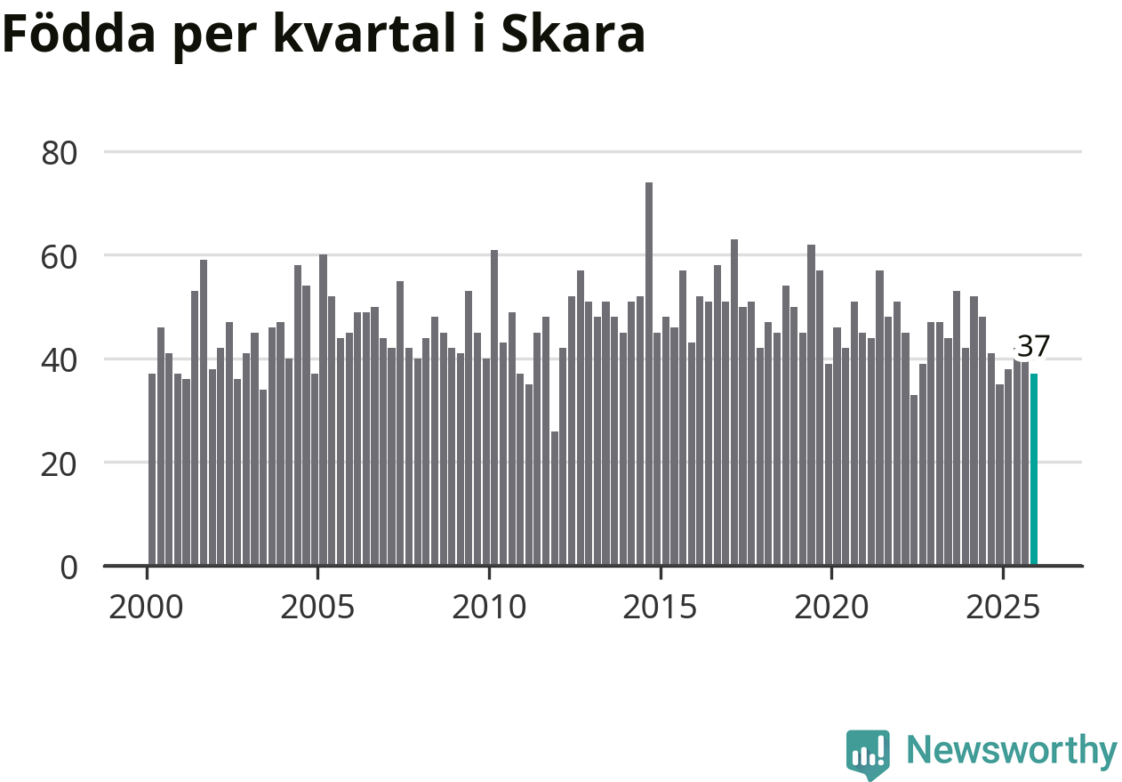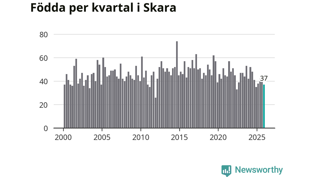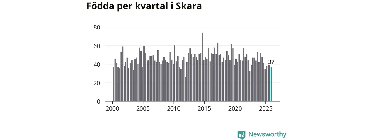 Enligt SCB:s siffror föddes 37 barn i Skara under det senaste kvartalet. Samtidigt avled 45 personer. Skara hade alltså ett negativt födelsenetto. Historiskt sett har kommunen haft ungefär lika många kvartal med positivt flyttnetto som negativt.