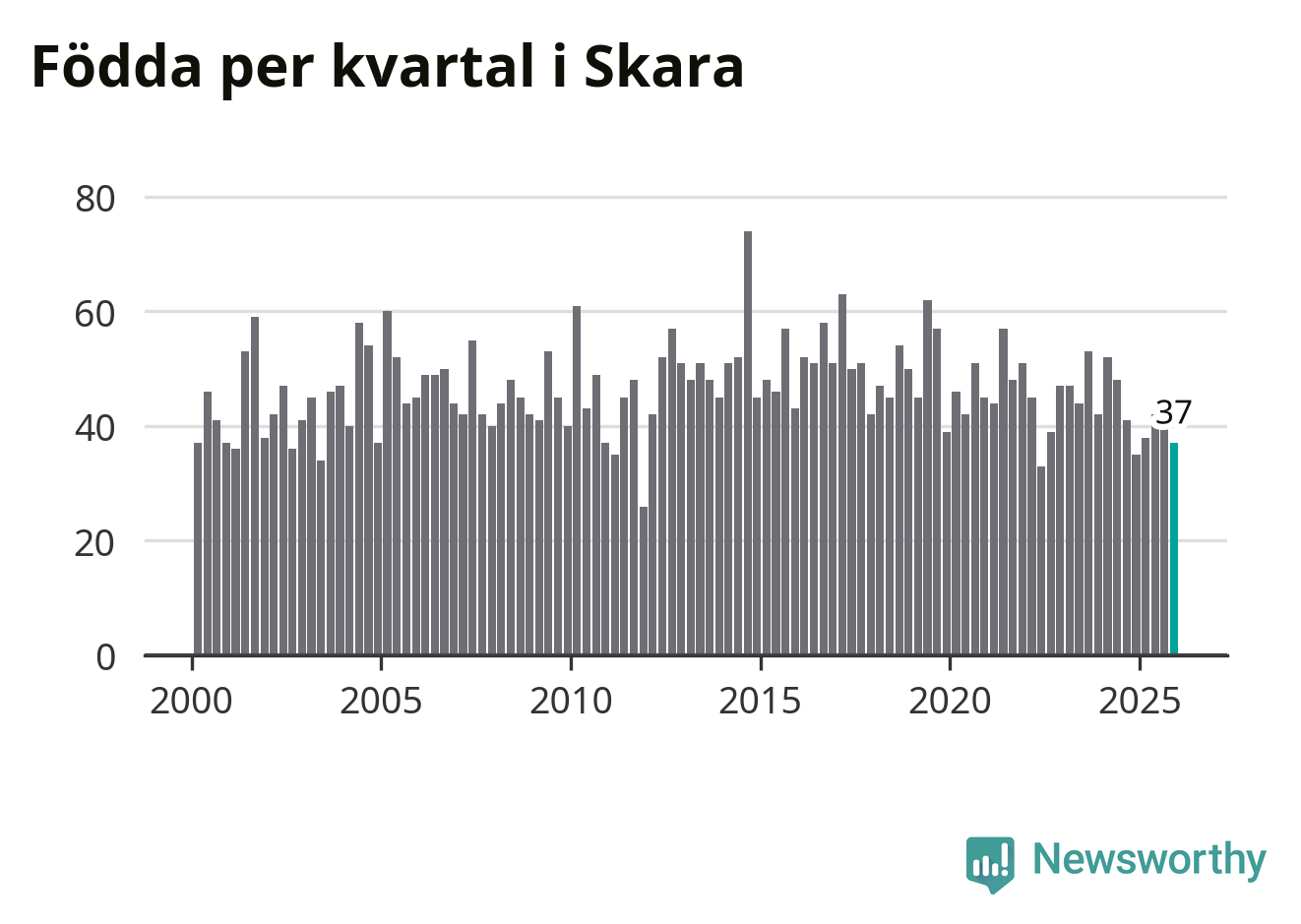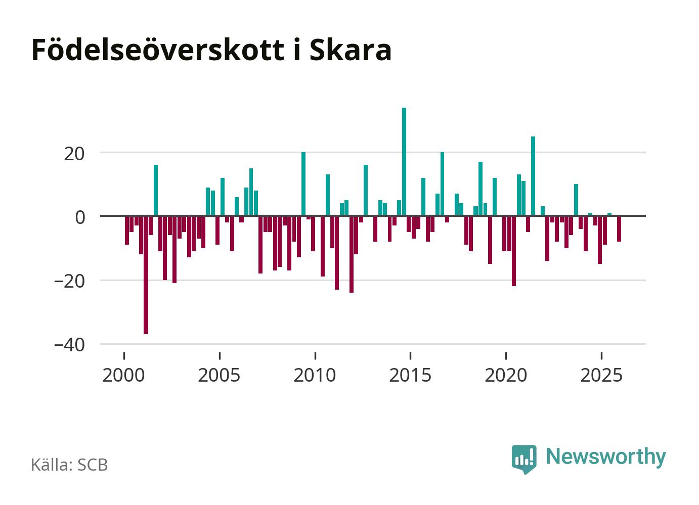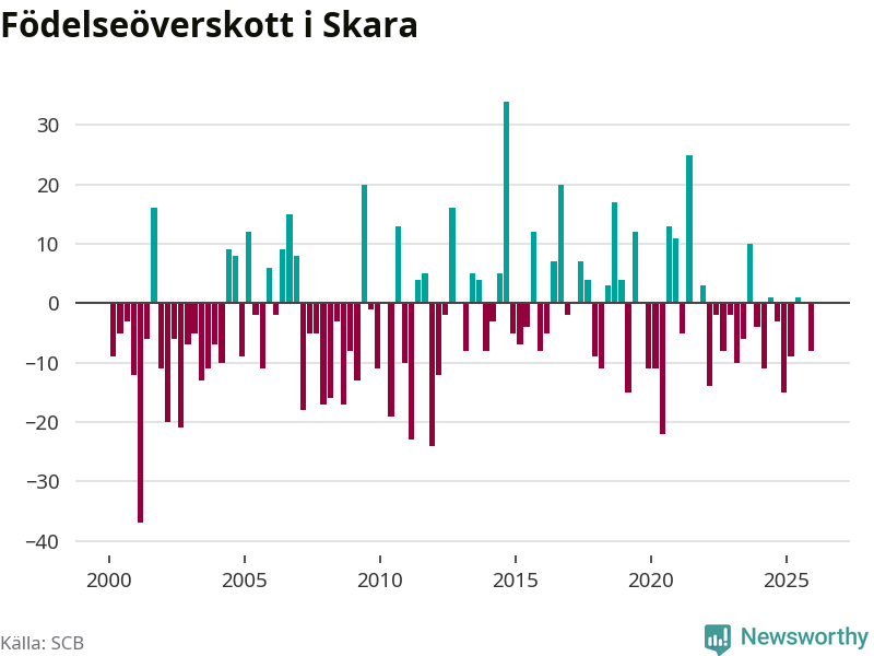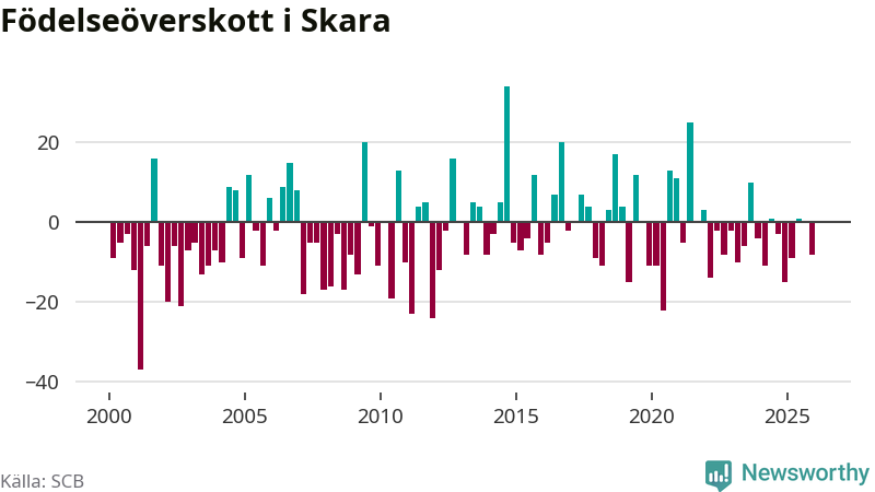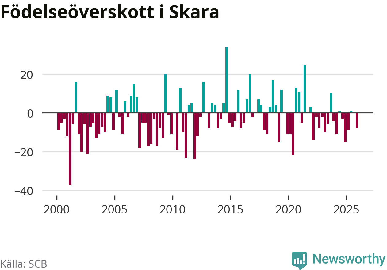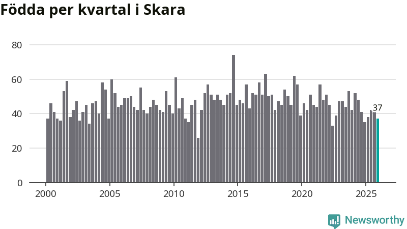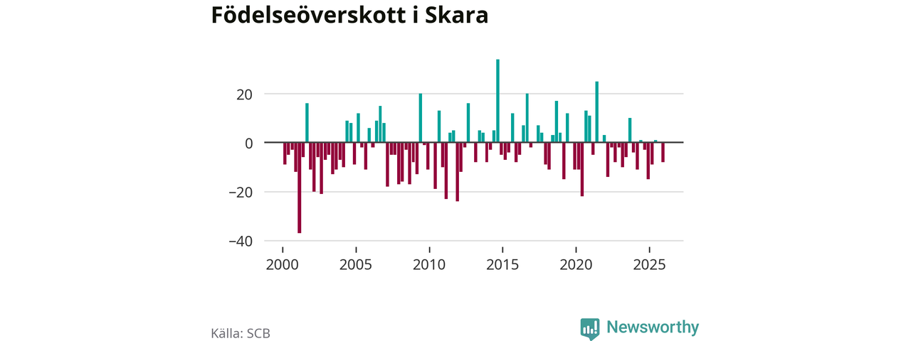 Enligt SCB:s siffror föddes 37 barn i Skara under det senaste kvartalet. Samtidigt avled 45 personer. Skara hade alltså ett negativt födelsenetto. Historiskt sett har kommunen haft ungefär lika många kvartal med positivt flyttnetto som negativt.
