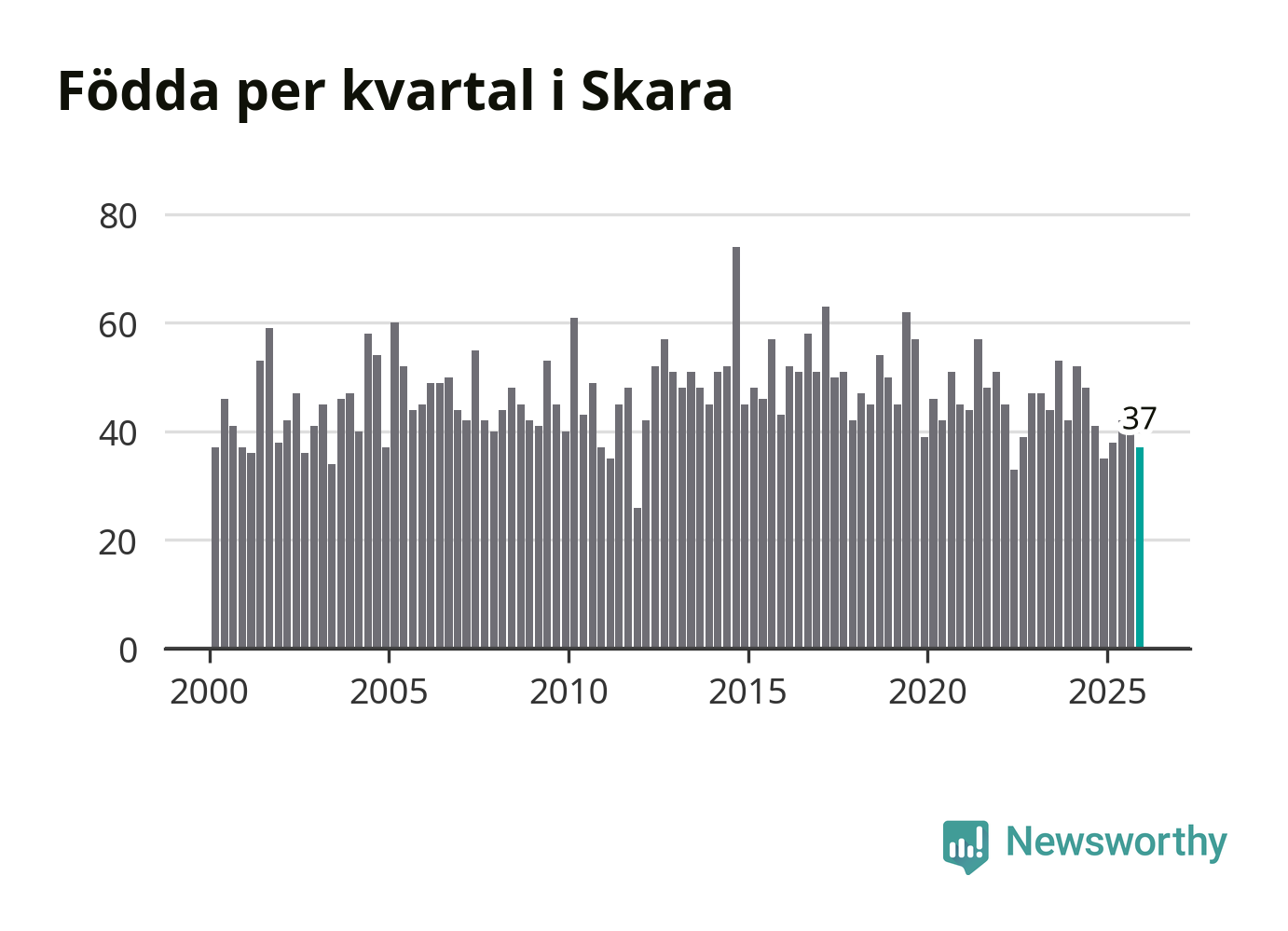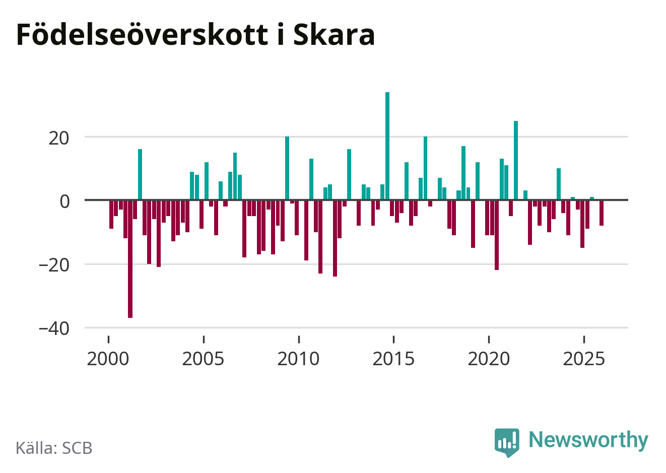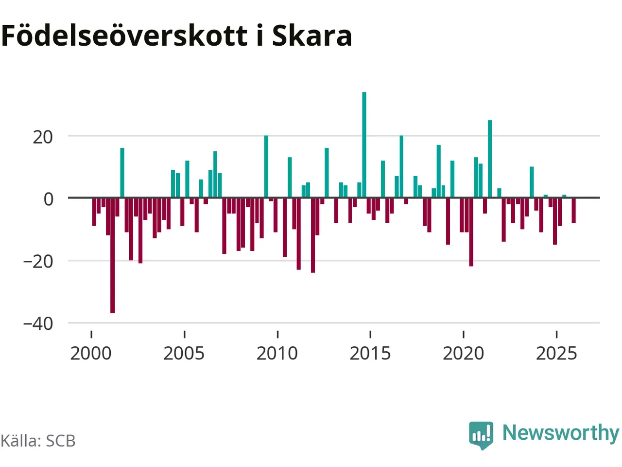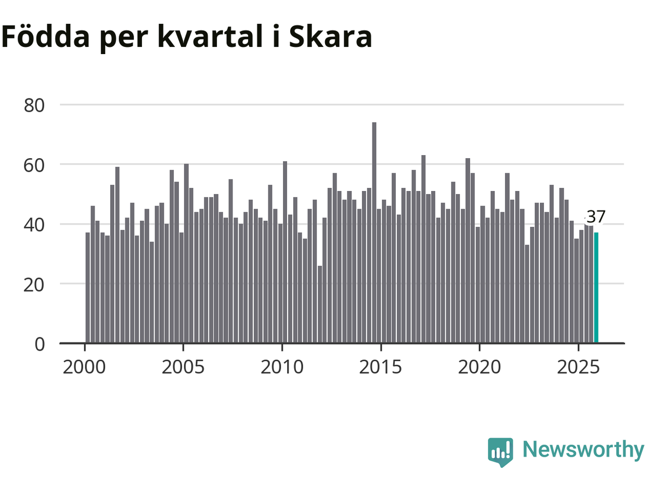 Enligt SCB:s siffror föddes 37 barn i Skara under det senaste kvartalet. Samtidigt avled 45 personer. Skara hade alltså ett negativt födelsenetto. Historiskt sett har kommunen haft ungefär lika många kvartal med positivt flyttnetto som negativt.