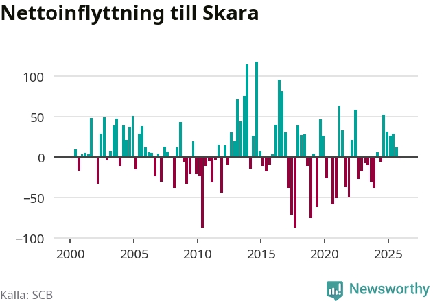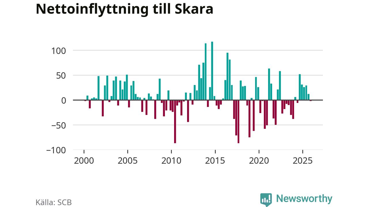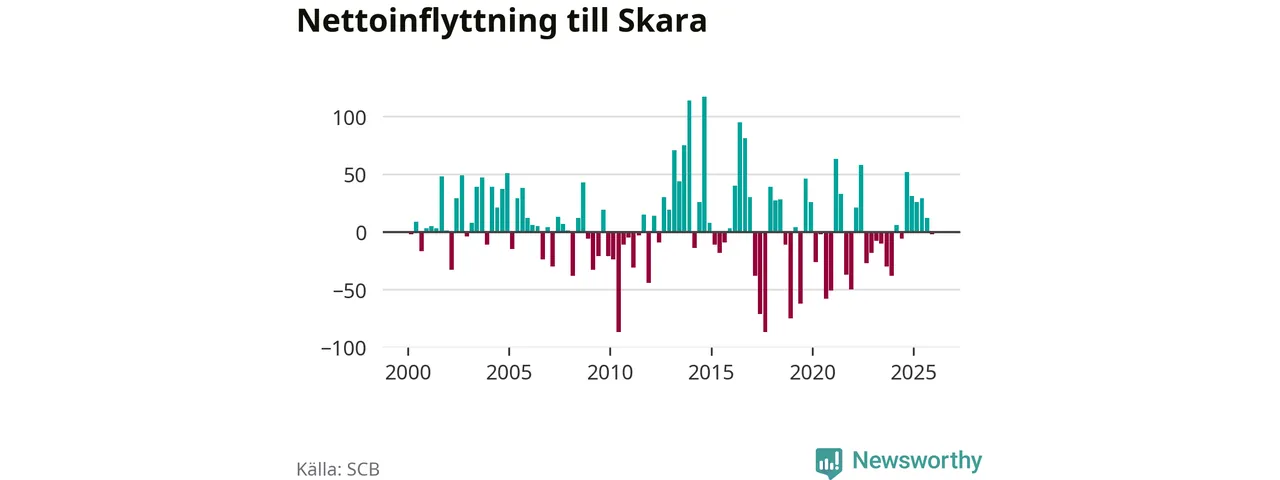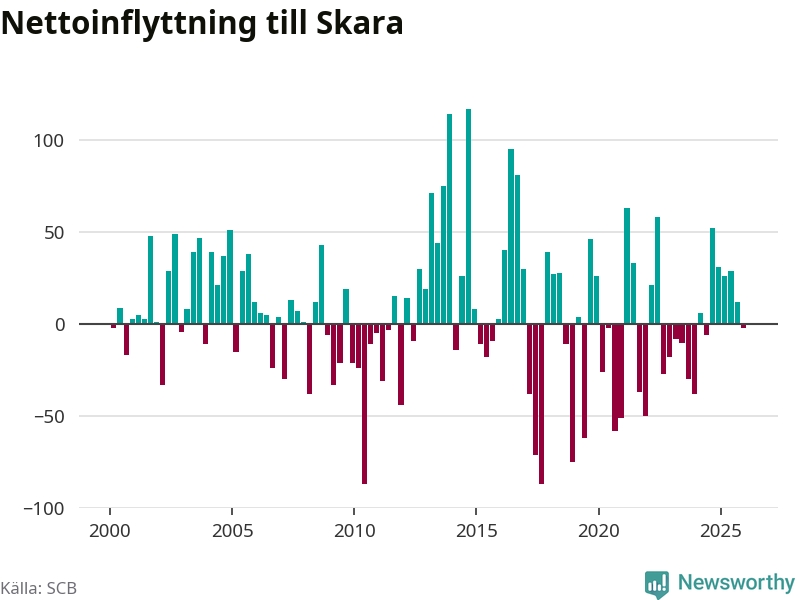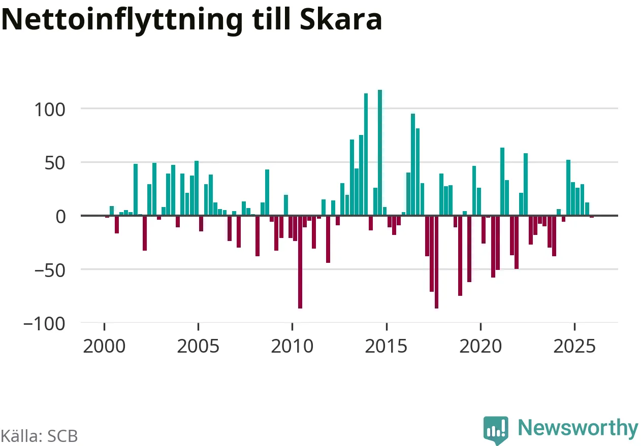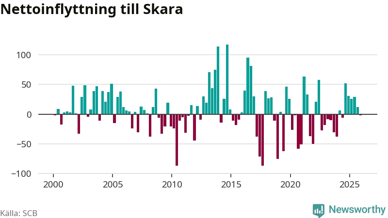 Under fjärde kvartalet 2025 flyttade 239 personer till kommunen medan 241 personer flyttade därifrån. Skillnaden mellan antalet in- och utflyttade är så liten att den lika gärna kan bero på SCB:s slumpmässiga brus. Sedan seklets början har Skara haft ungefär lika många kvartal med positivt flyttnetto som negativt.