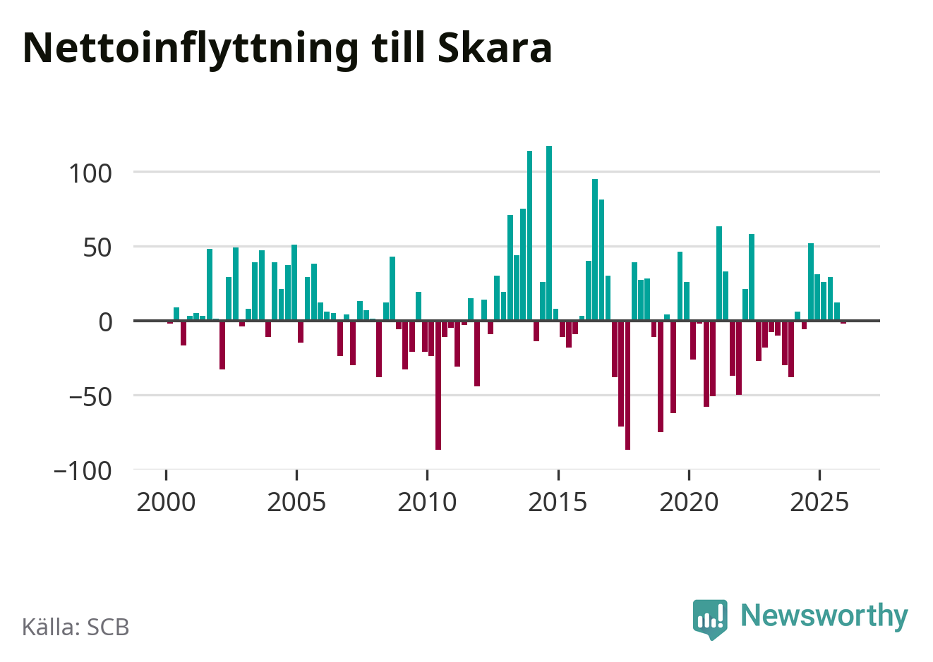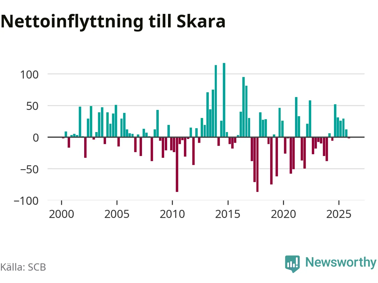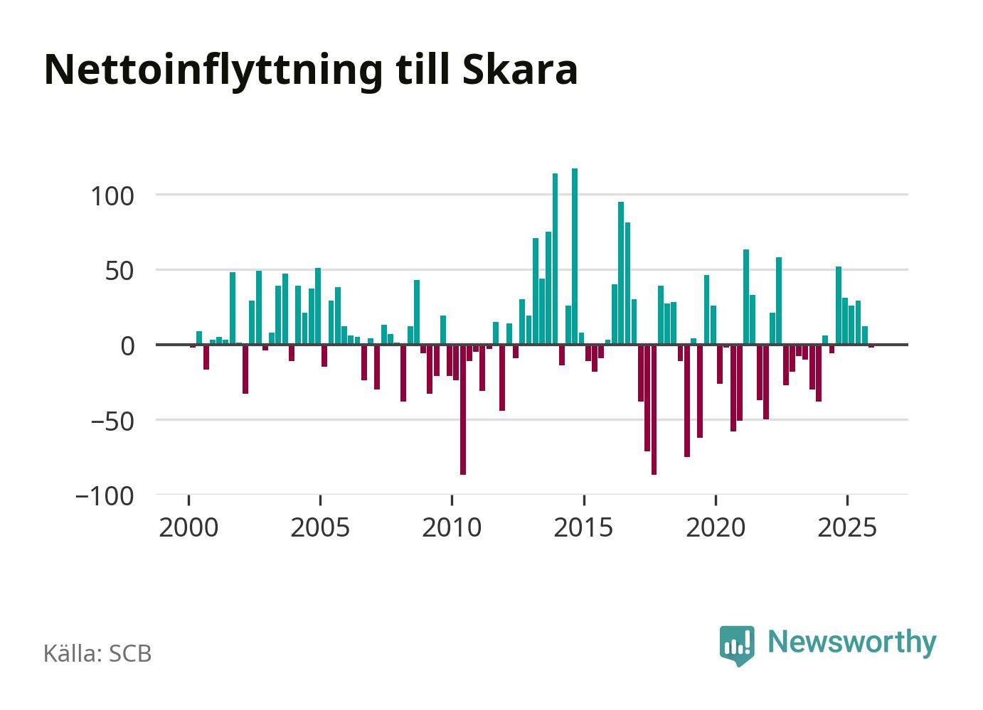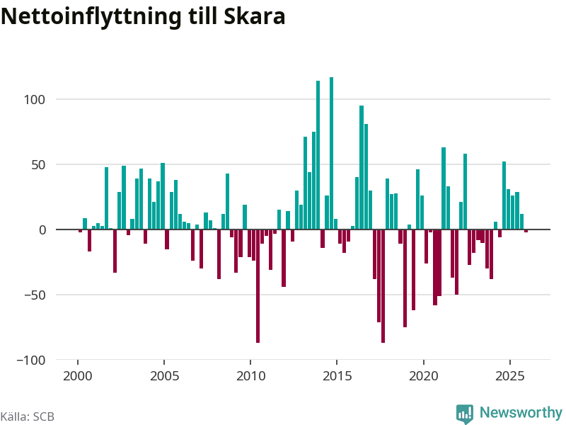 Under fjärde kvartalet 2025 flyttade 239 personer till kommunen medan 241 personer flyttade därifrån. Skillnaden mellan antalet in- och utflyttade är så liten att den lika gärna kan bero på SCB:s slumpmässiga brus. Sedan seklets början har Skara haft ungefär lika många kvartal med positivt flyttnetto som negativt.