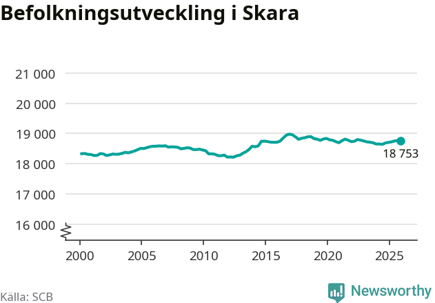 Befolkningen minskade i Skara kommun under det fjärde kvartalet 2025. Den 31 december bodde enligt SCB:s senaste siffror 18 753 personer i kommunen, vilket är 15 färre än i slutet av tredje kvartalet.