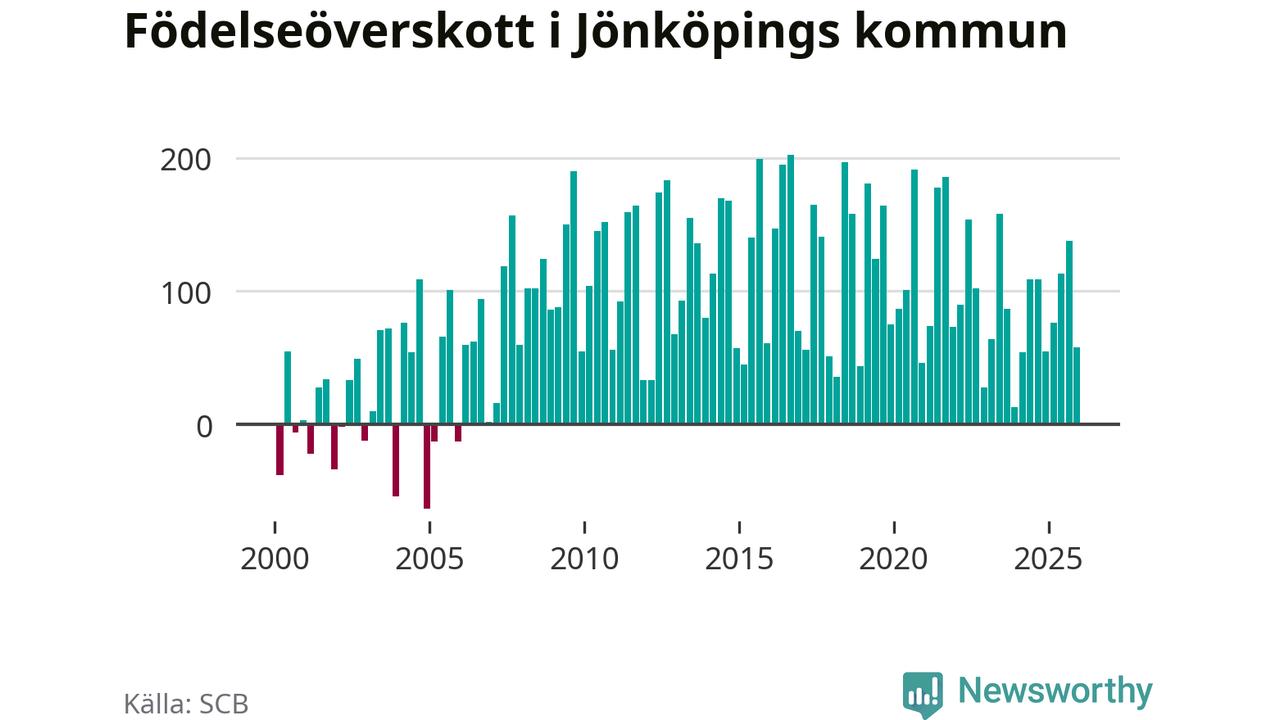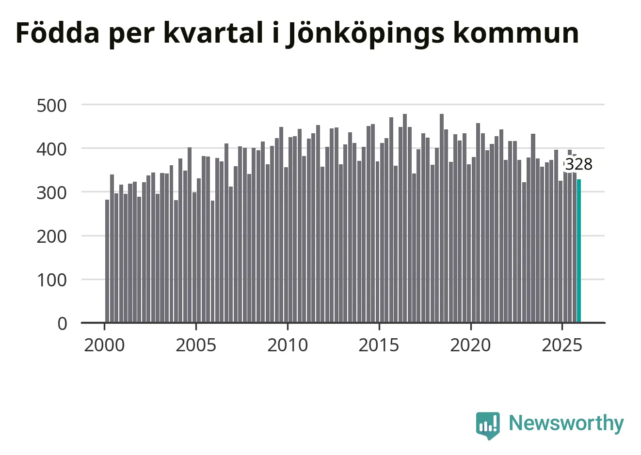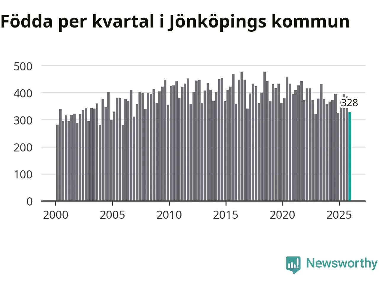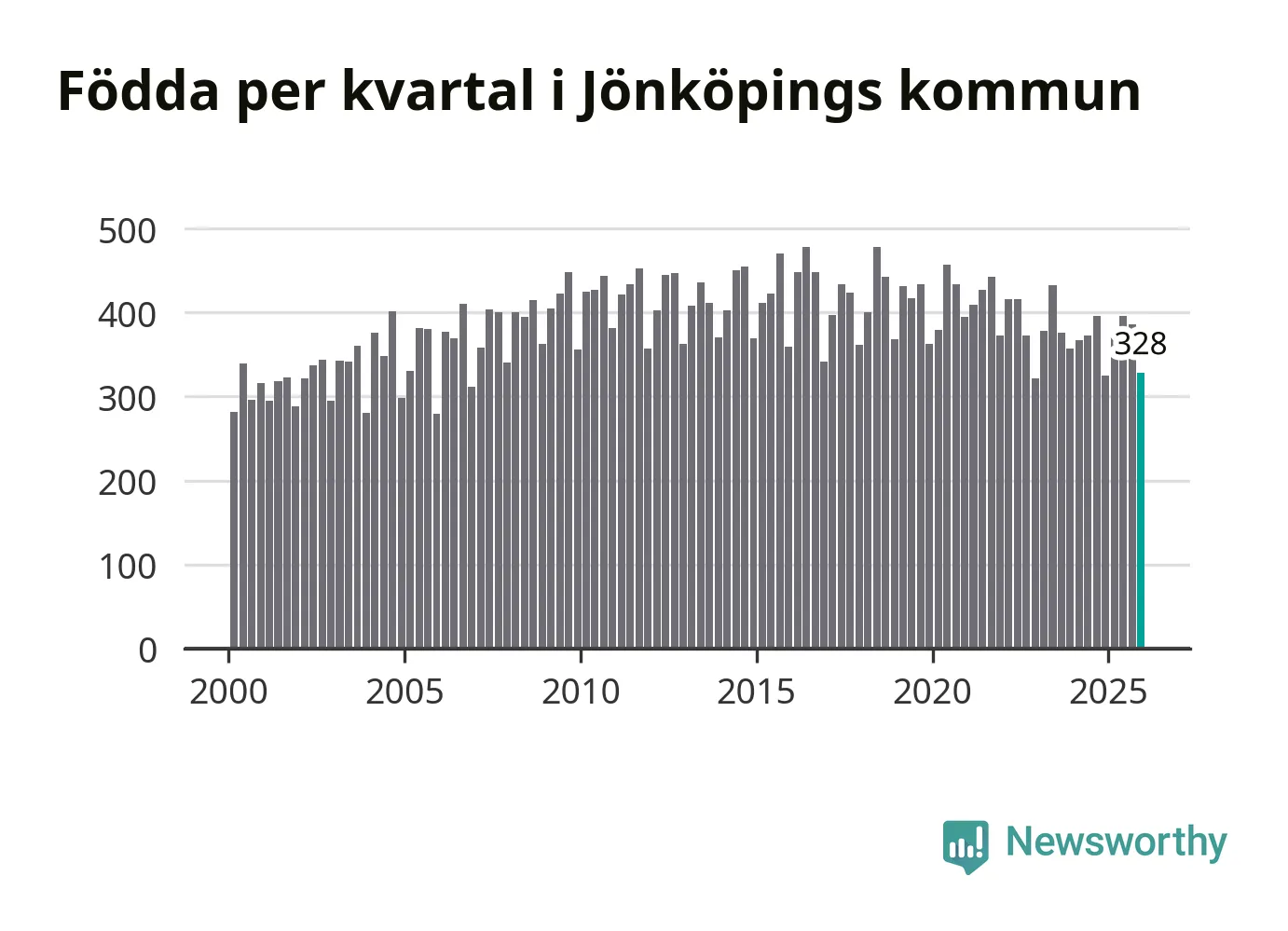 Enligt SCB:s siffror föddes 328 barn i Jönköpings kommun under det senaste kvartalet. Samtidigt avled 270 personer. Jönköping hade alltså ett positivt födelsenetto, vilket kommunen historiskt sett i princip alltid har haft.