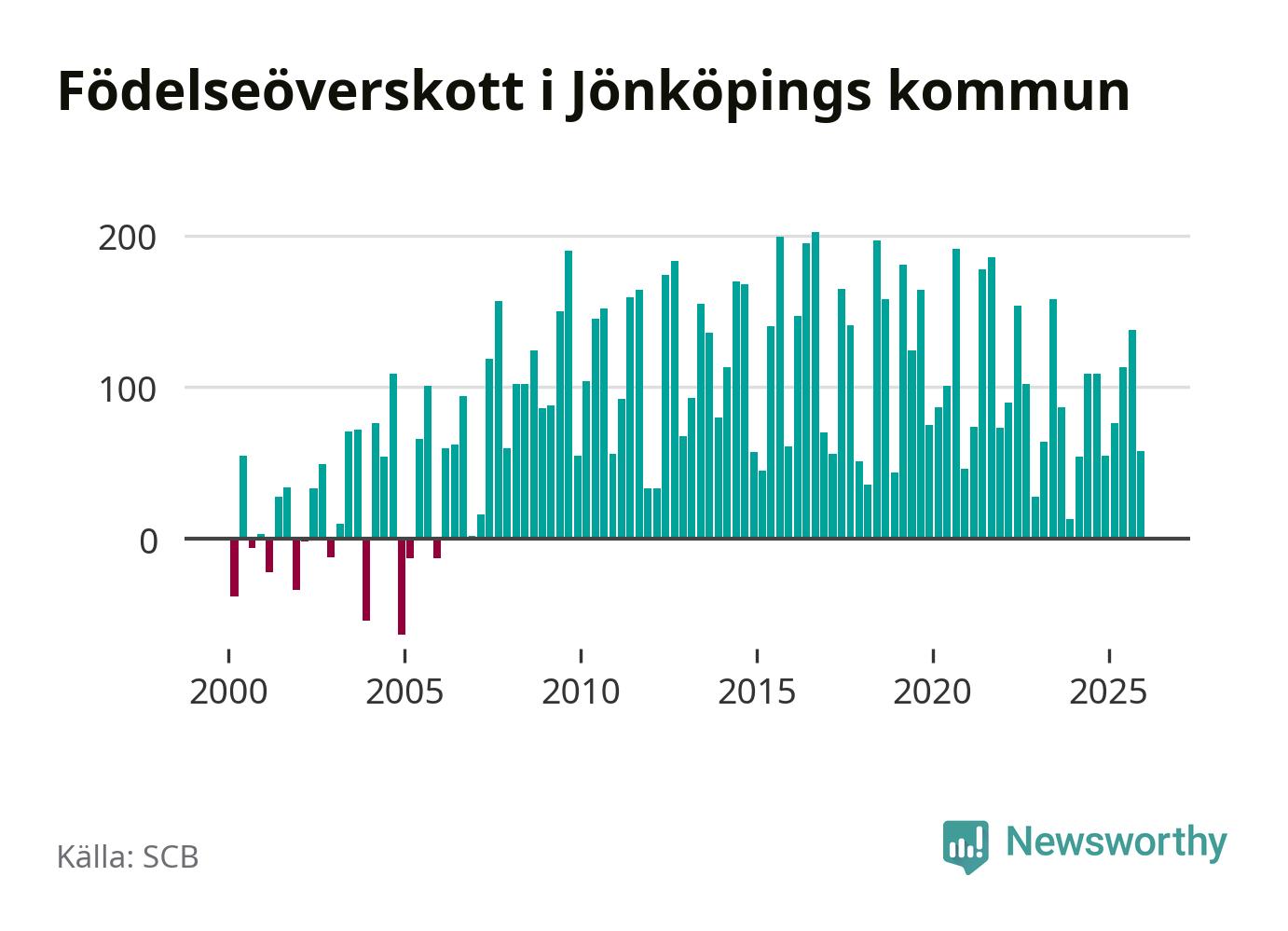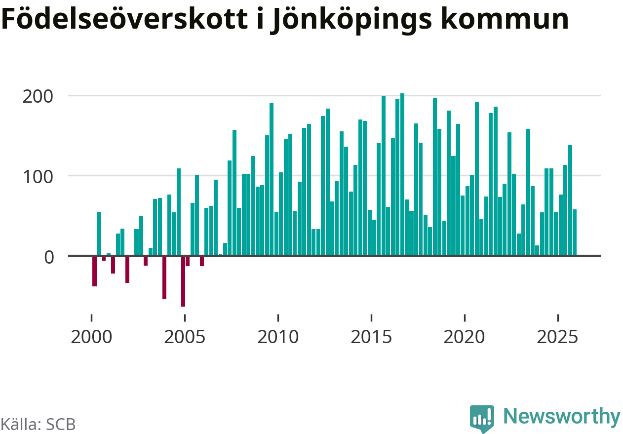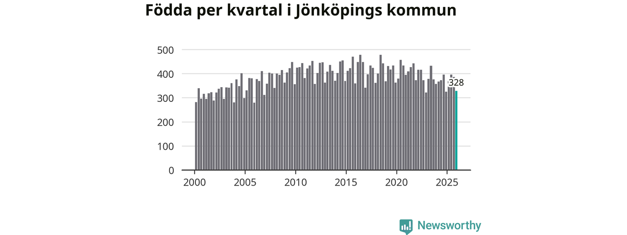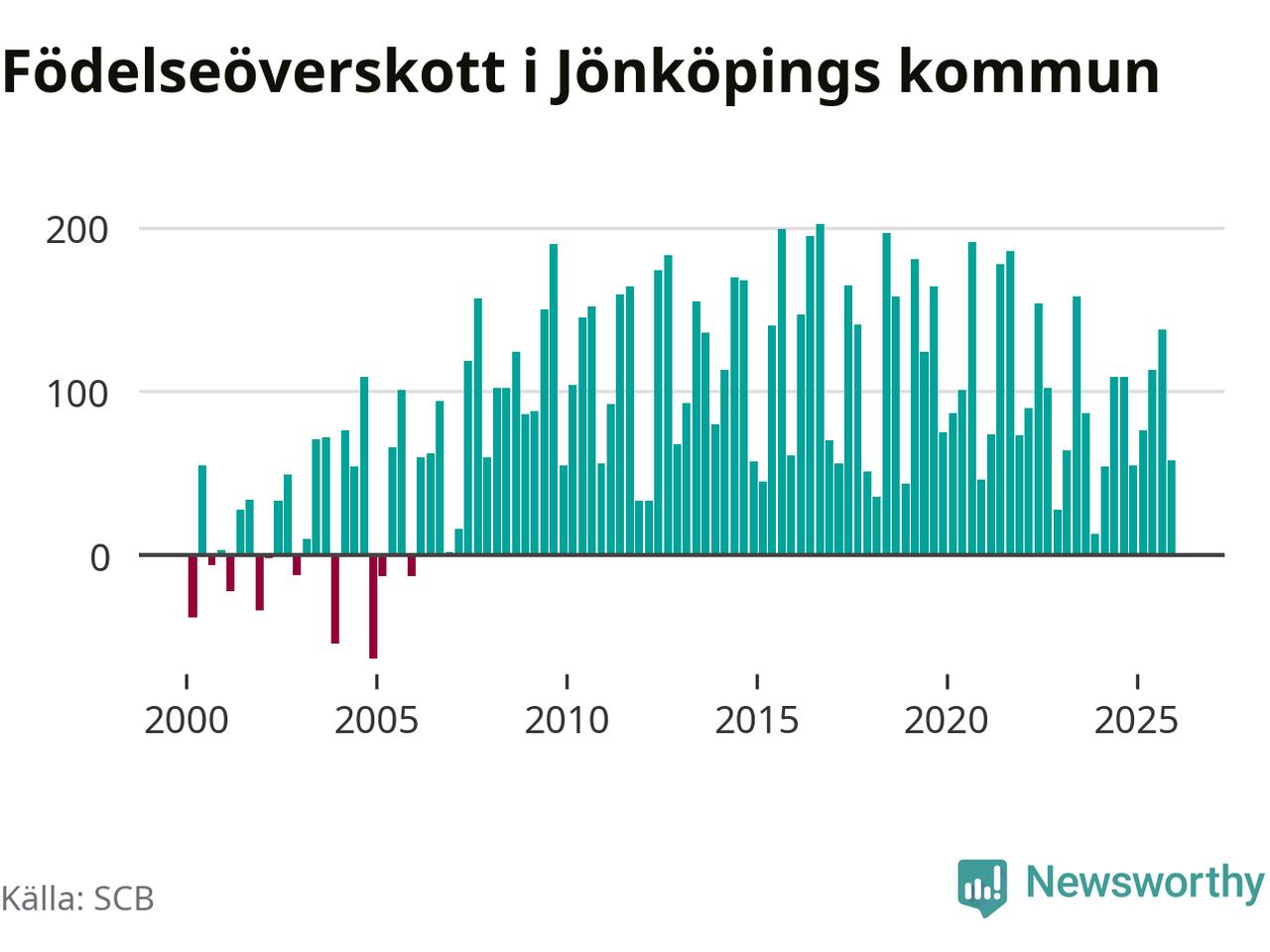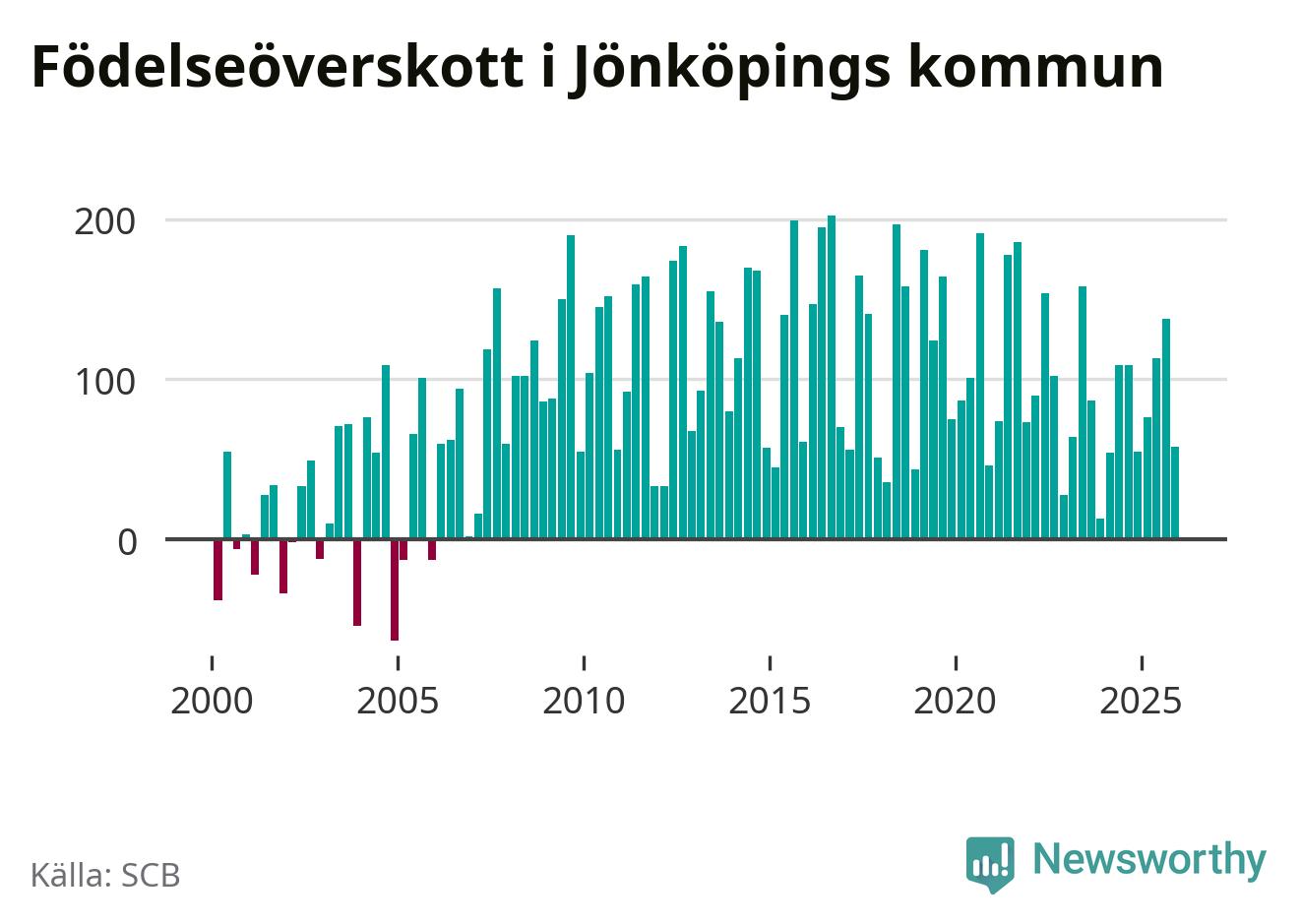 Enligt SCB:s siffror föddes 328 barn i Jönköpings kommun under det senaste kvartalet. Samtidigt avled 270 personer. Jönköping hade alltså ett positivt födelsenetto, vilket kommunen historiskt sett i princip alltid har haft.