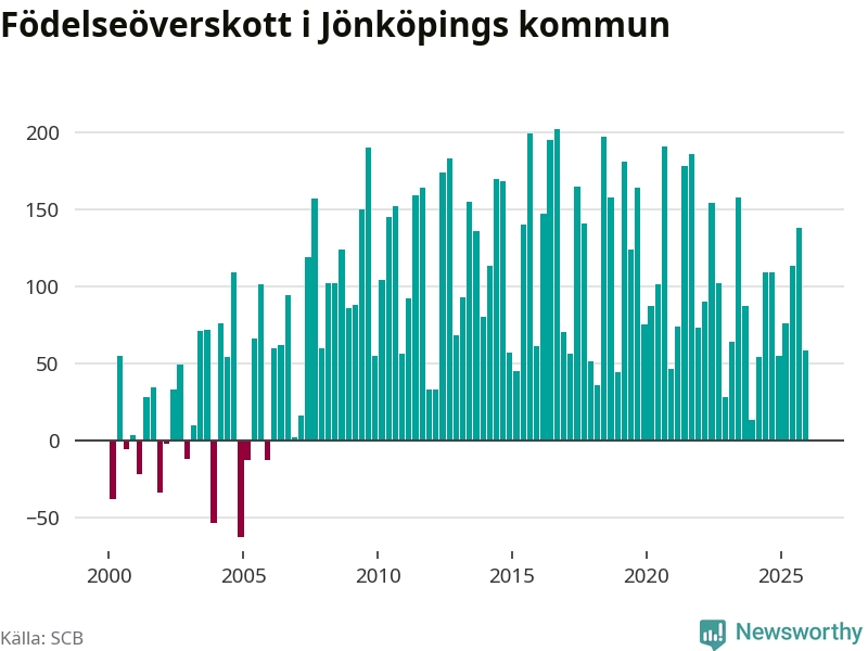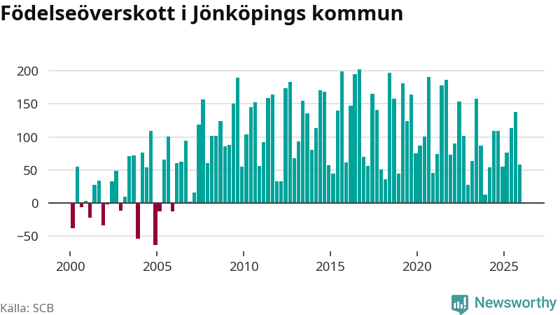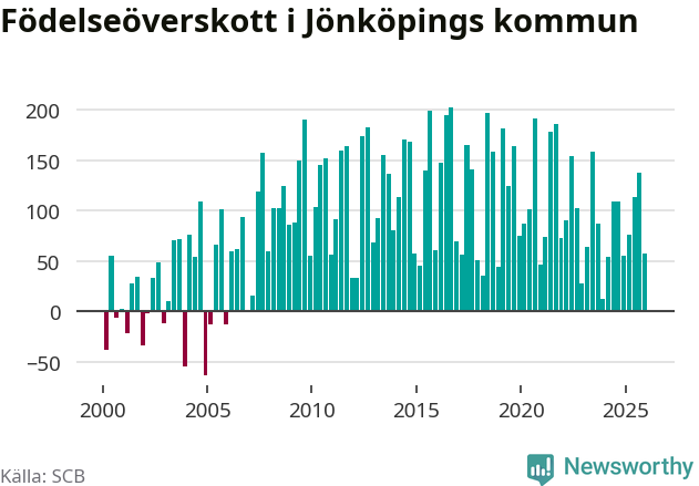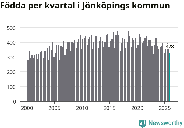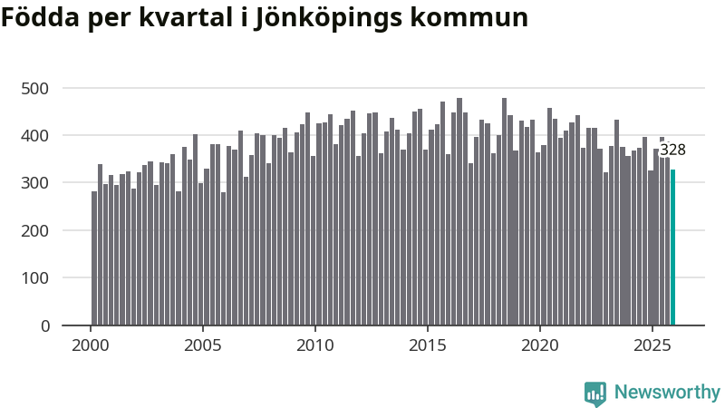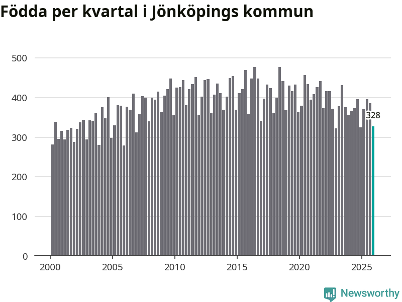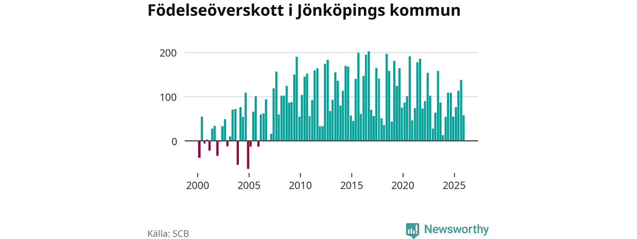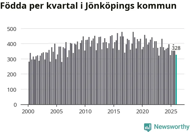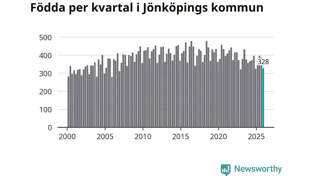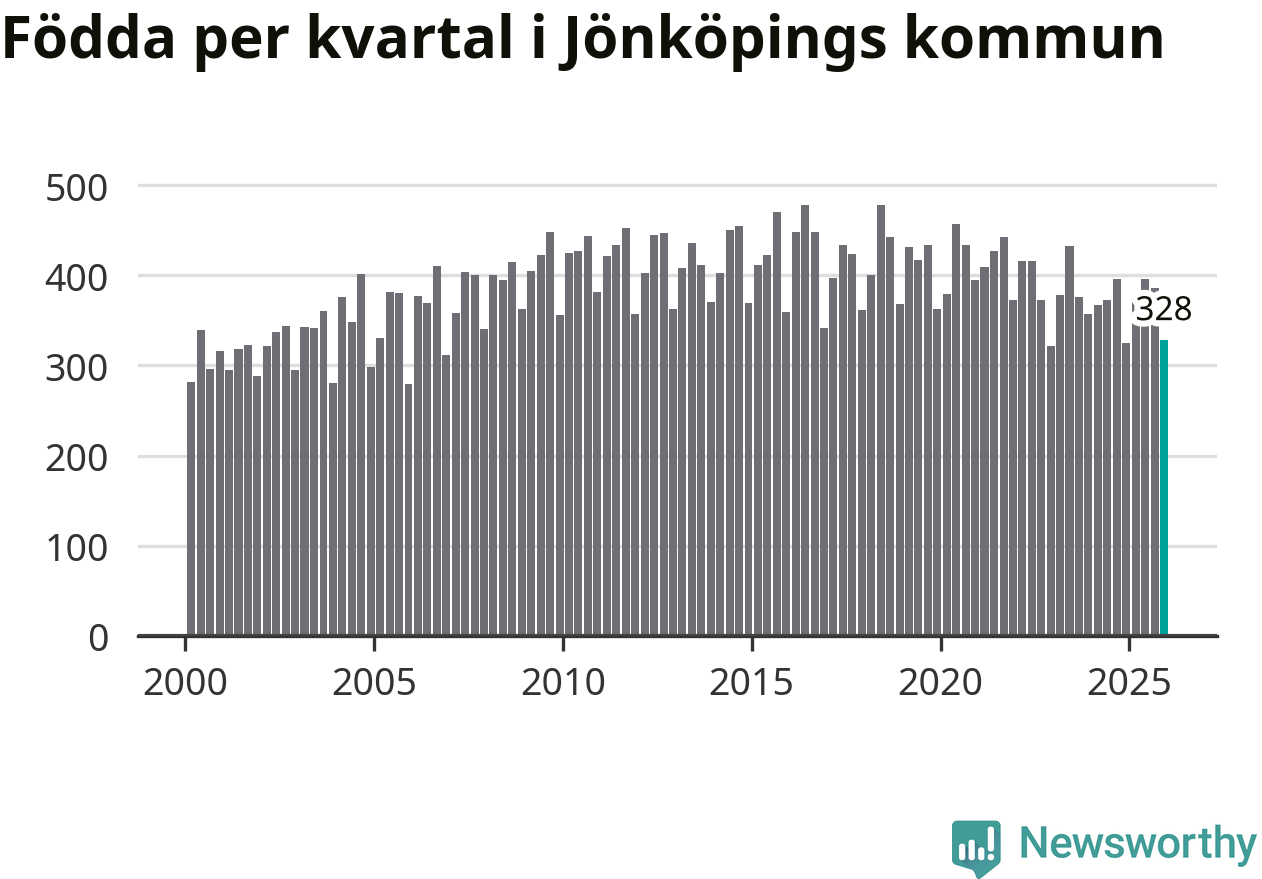 Enligt SCB:s siffror föddes 328 barn i Jönköpings kommun under det senaste kvartalet. Samtidigt avled 270 personer. Jönköping hade alltså ett positivt födelsenetto, vilket kommunen historiskt sett i princip alltid har haft.