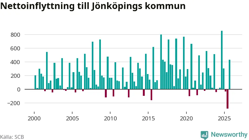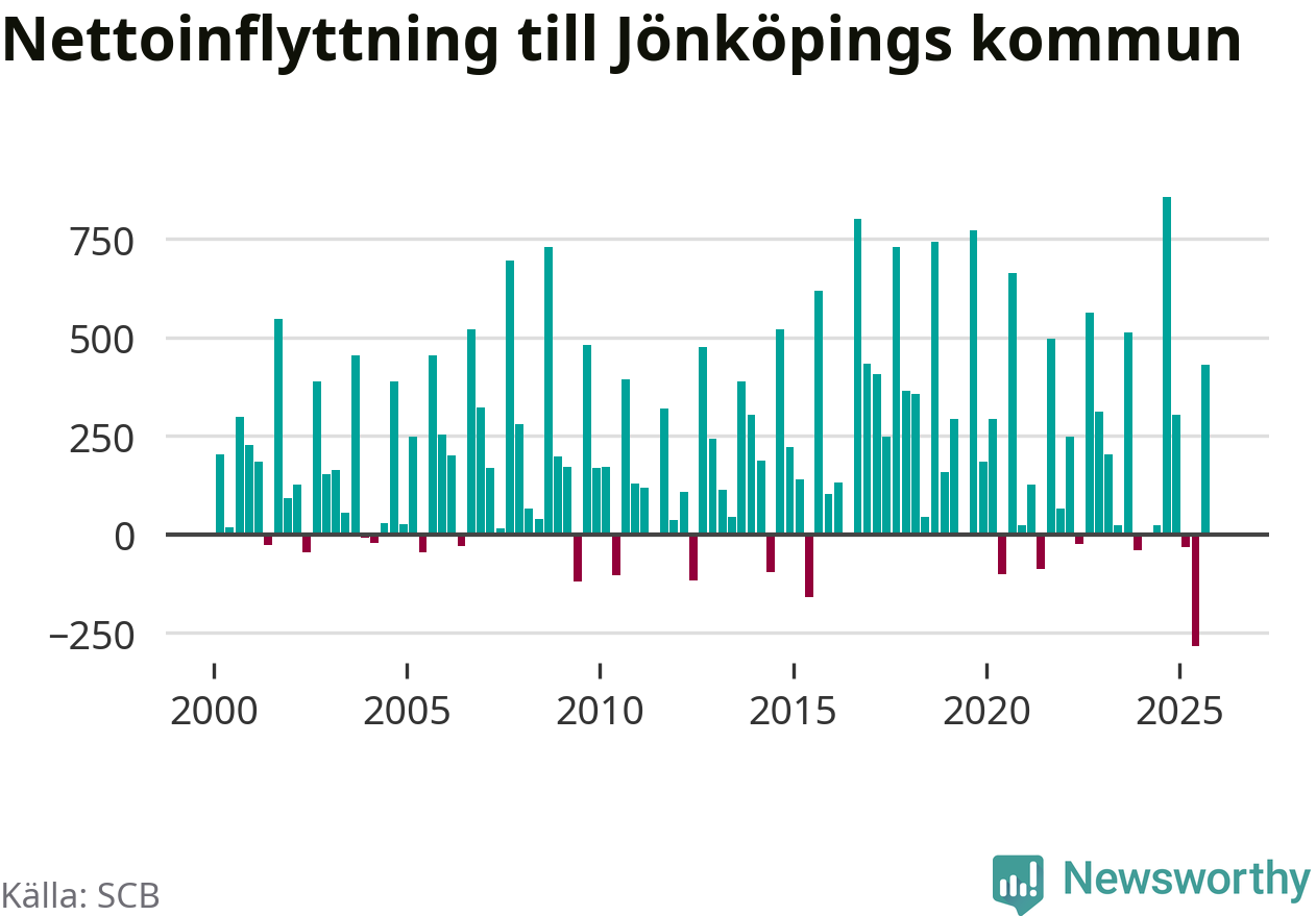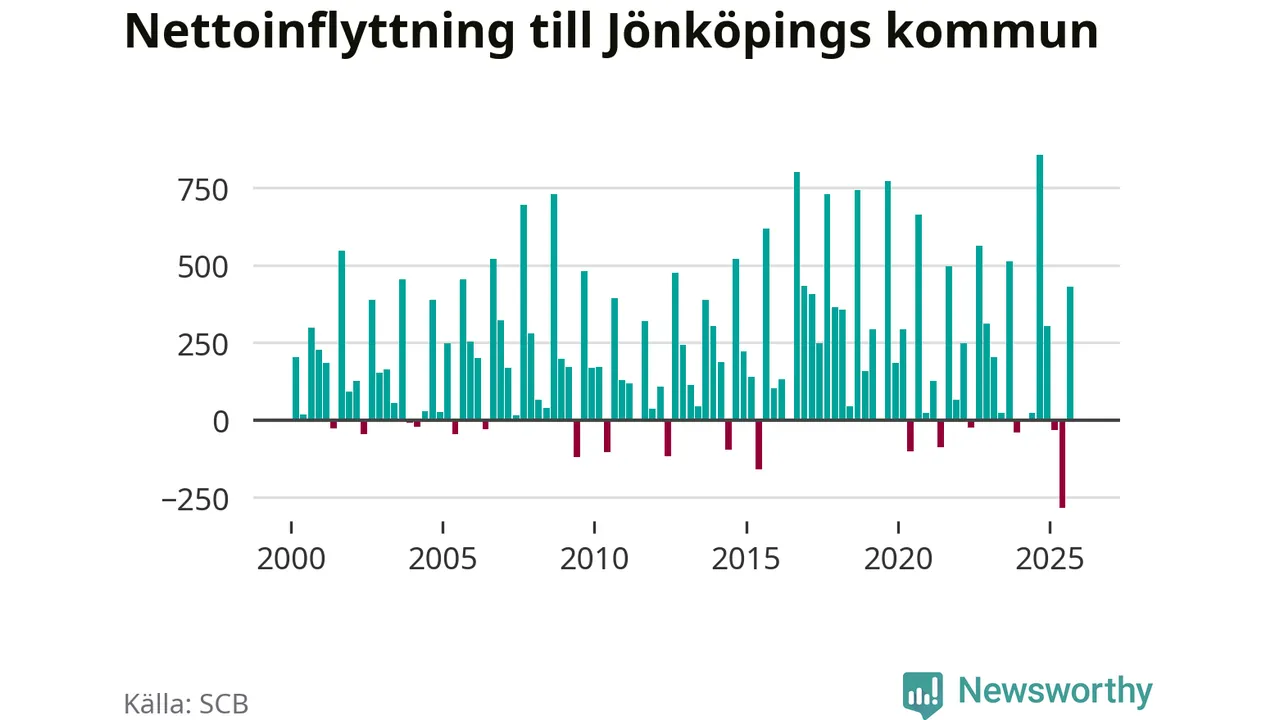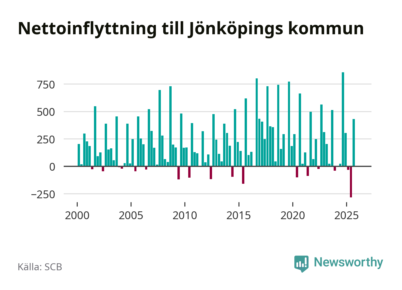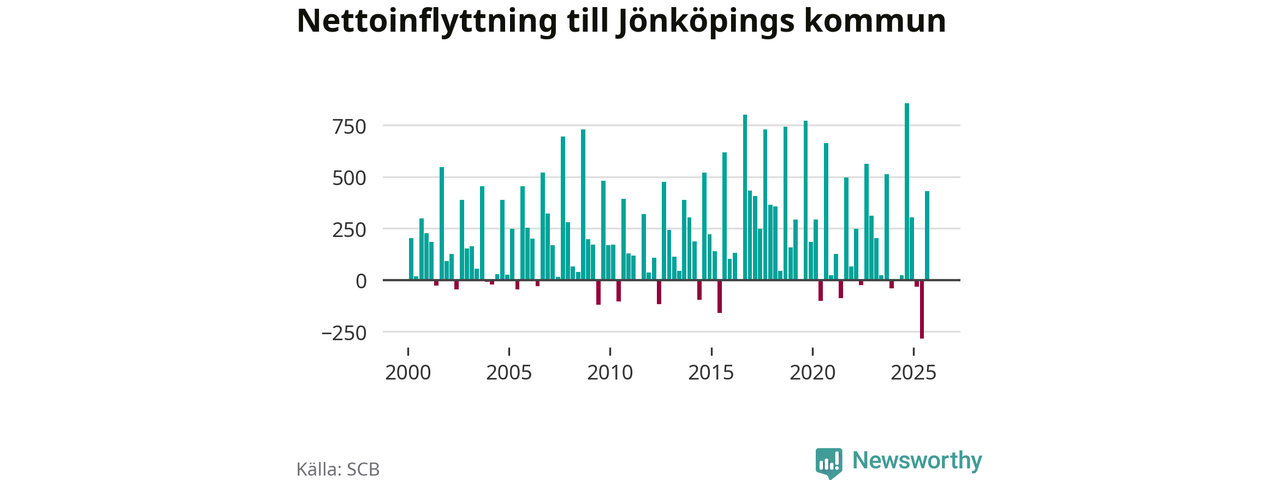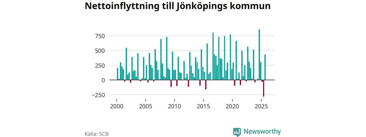 Under fjärde kvartalet 2025 flyttade 1 412 personer till kommunen samtidigt som lika många flyttade därifrån. Sedan seklets början har Jönköpings kommun oftast haft ett positivt flyttnetto.
