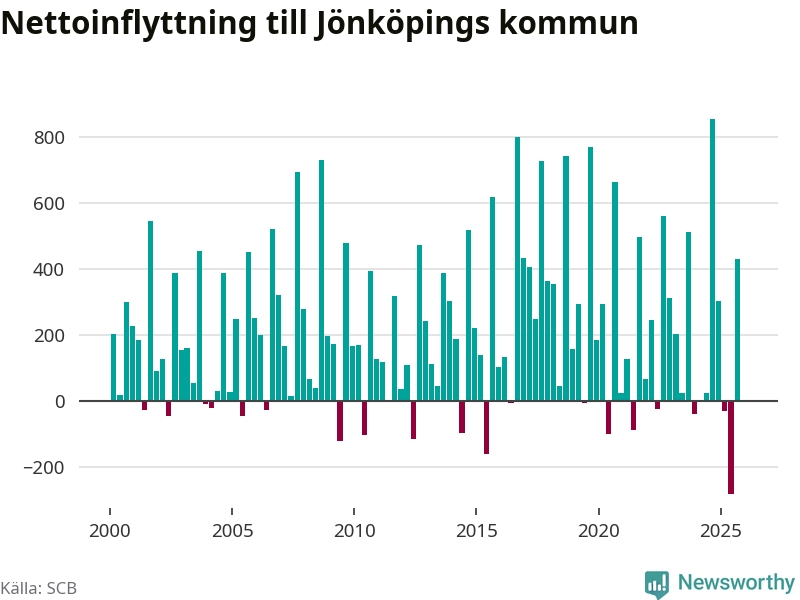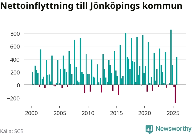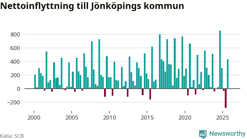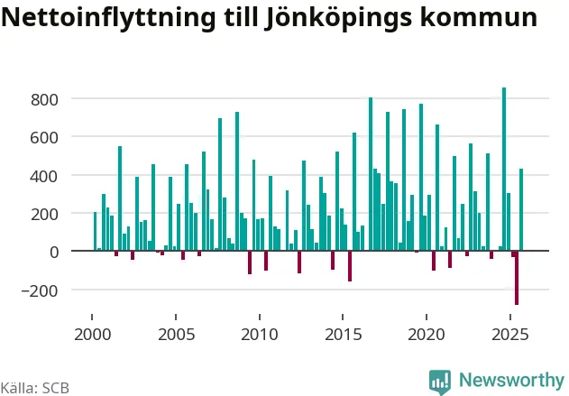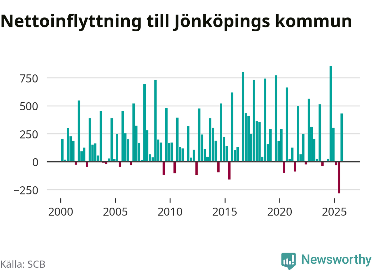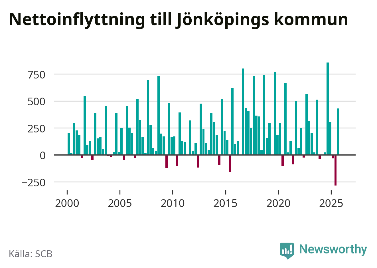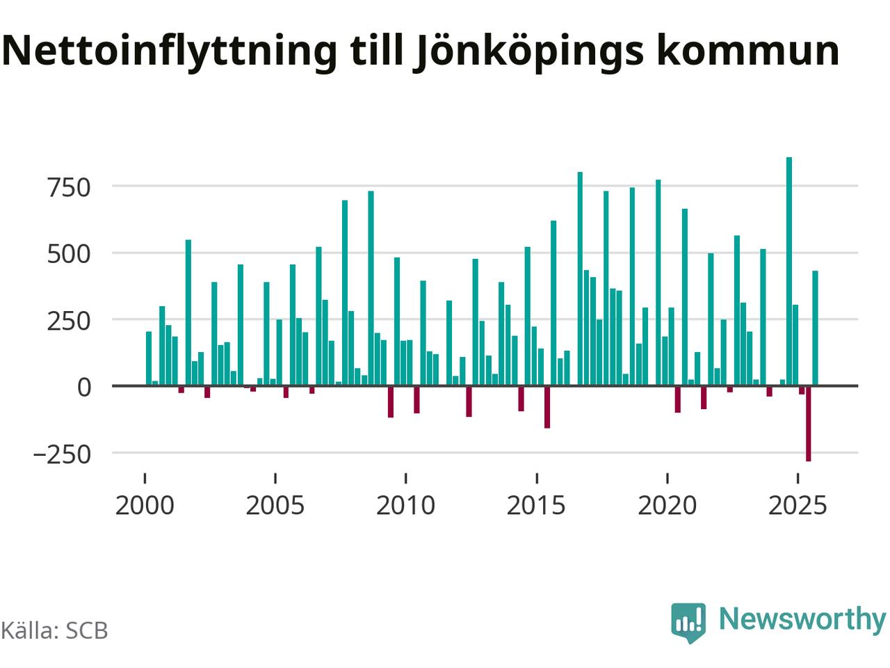 Under fjärde kvartalet 2025 flyttade 1 412 personer till kommunen samtidigt som lika många flyttade därifrån. Sedan seklets början har Jönköpings kommun oftast haft ett positivt flyttnetto.