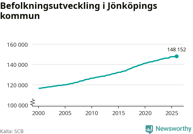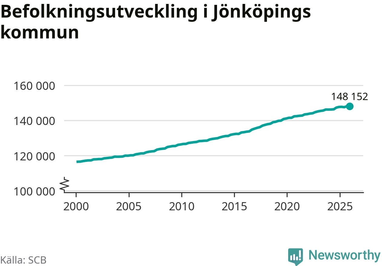 Befolkningen ökade i Jönköpings kommun under det fjärde kvartalet 2025. Den 31 december bodde enligt SCB:s senaste siffror 148 152 personer i kommunen, vilket är 71 fler än i slutet av tredje kvartalet. Folkökningen är den näst största i Jönköpings län procentuellt sett.