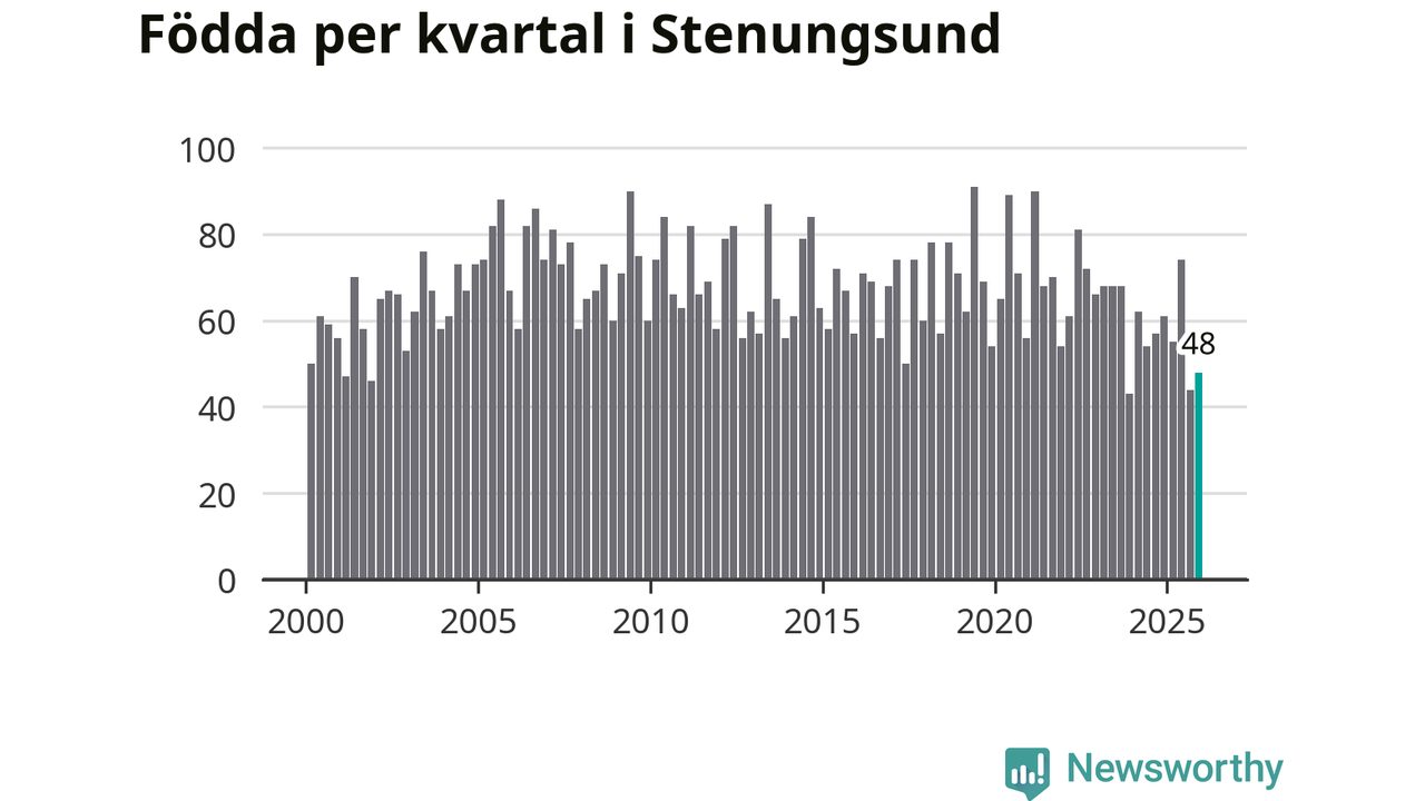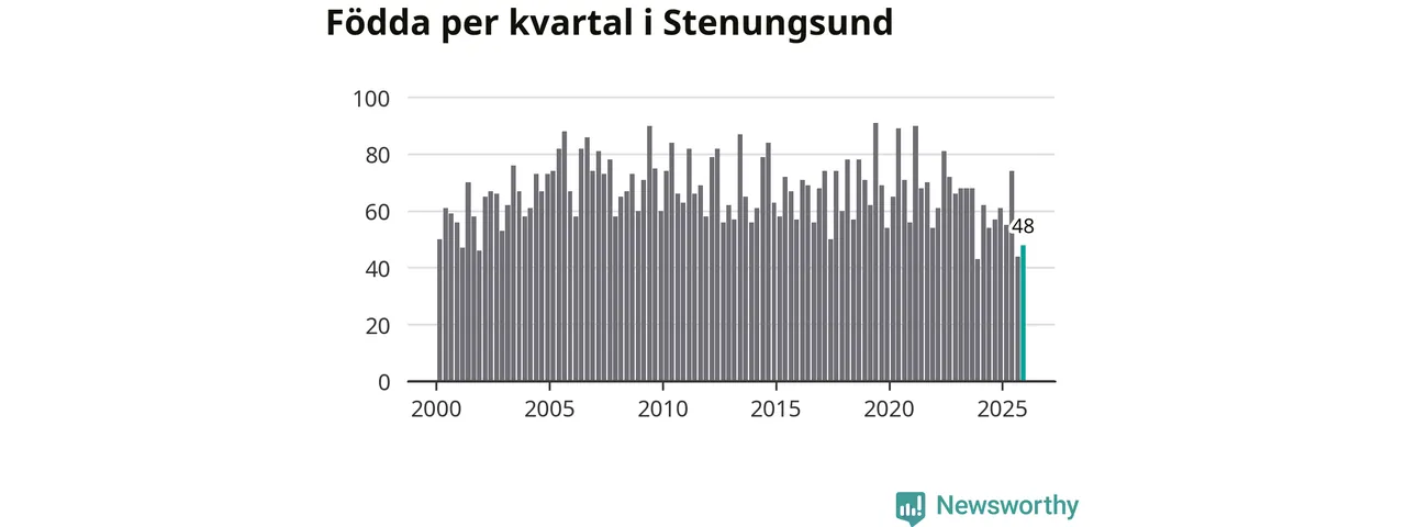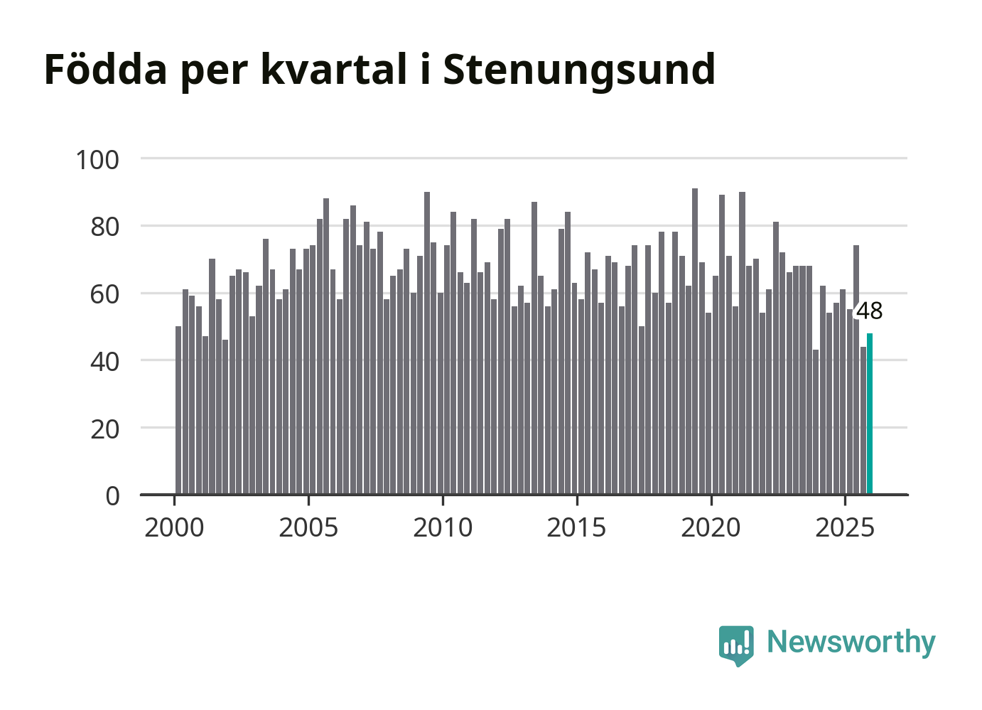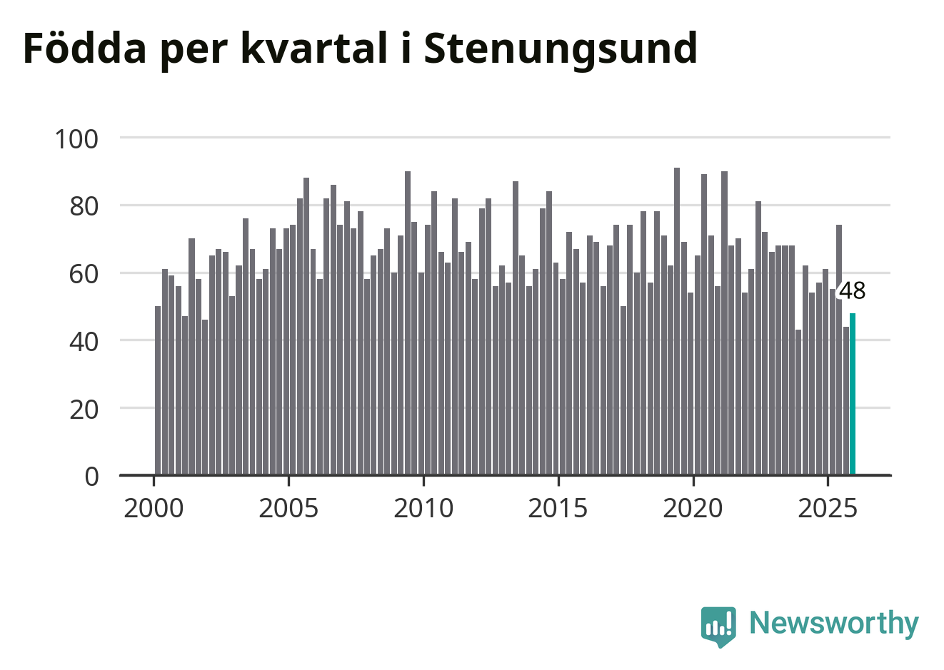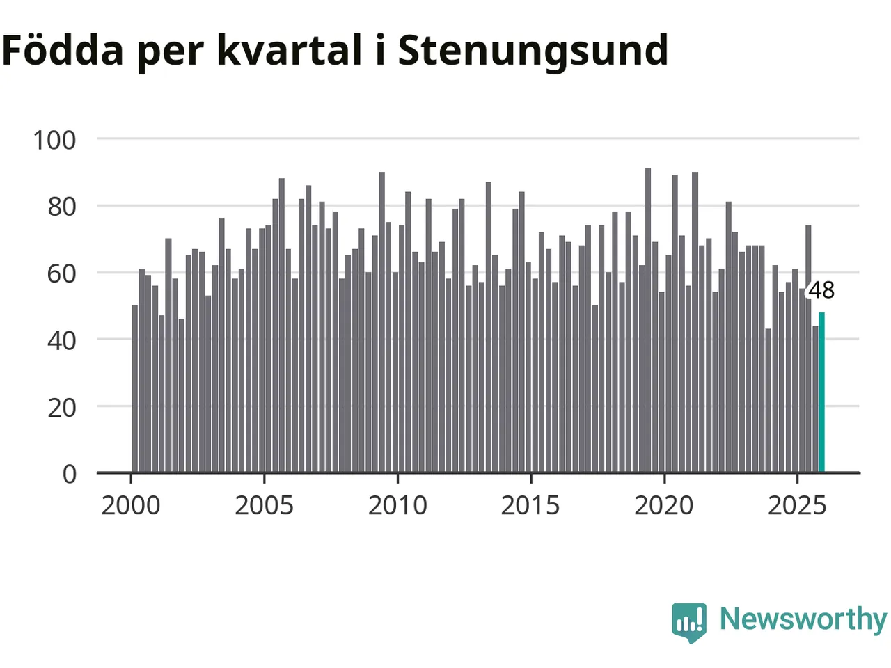 Enligt SCB:s siffror föddes 48 barn i Stenungsund under det senaste kvartalet. Samtidigt avled 52 personer. Skillnaden mellan antal födda och döda är så liten att det inte går att säga om det beror på något annat än SCB:s röjandeskydd. Kommunen har oftast haft positivt födelsenetto tidigare.