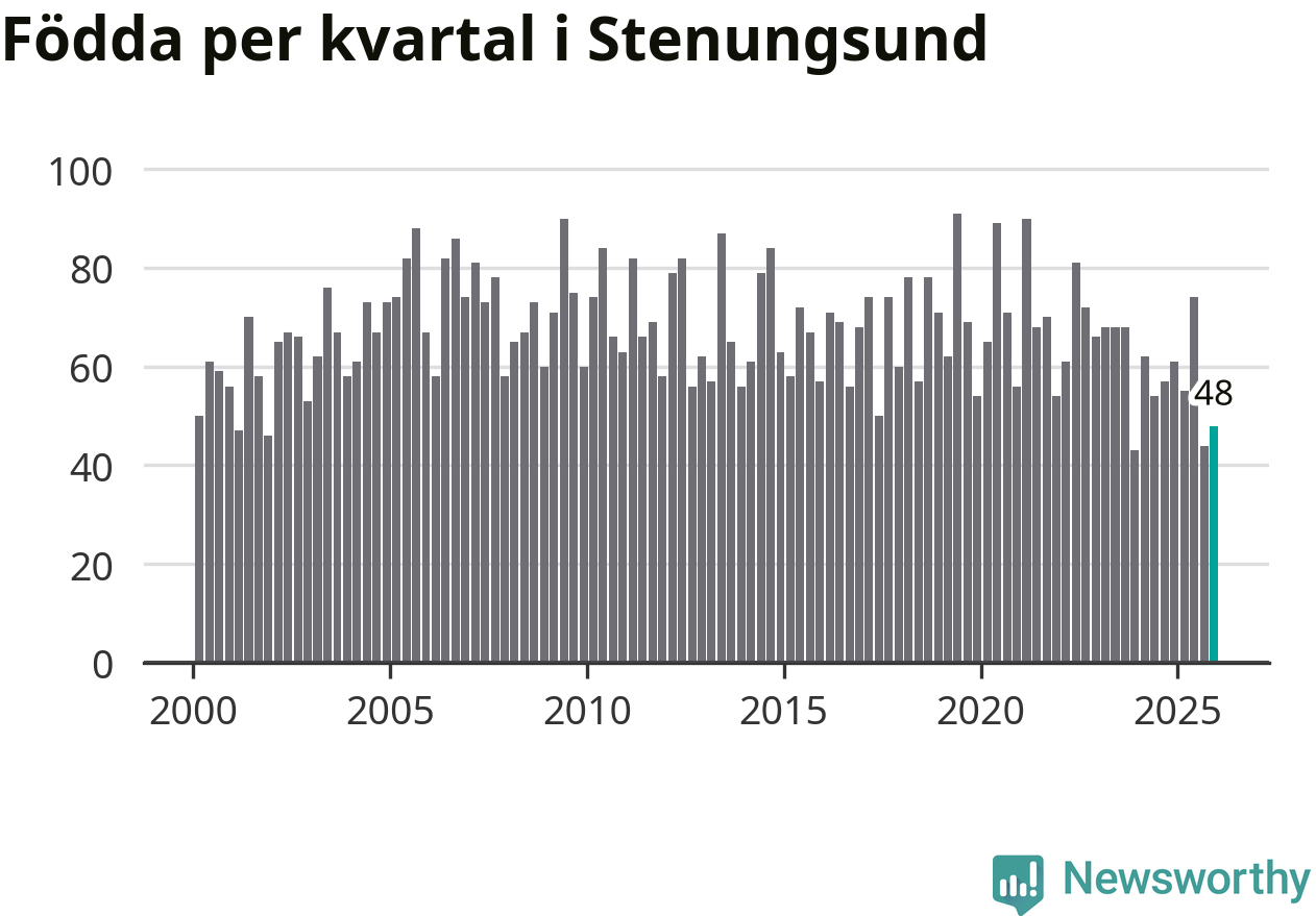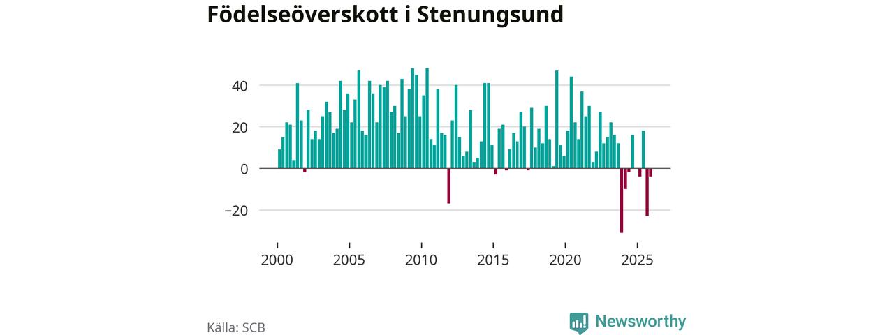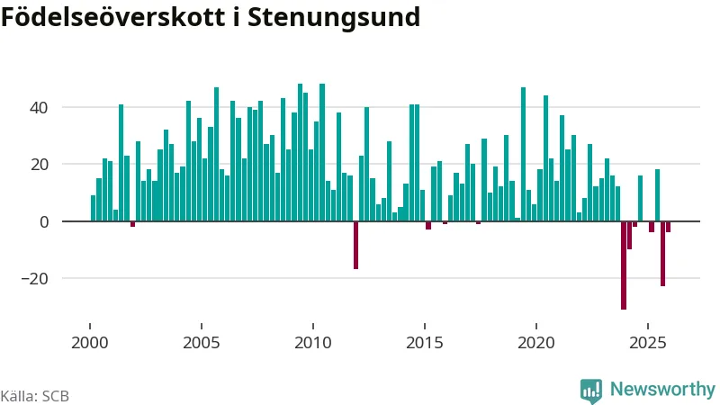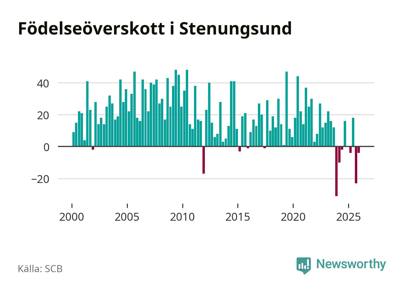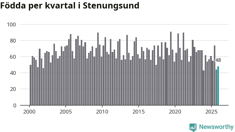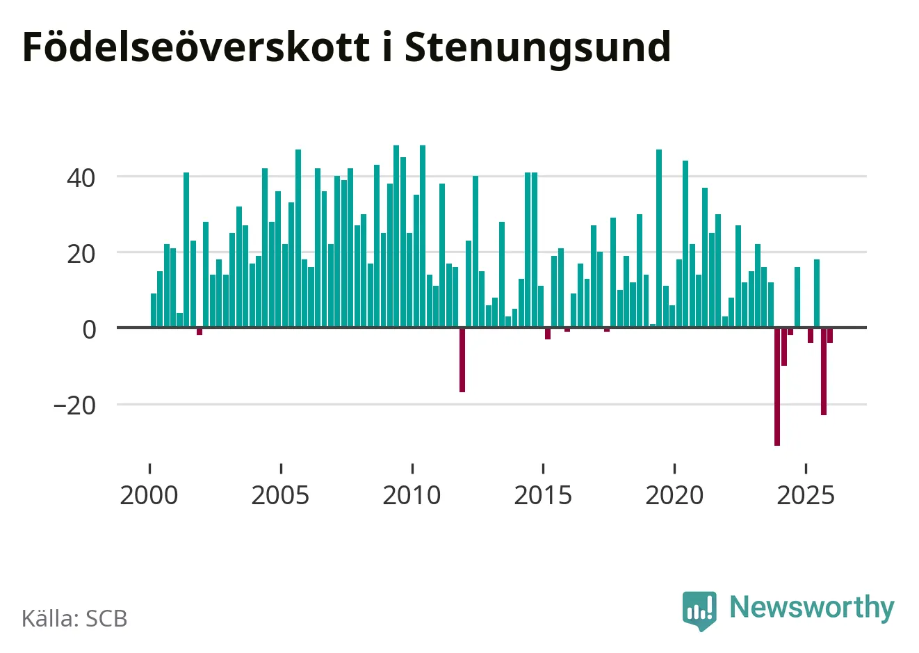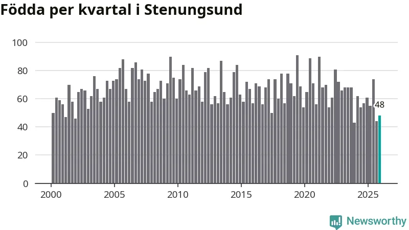 Enligt SCB:s siffror föddes 48 barn i Stenungsund under det senaste kvartalet. Samtidigt avled 52 personer. Skillnaden mellan antal födda och döda är så liten att det inte går att säga om det beror på något annat än SCB:s röjandeskydd. Kommunen har oftast haft positivt födelsenetto tidigare.