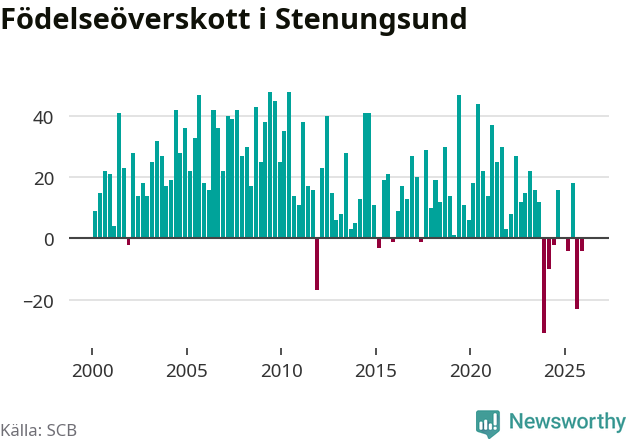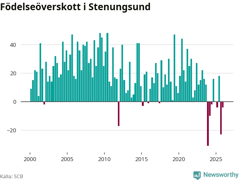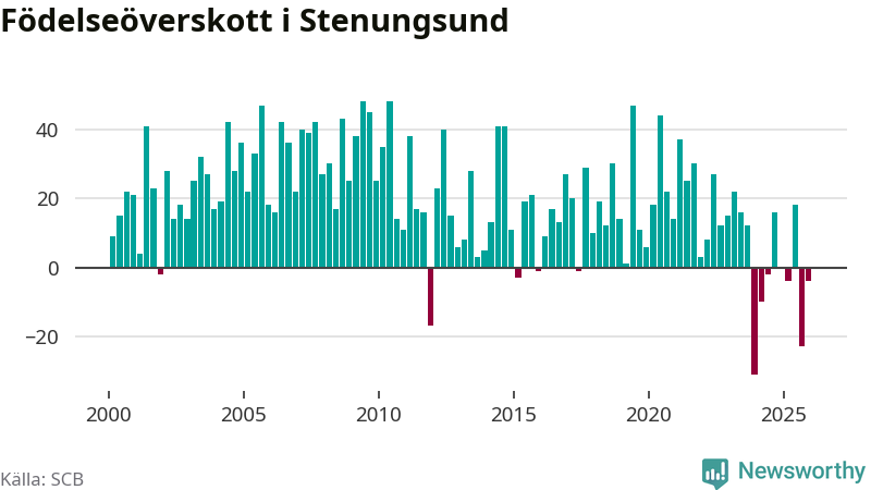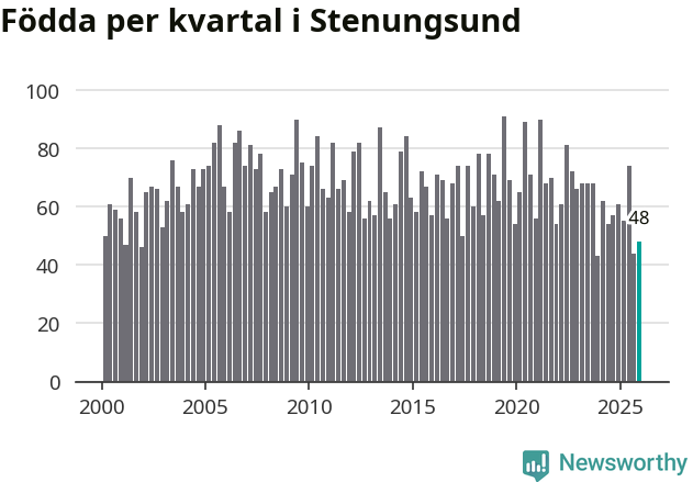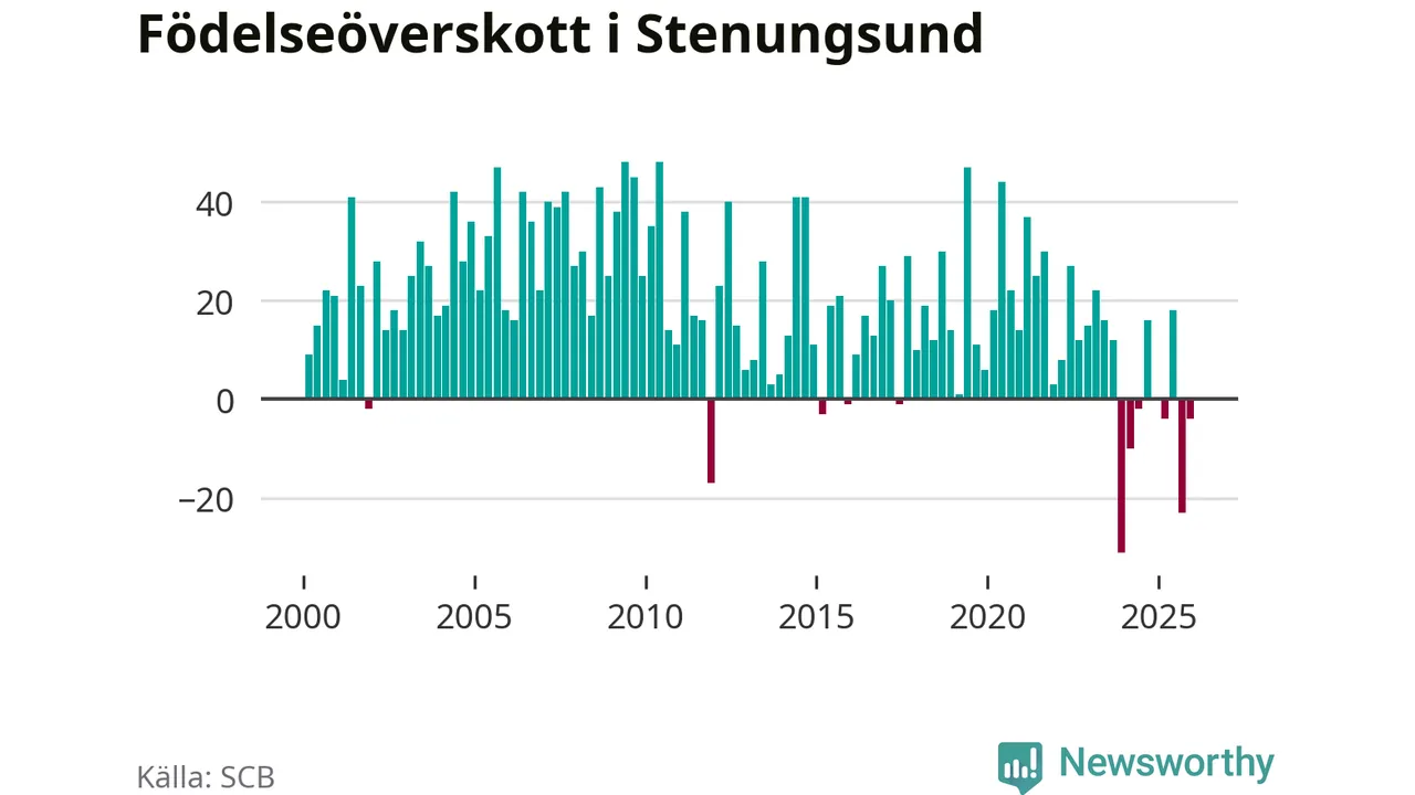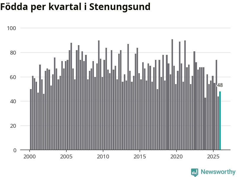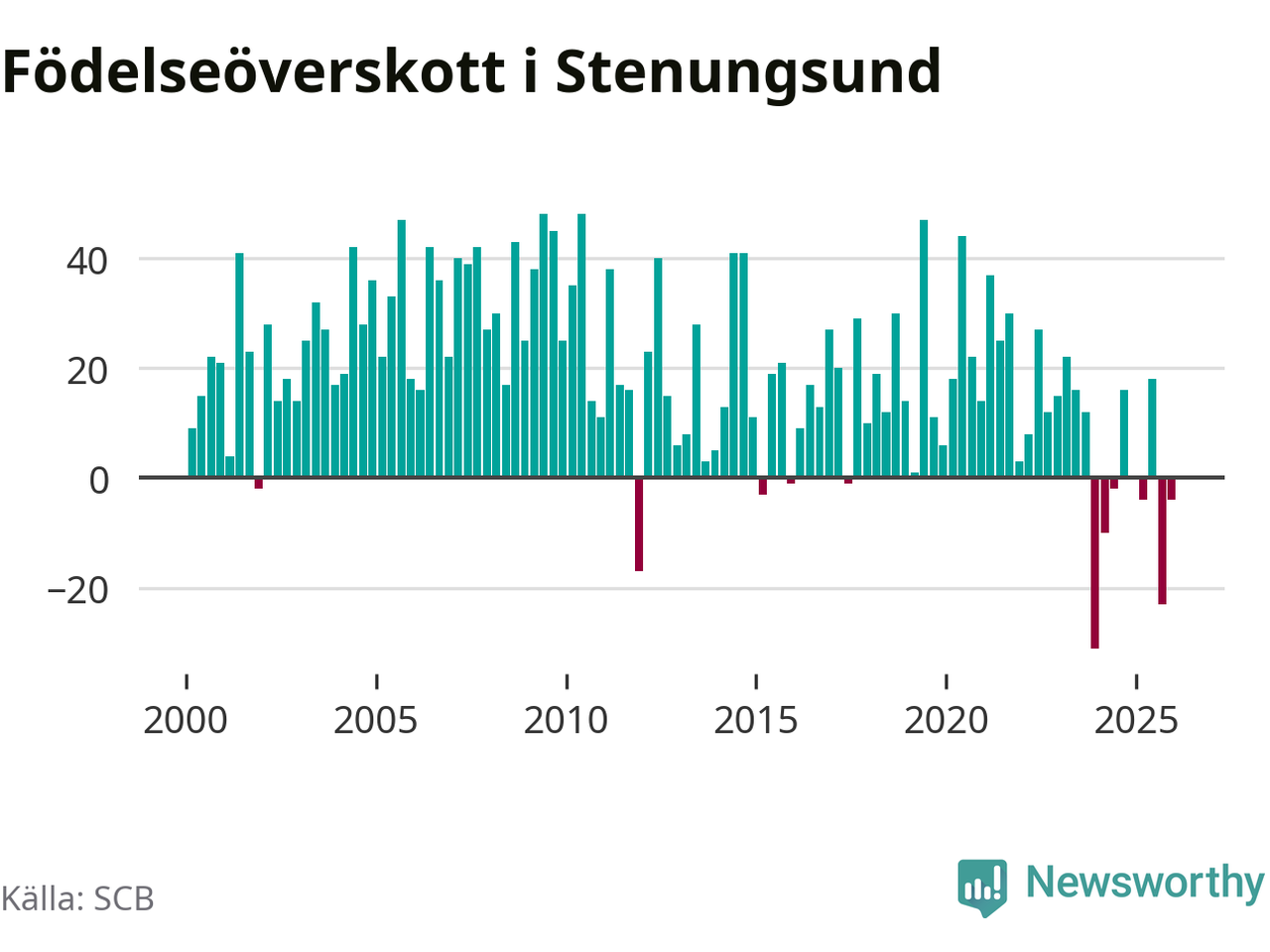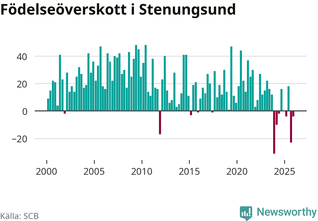 Enligt SCB:s siffror föddes 48 barn i Stenungsund under det senaste kvartalet. Samtidigt avled 52 personer. Skillnaden mellan antal födda och döda är så liten att det inte går att säga om det beror på något annat än SCB:s röjandeskydd. Kommunen har oftast haft positivt födelsenetto tidigare.