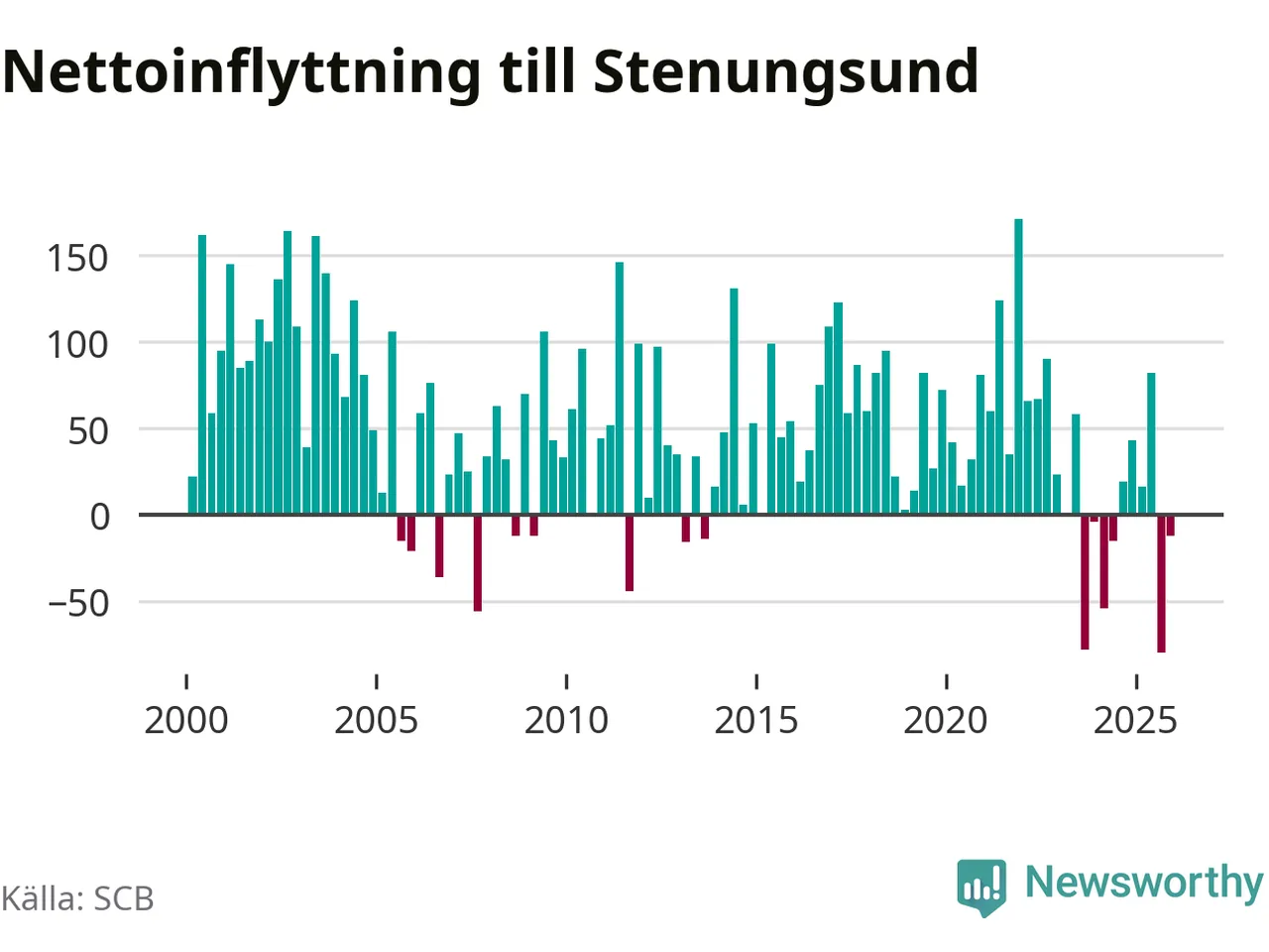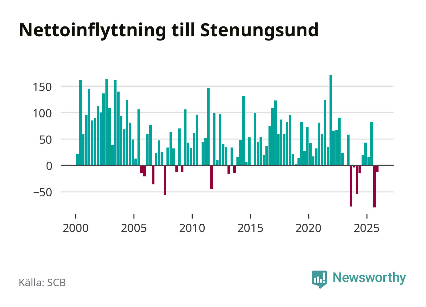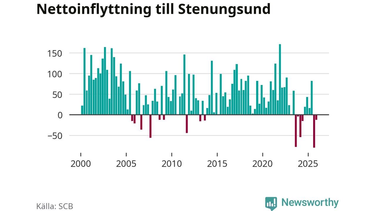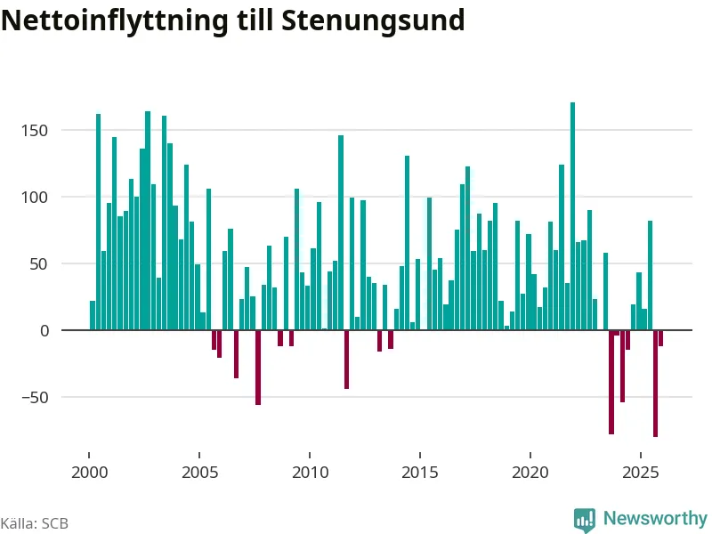 Under fjärde kvartalet 2025 flyttade 337 personer till kommunen medan 349 personer flyttade därifrån. Sedan seklets början har Stenungsund haft ett positivt flyttnetto under nästan alla kvartal.
