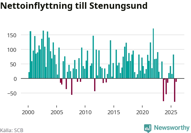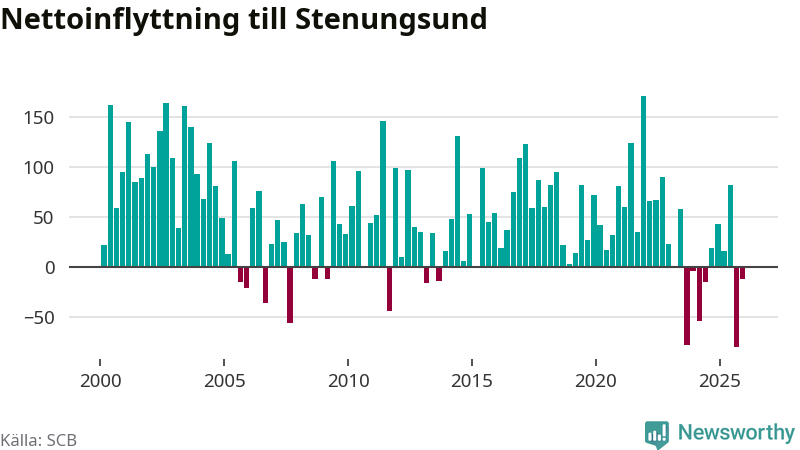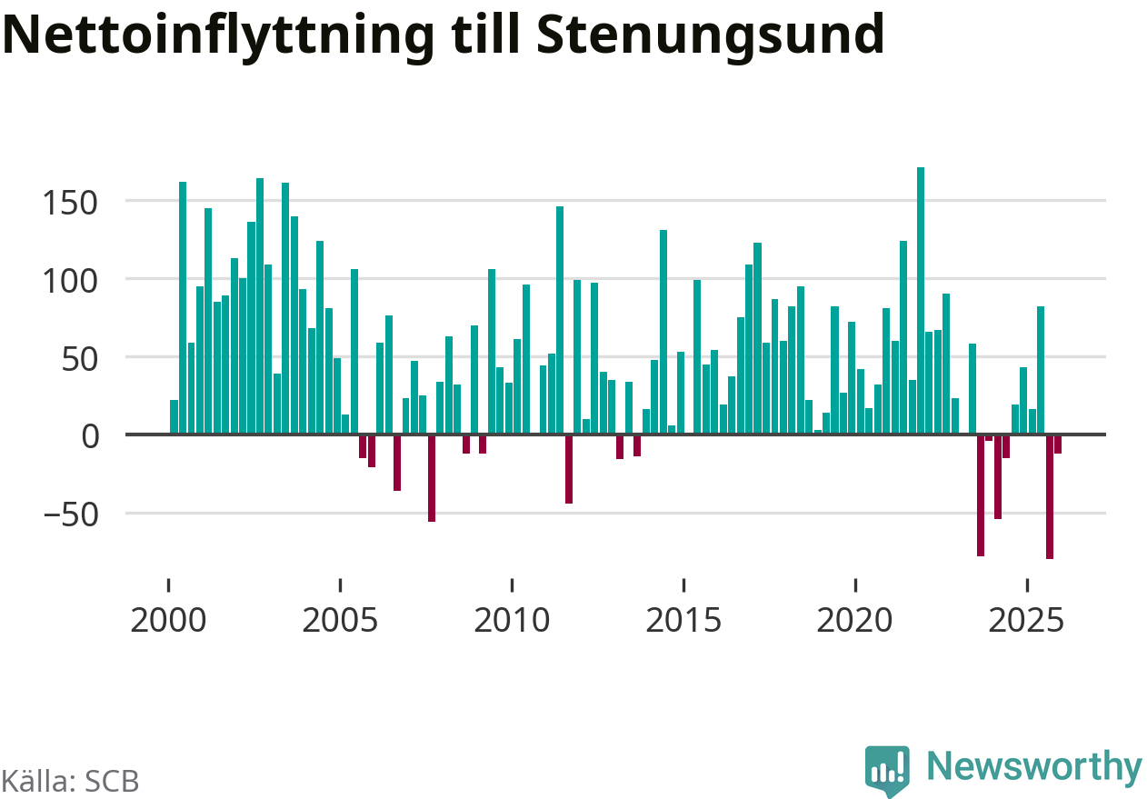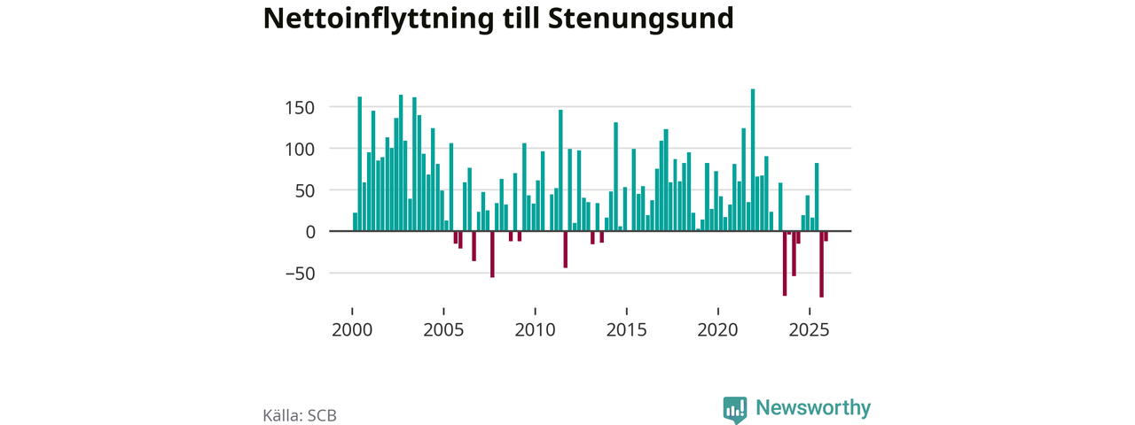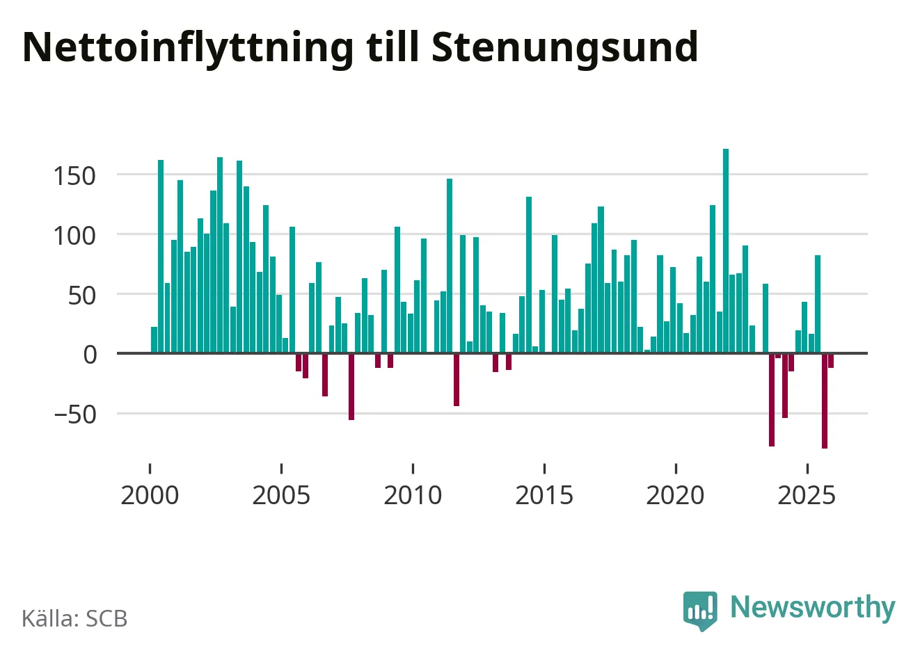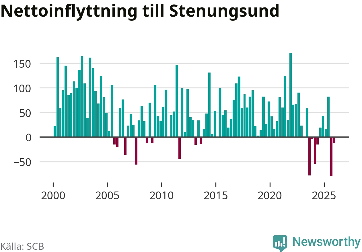 Under fjärde kvartalet 2025 flyttade 337 personer till kommunen medan 349 personer flyttade därifrån. Sedan seklets början har Stenungsund haft ett positivt flyttnetto under nästan alla kvartal.