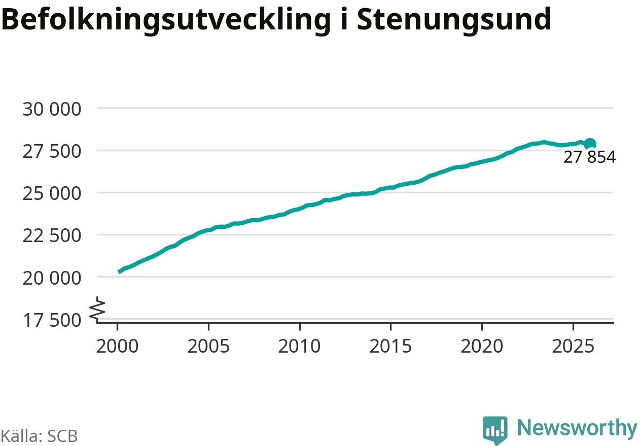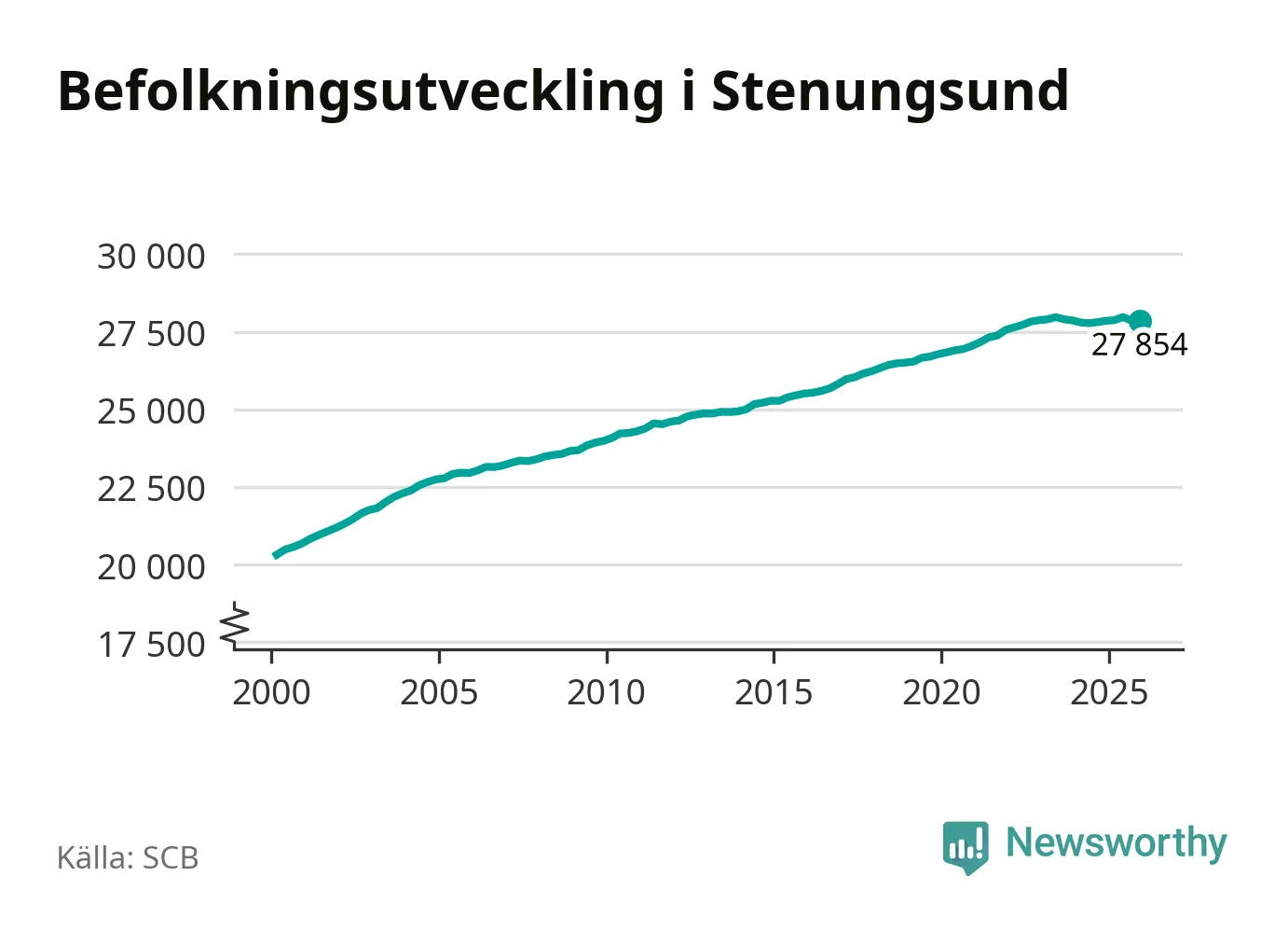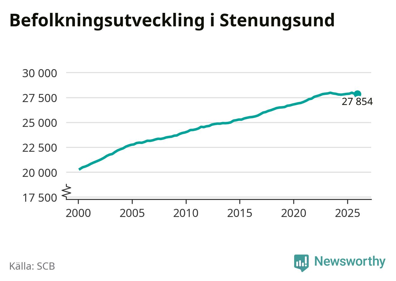 Den 31 december bodde 27 854 personer i Stenungsunds kommun, enligt SCB:s senaste siffror. Det är något färre än i slutet av tredje kvartalet, men skillnaden är så liten att den lika gärna kan bero på den lilla justering som SCB gör av siffrorna för att skydda enskilda individers identitet.