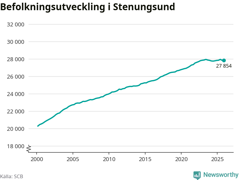Jämfört med ett år sedan är befolkningen i princip lika stor i Stenungsund. Sedan millennieskiftet har folkmängden ökat med runt 7 540 personer, eller 37 procent.