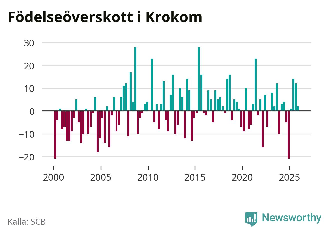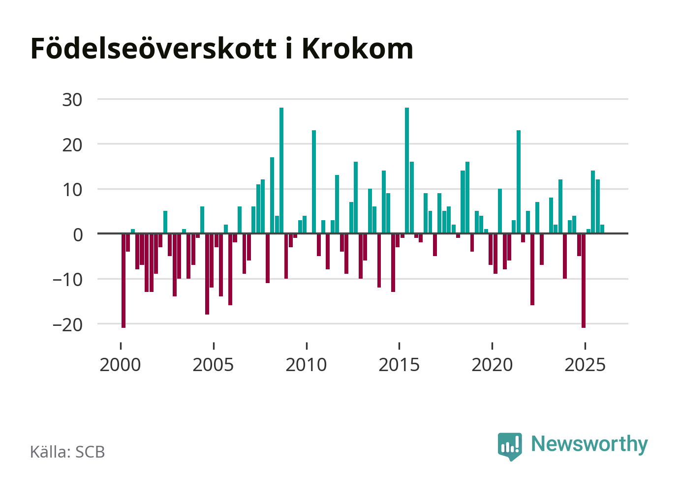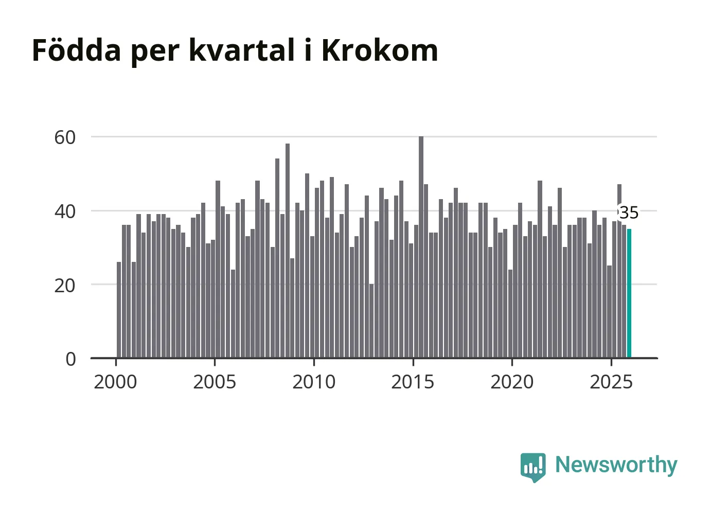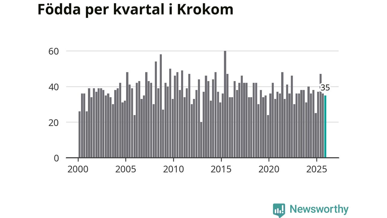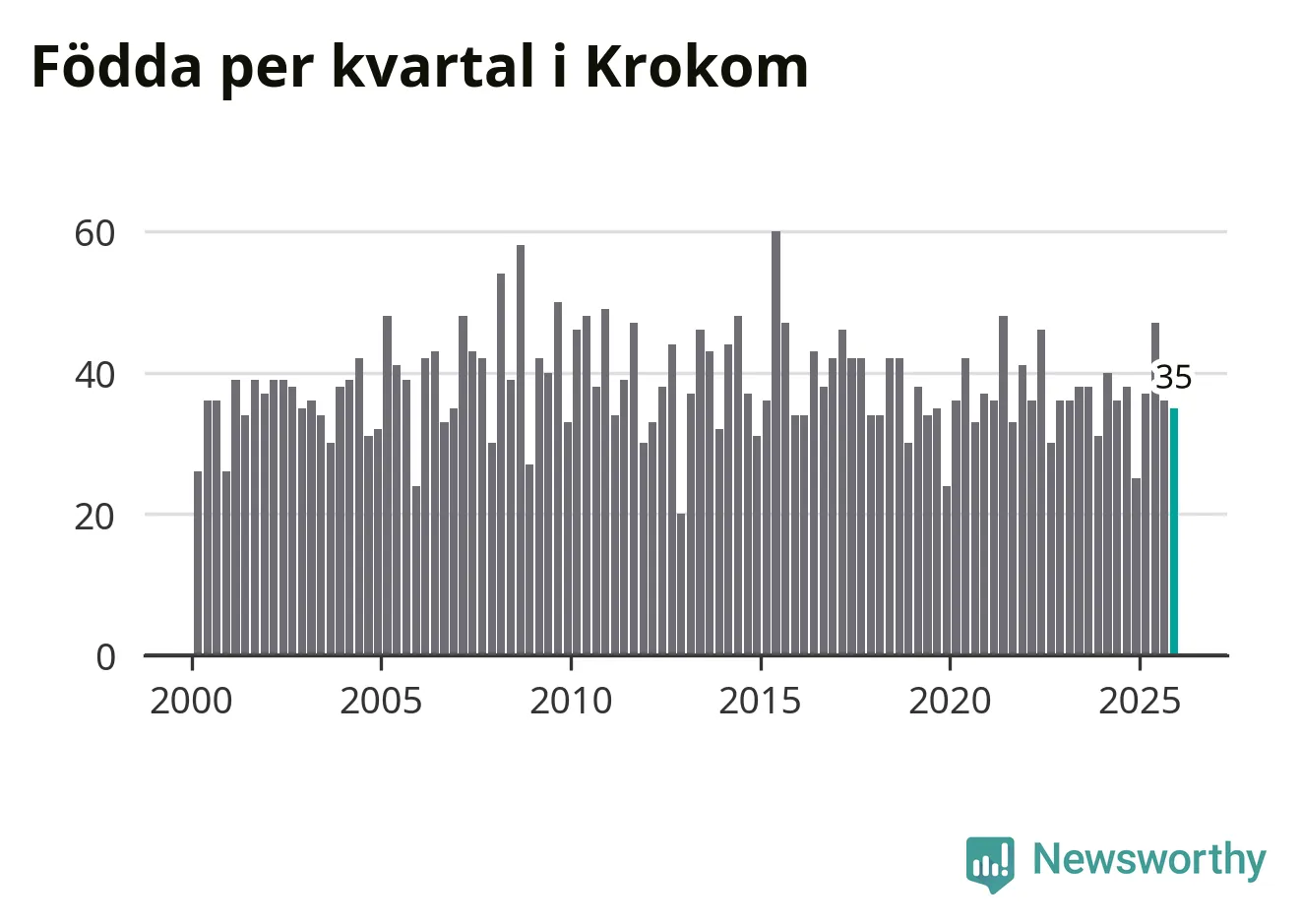 Enligt SCB:s siffror föddes 35 barn i Krokom under det senaste kvartalet. Samtidigt avled 33 personer. Skillnaden mellan antal födda och döda är så liten att det inte går att säga om det beror på något annat än SCB:s röjandeskydd. Kommunen har oftast haft positivt födelsenetto tidigare.