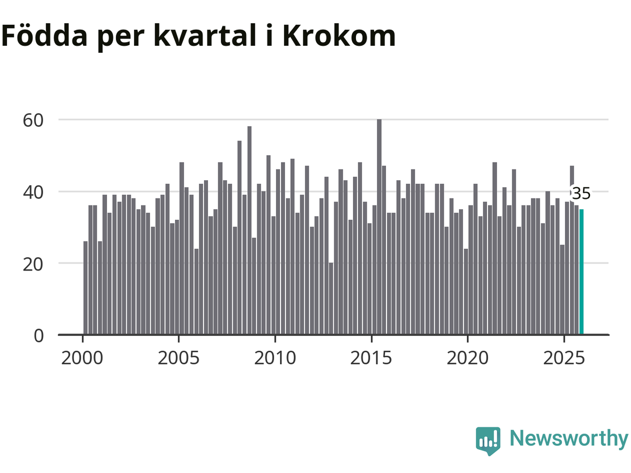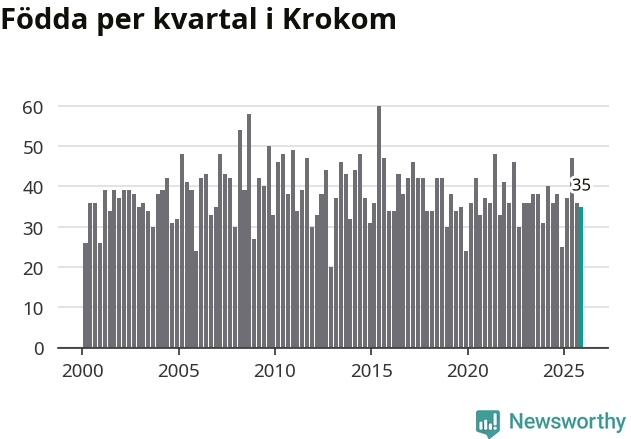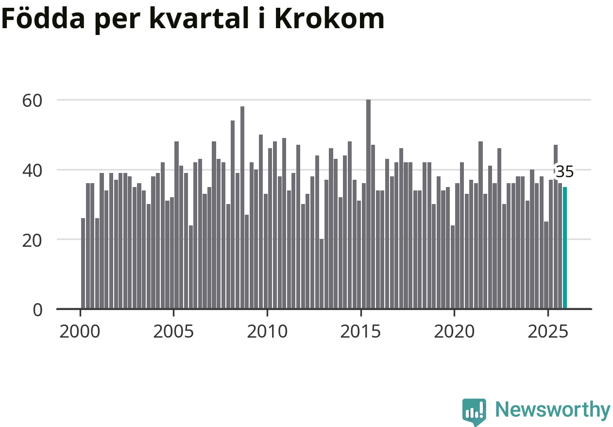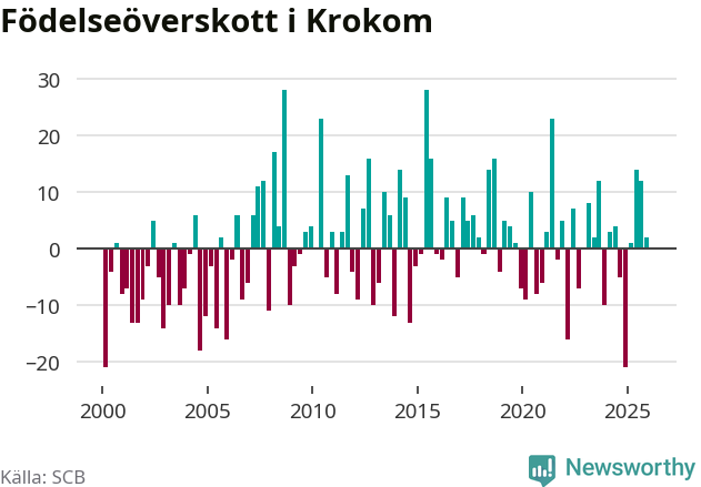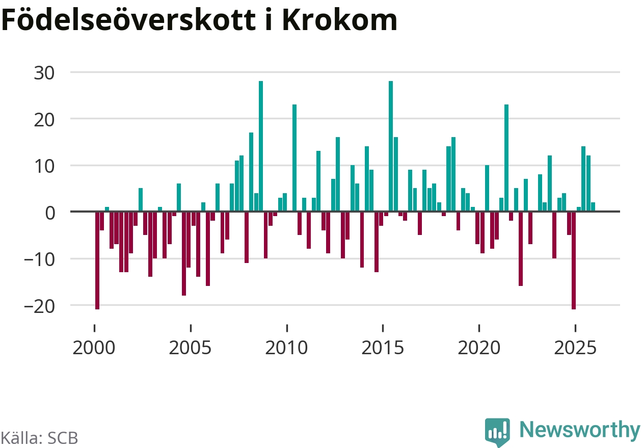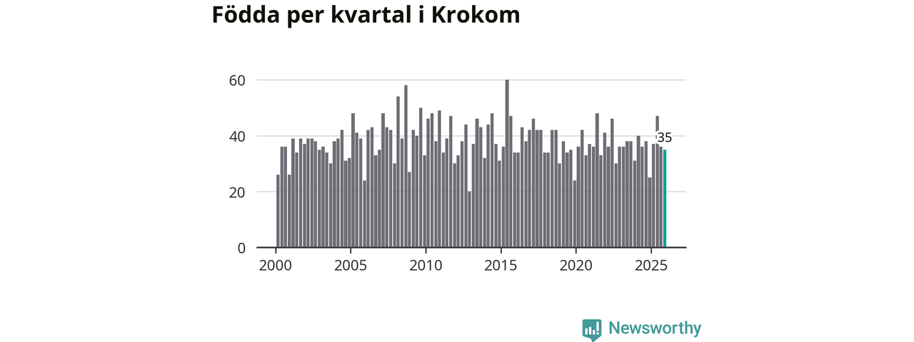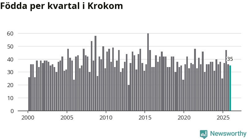 Enligt SCB:s siffror föddes 35 barn i Krokom under det senaste kvartalet. Samtidigt avled 33 personer. Skillnaden mellan antal födda och döda är så liten att det inte går att säga om det beror på något annat än SCB:s röjandeskydd. Kommunen har oftast haft positivt födelsenetto tidigare.