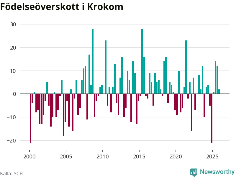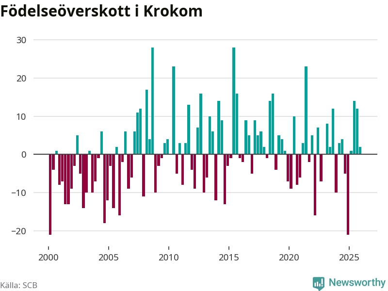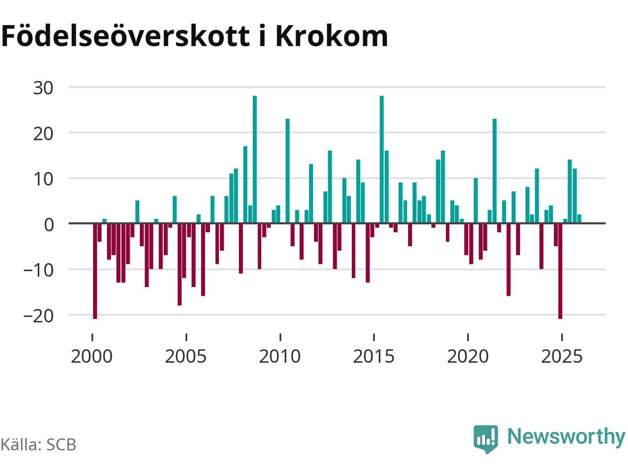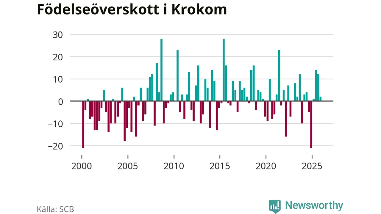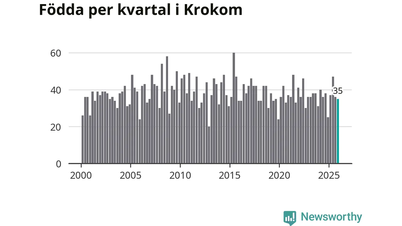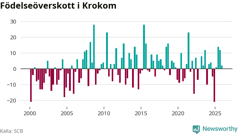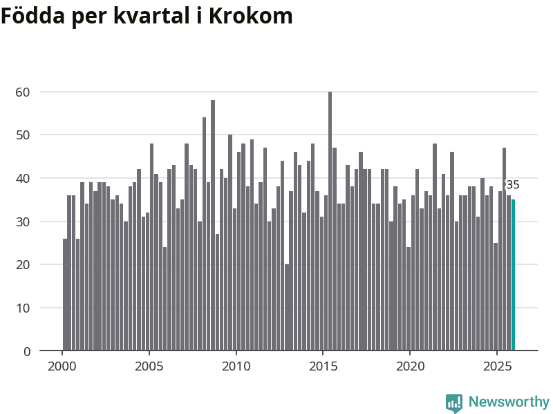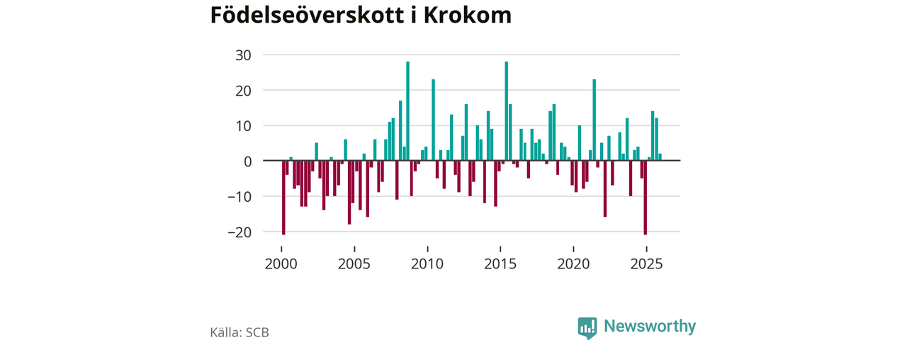Enligt SCB:s siffror föddes 35 barn i Krokom under det senaste kvartalet. Samtidigt avled 33 personer. Skillnaden mellan antal födda och döda är så liten att det inte går att säga om det beror på något annat än SCB:s röjandeskydd. Kommunen har oftast haft positivt födelsenetto tidigare.