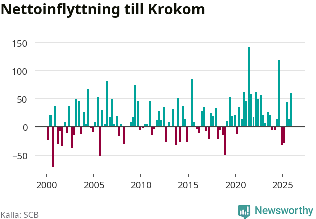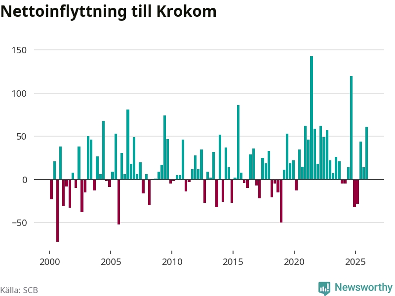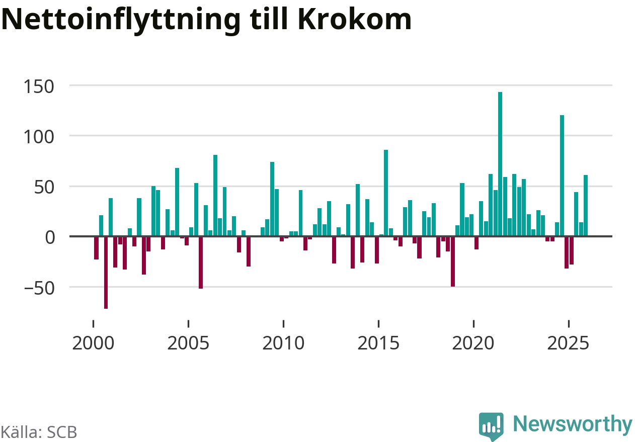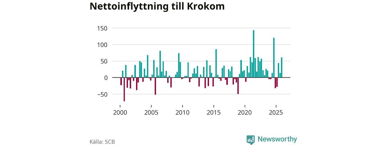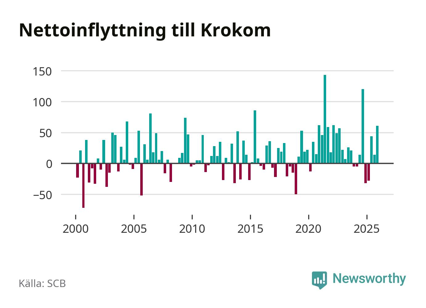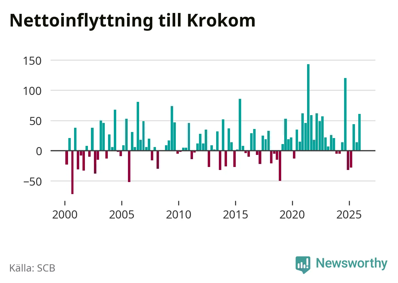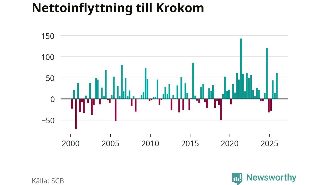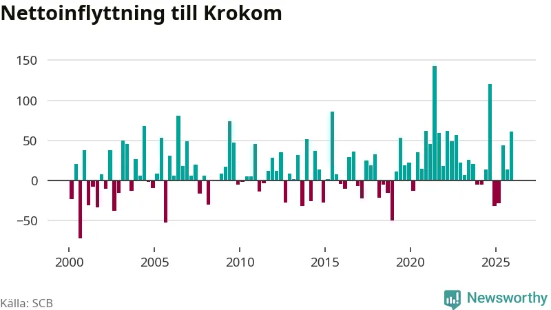 Under fjärde kvartalet 2025 flyttade 263 personer till kommunen medan 202 personer flyttade därifrån. Sedan seklets början har Krokom oftast haft ett positivt flyttnetto, inklusive det senaste kvartalet.