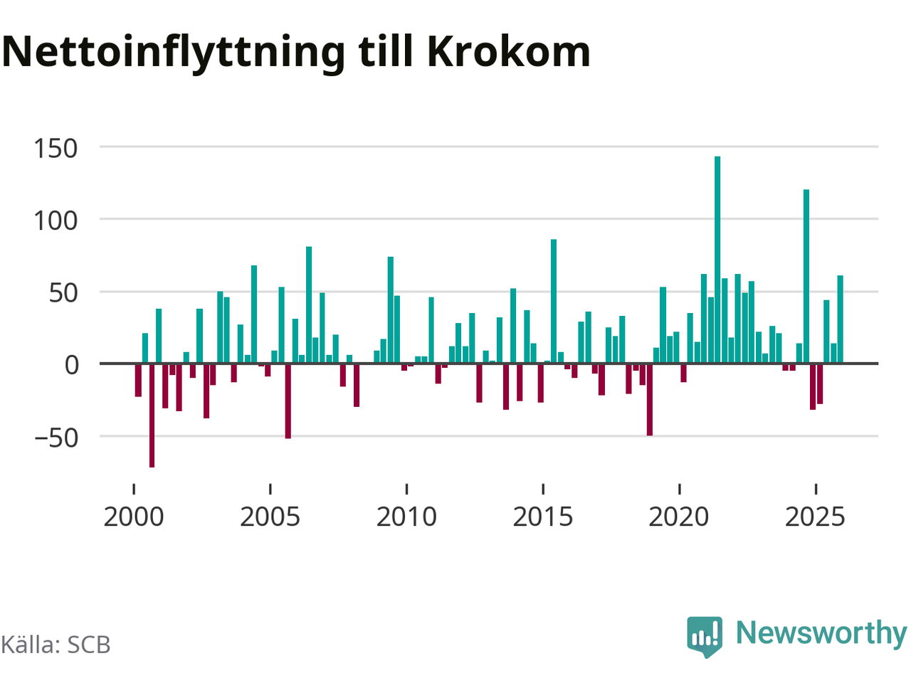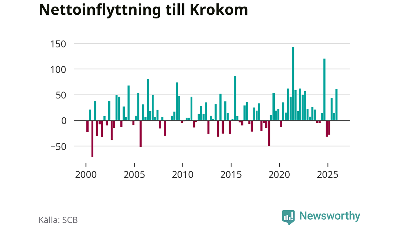 Fler flyttade till än från Krokoms kommun. Befolkningen ökade under det fjärde kvartalet 2025. Det visar nya siffror från SCB.