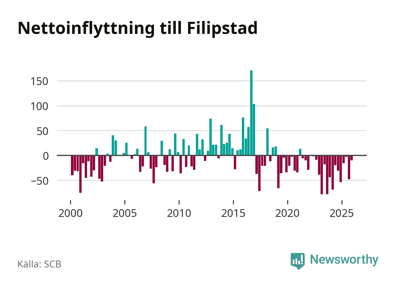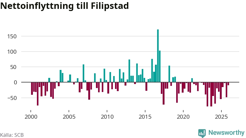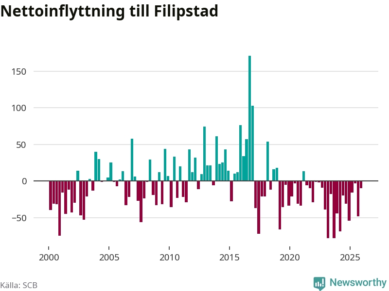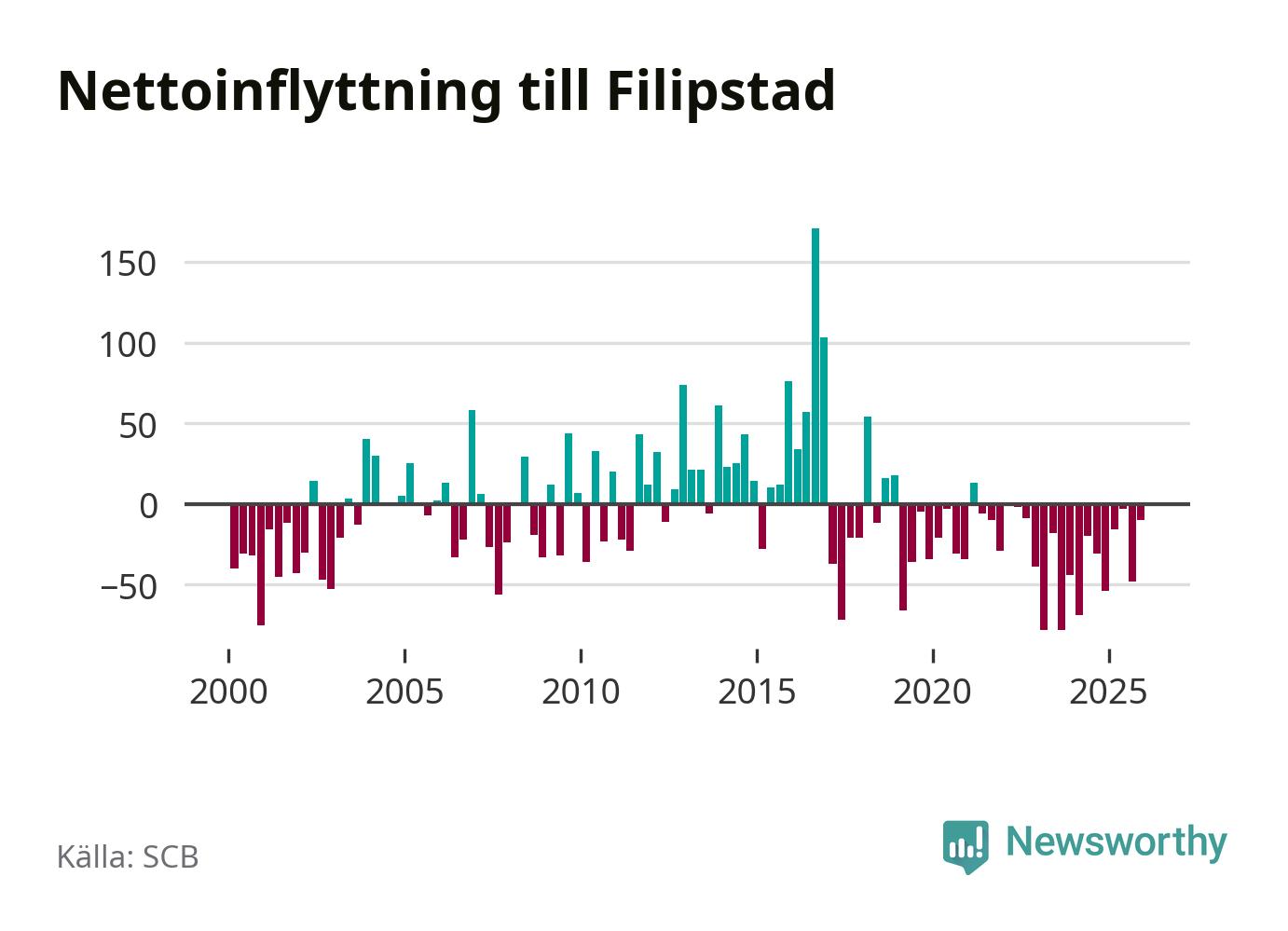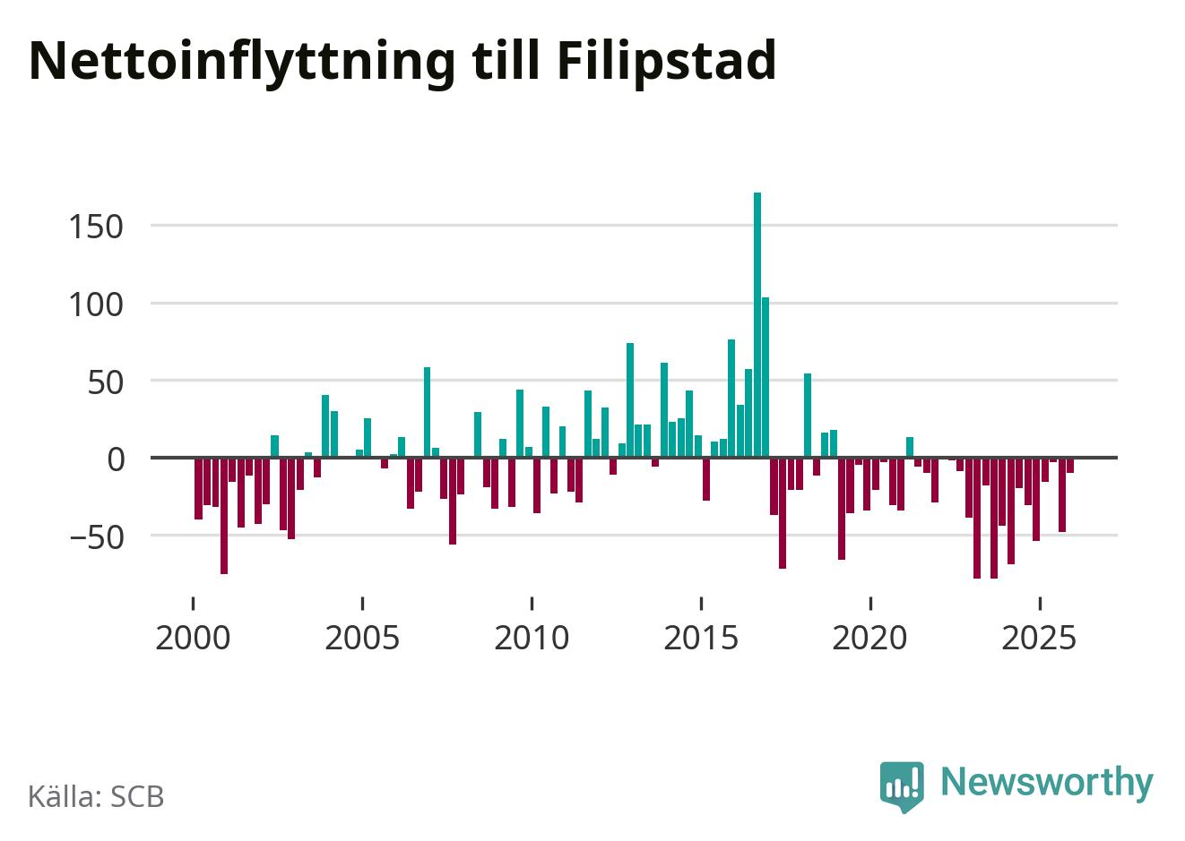 Under fjärde kvartalet 2025 flyttade 100 personer till kommunen medan 110 personer flyttade därifrån. Sedan seklets början har Filipstad oftast haft ett negativt flyttnetto.